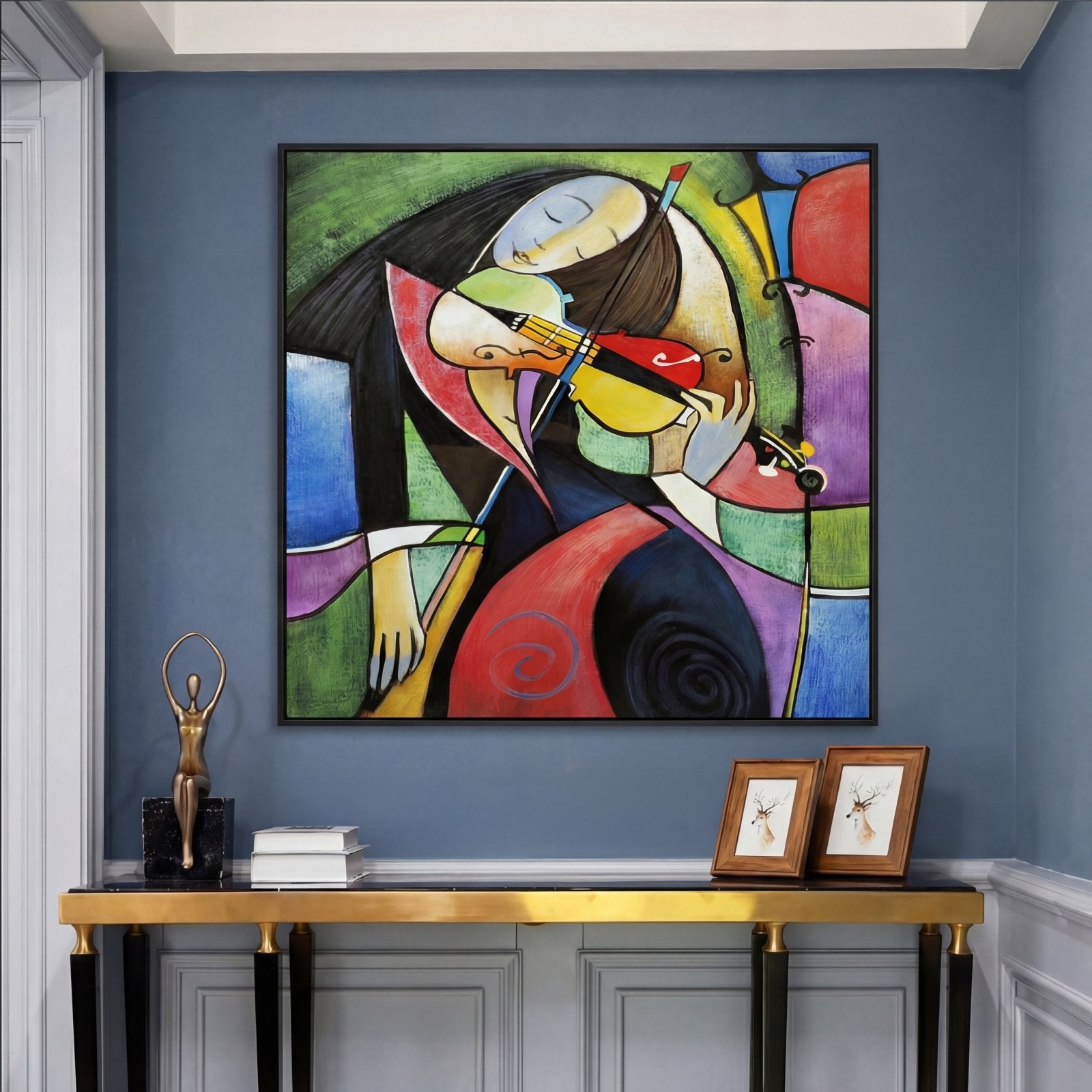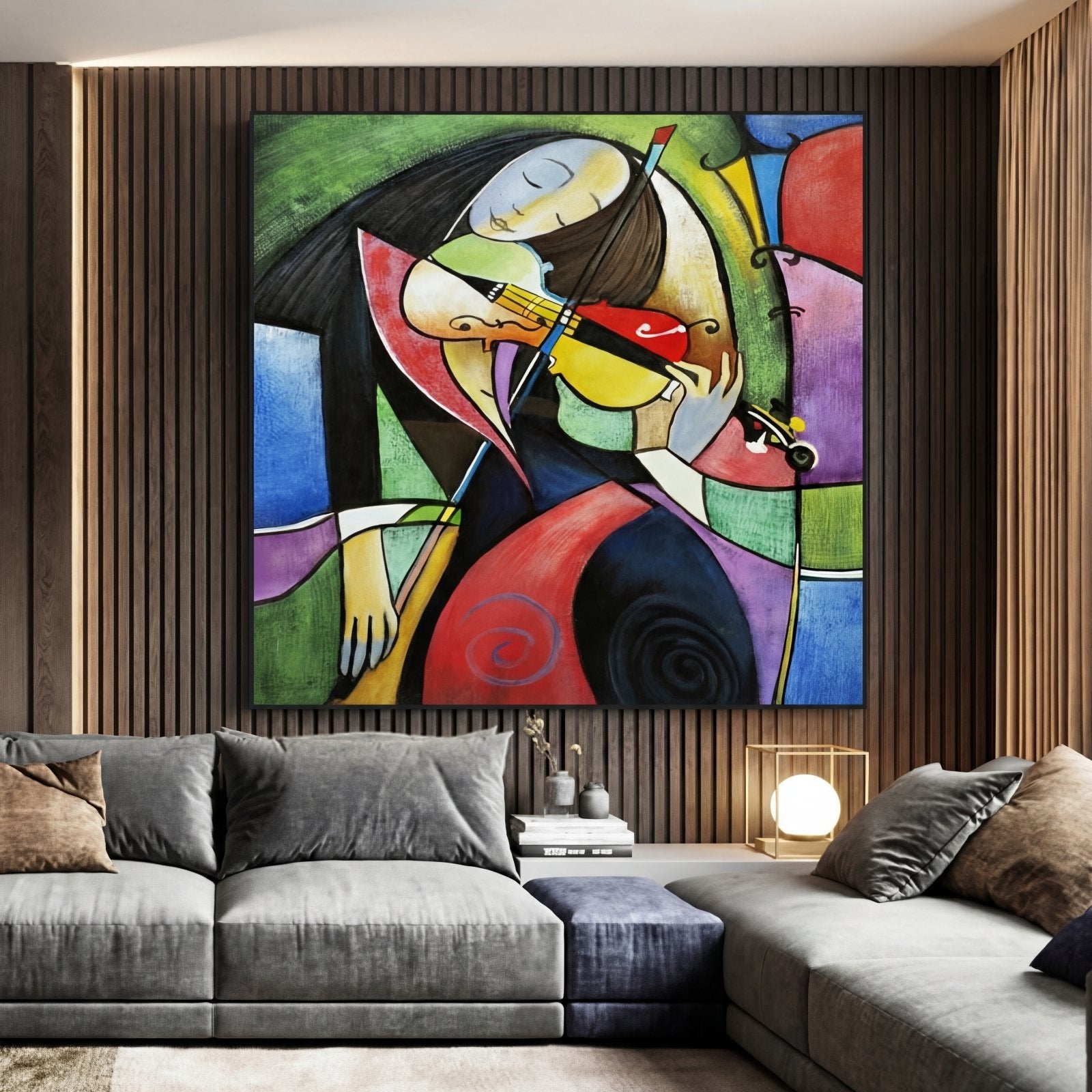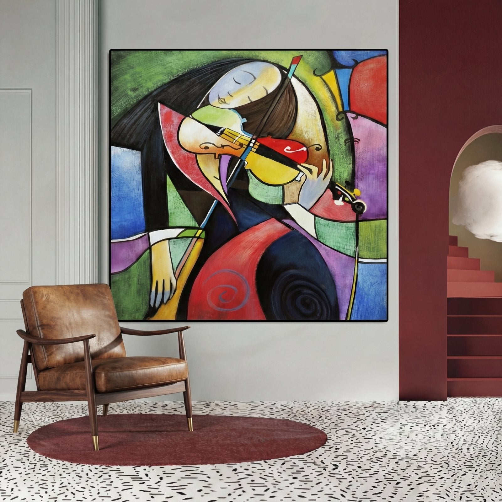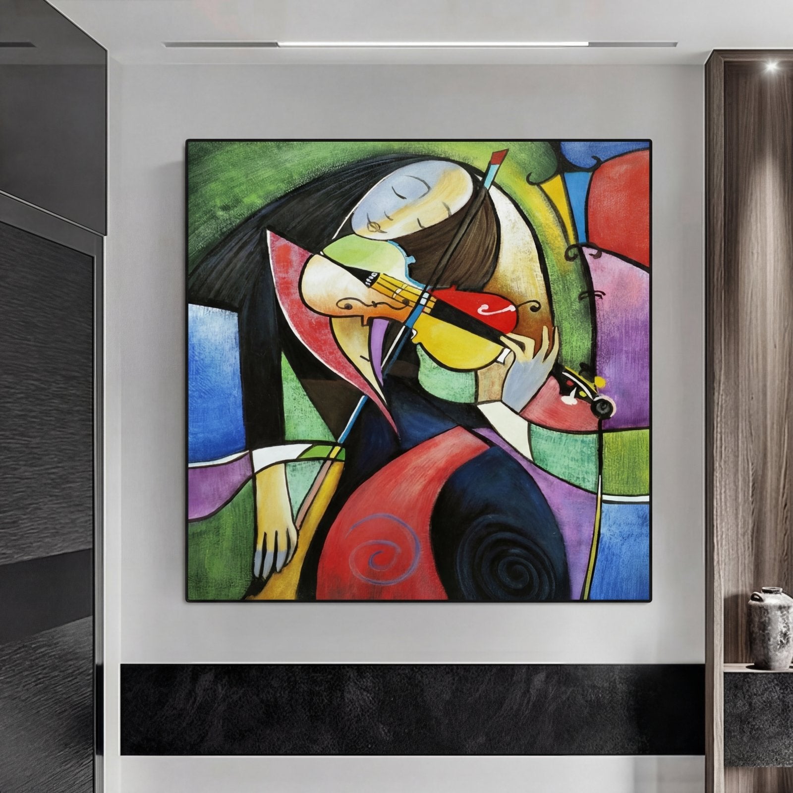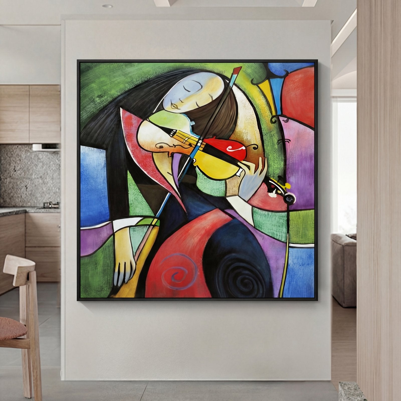 Melancholic Harmony' is a painting with a cubist style, inspired by Pablo Picasso. The main characteristic of this work is the use of many different colors arranged in an ordered and beautifully balanced composition.
