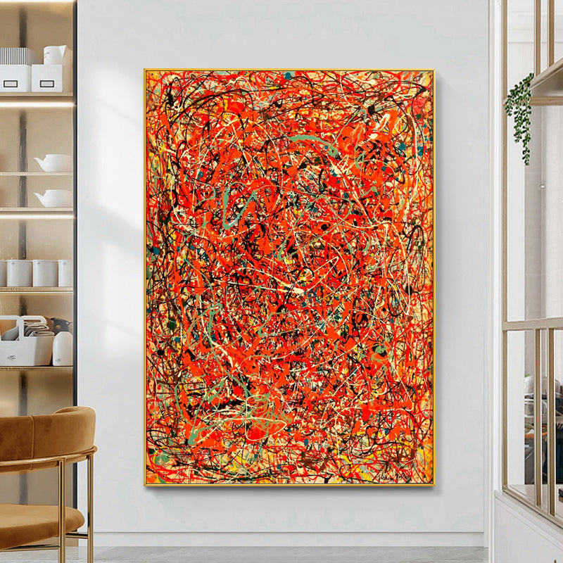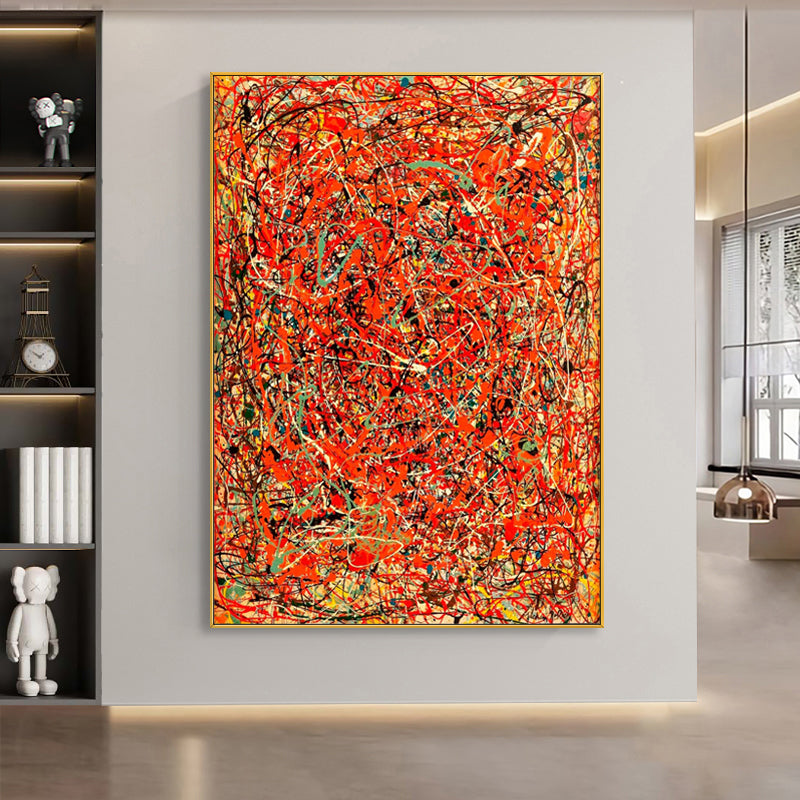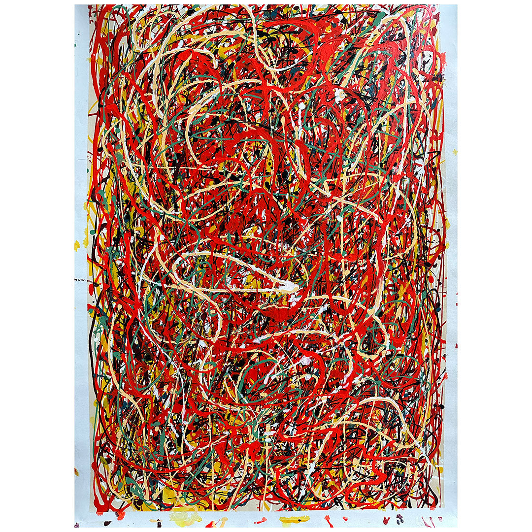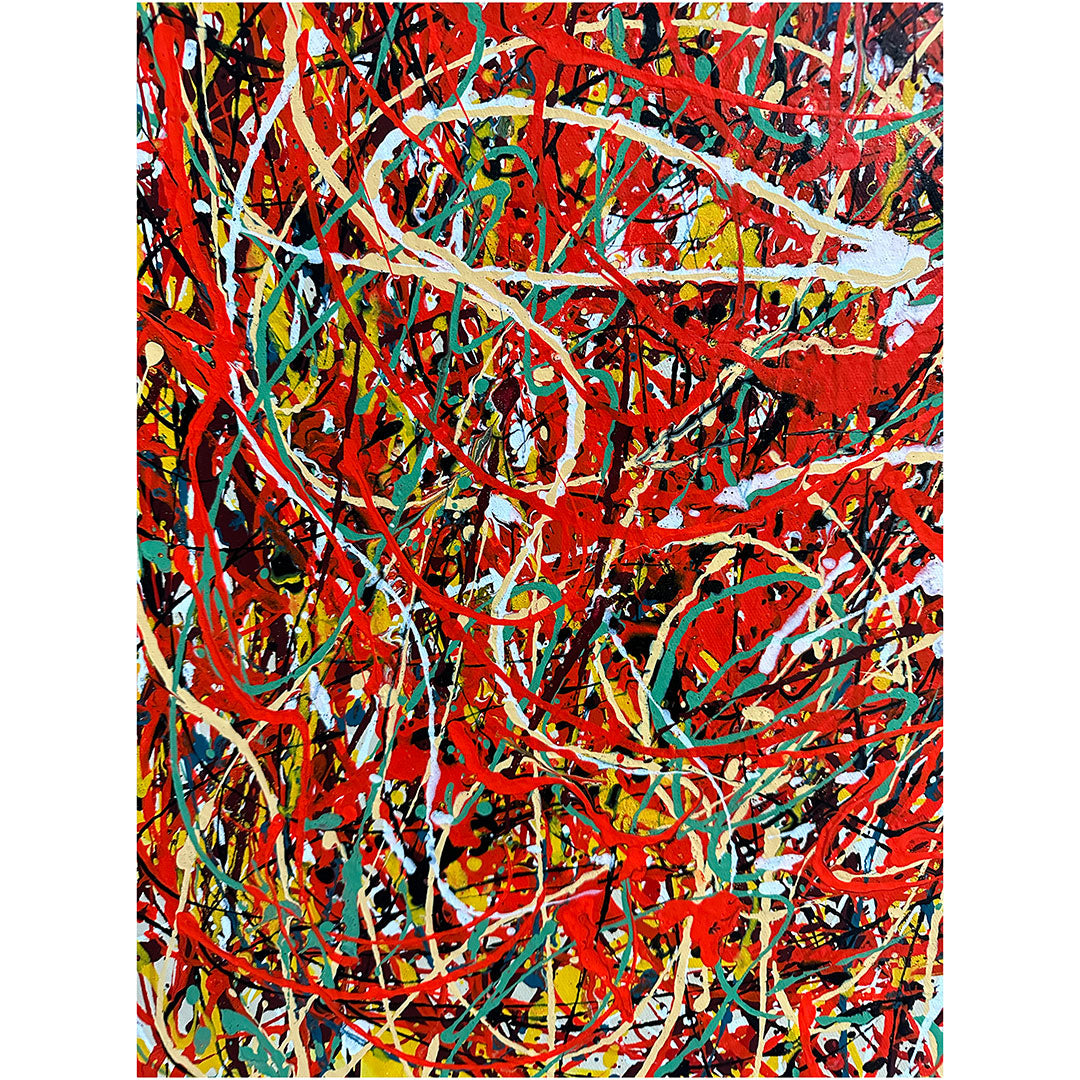 In this dynamic artwork, a blazing red background ignites a whirlwind of chaos.. Experience the raw energy and intensity captured in this painting, where passion and colorful mayhem merge into a mesmerizing meltdown of artistic expression.