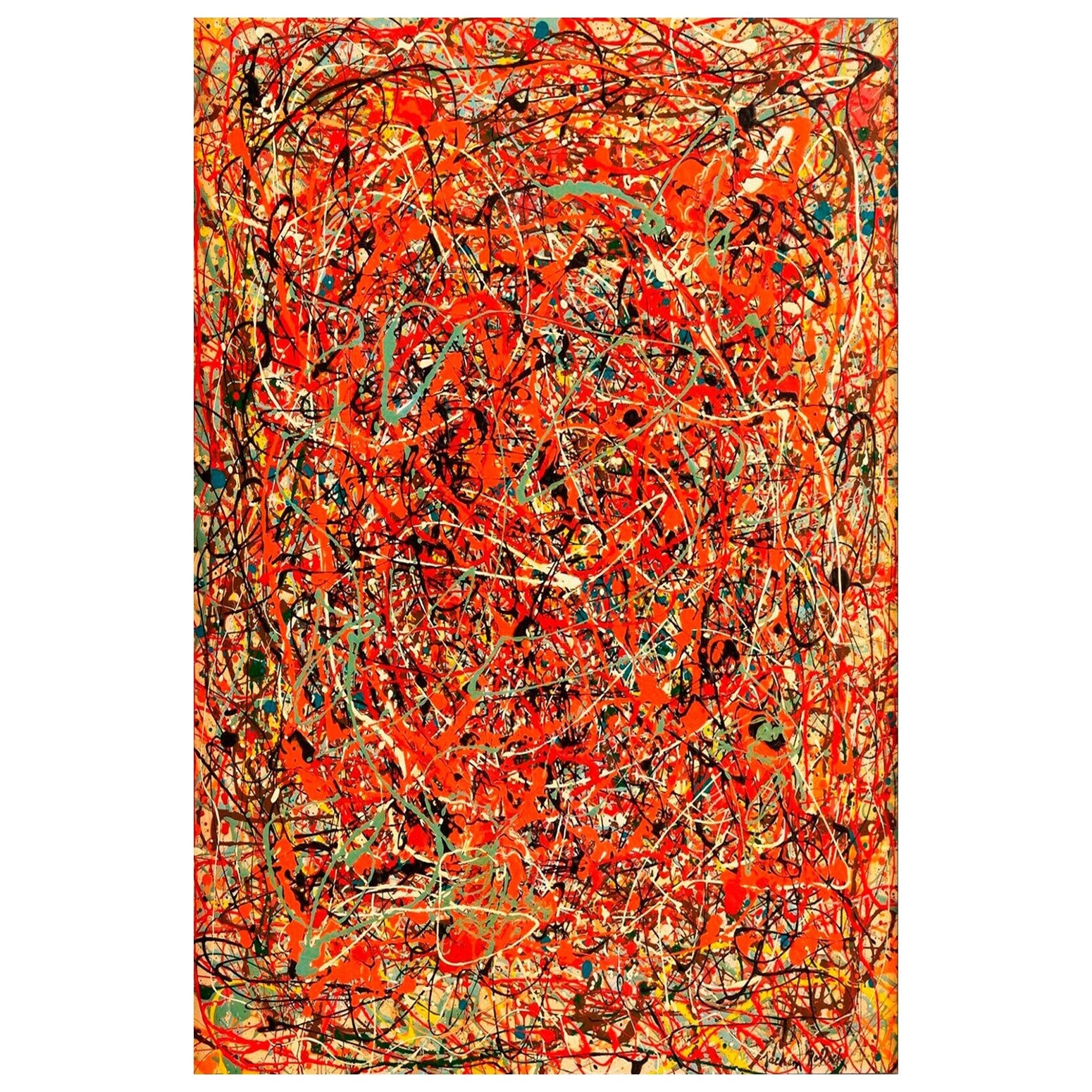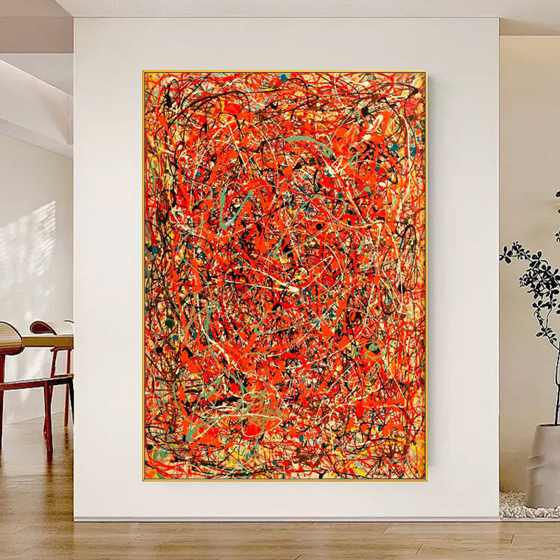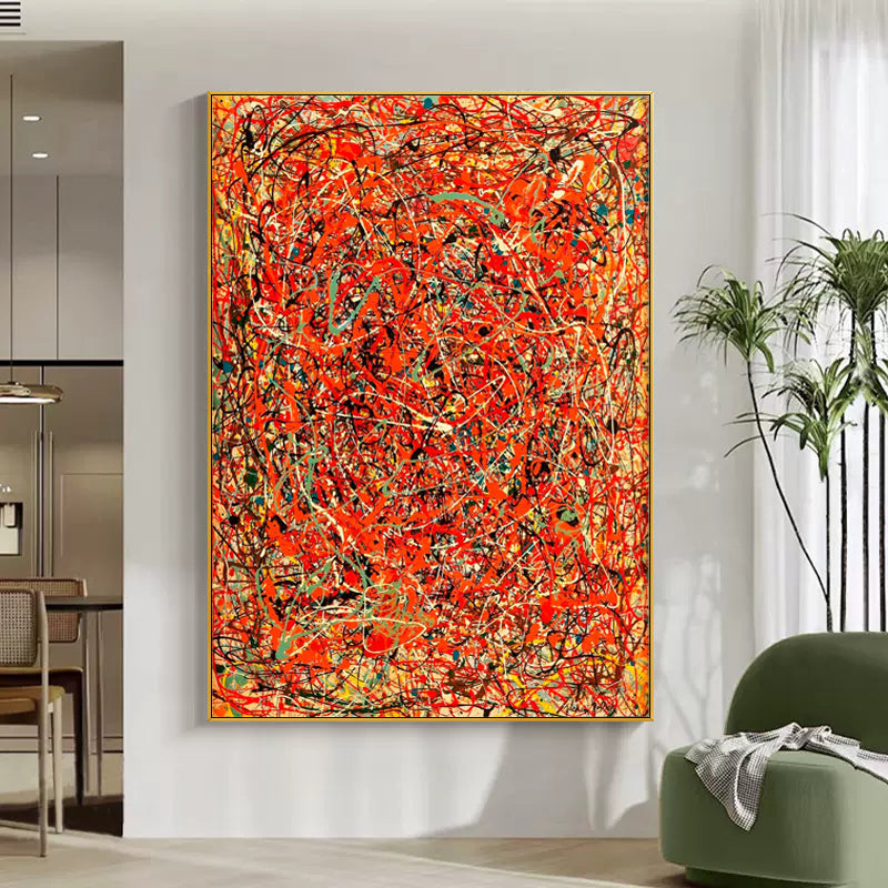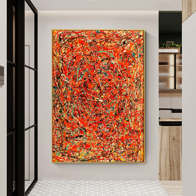 In this dynamic artwork, a blazing red background ignites a whirlwind of chaos.. Experience the raw energy and intensity captured in this painting, where passion and colorful mayhem merge into a mesmerizing meltdown of artistic expression.