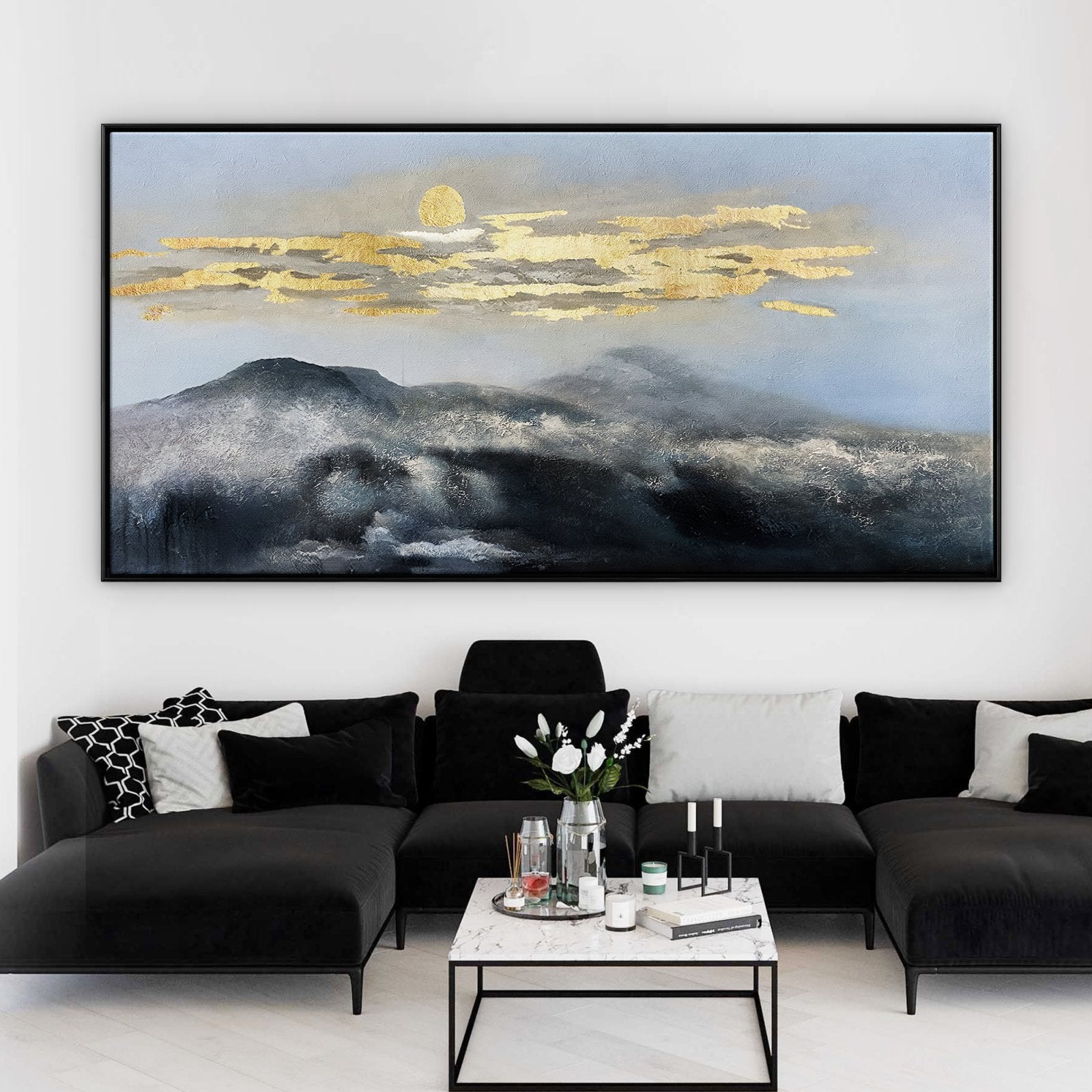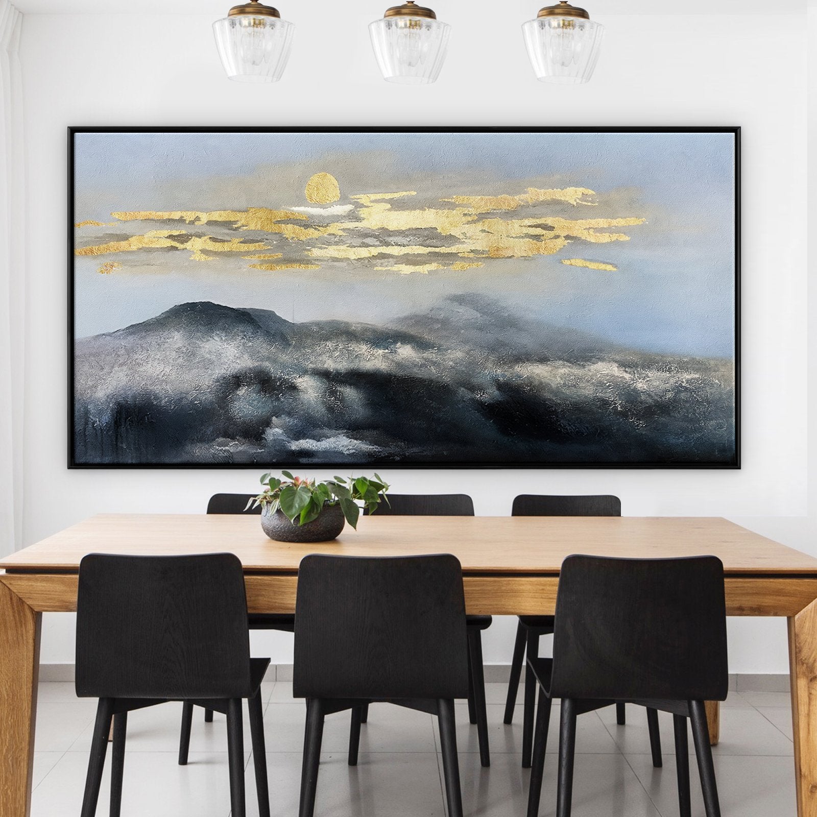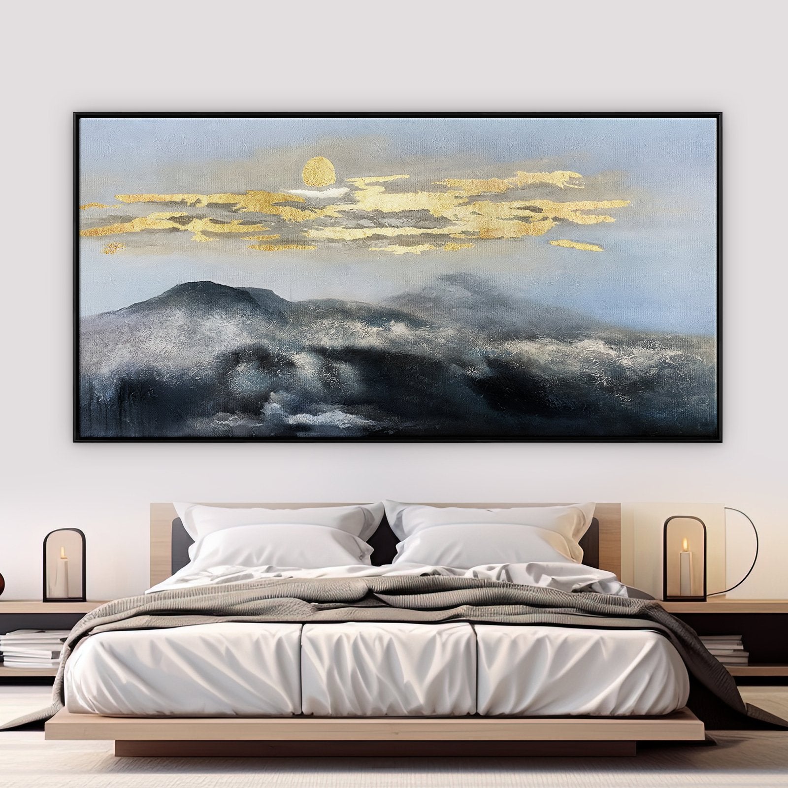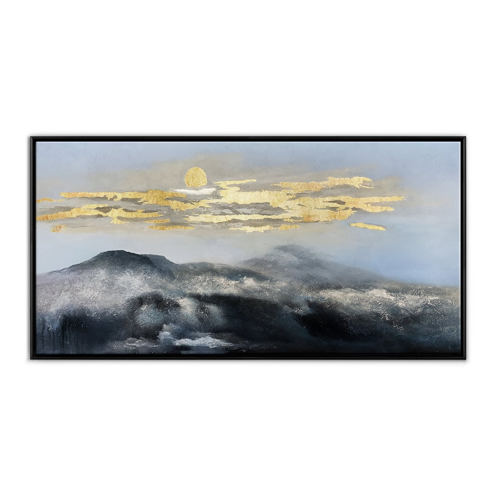 With mountain tops so high that they almost touch the sky, these 'Misty Moon Mountains' are a beautiful sight to behold. The golden mist floats like a beautiful blanket over the snowy summit. This gives the artwork a sense of mystery and sophistication! ⁠