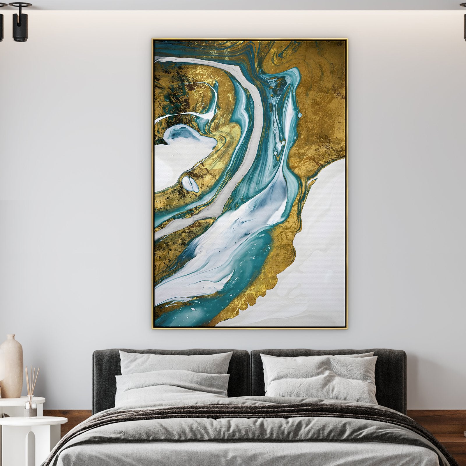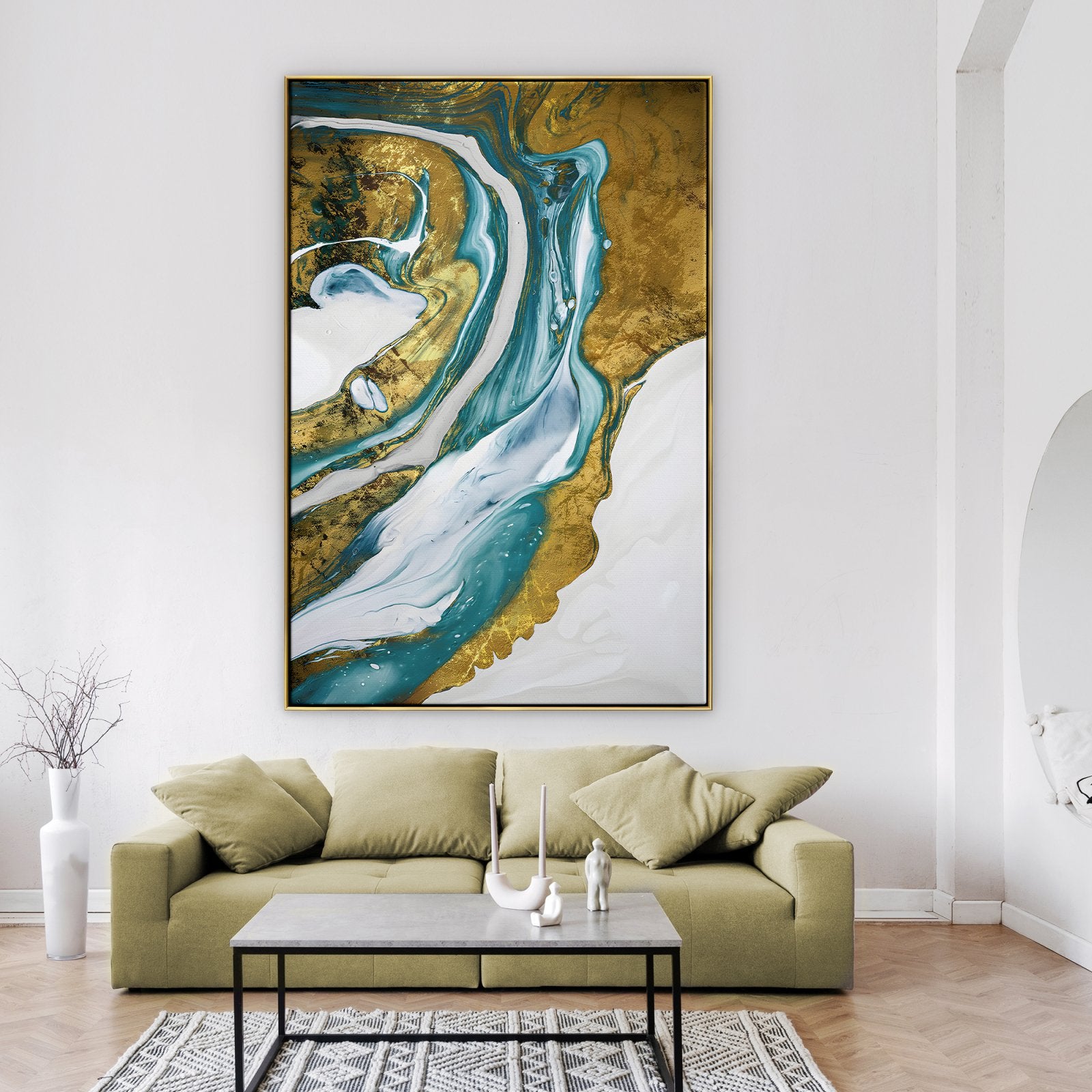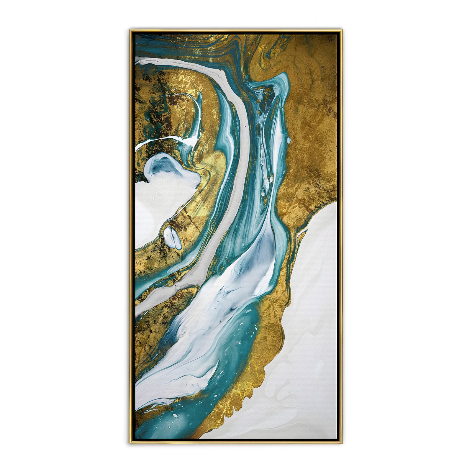 A dashing portrayal of a golden river with a clear white background. The river really pops out of this art piece because of the clever way the artist worked with contrasts. The flow of the river brings a sensation of warmth and elegance to any room.