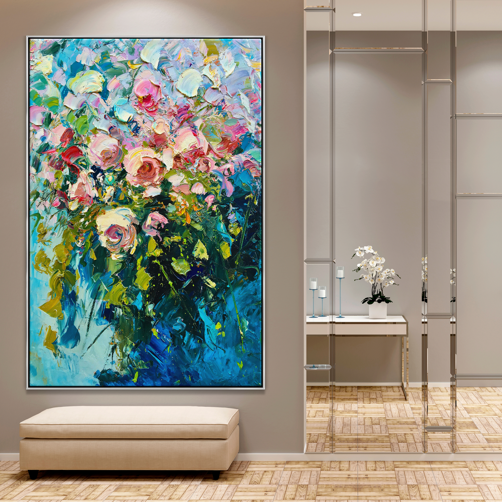 With flowers that almost pop out of their canvas, ‘Spring’ is here, and it wants to show it. The colorful hommage to the blossoming season brings a flowery and elegant atmosphere to any space.