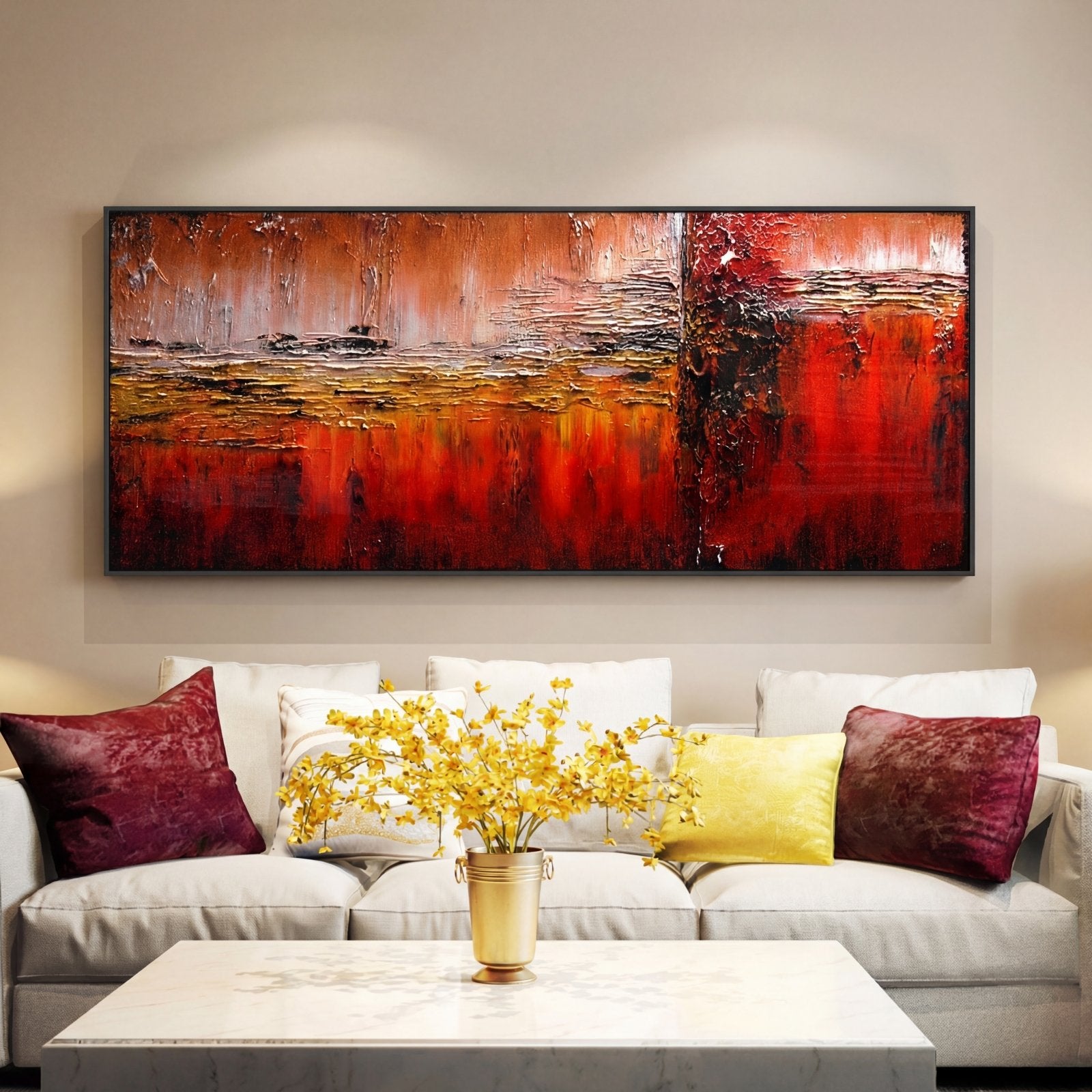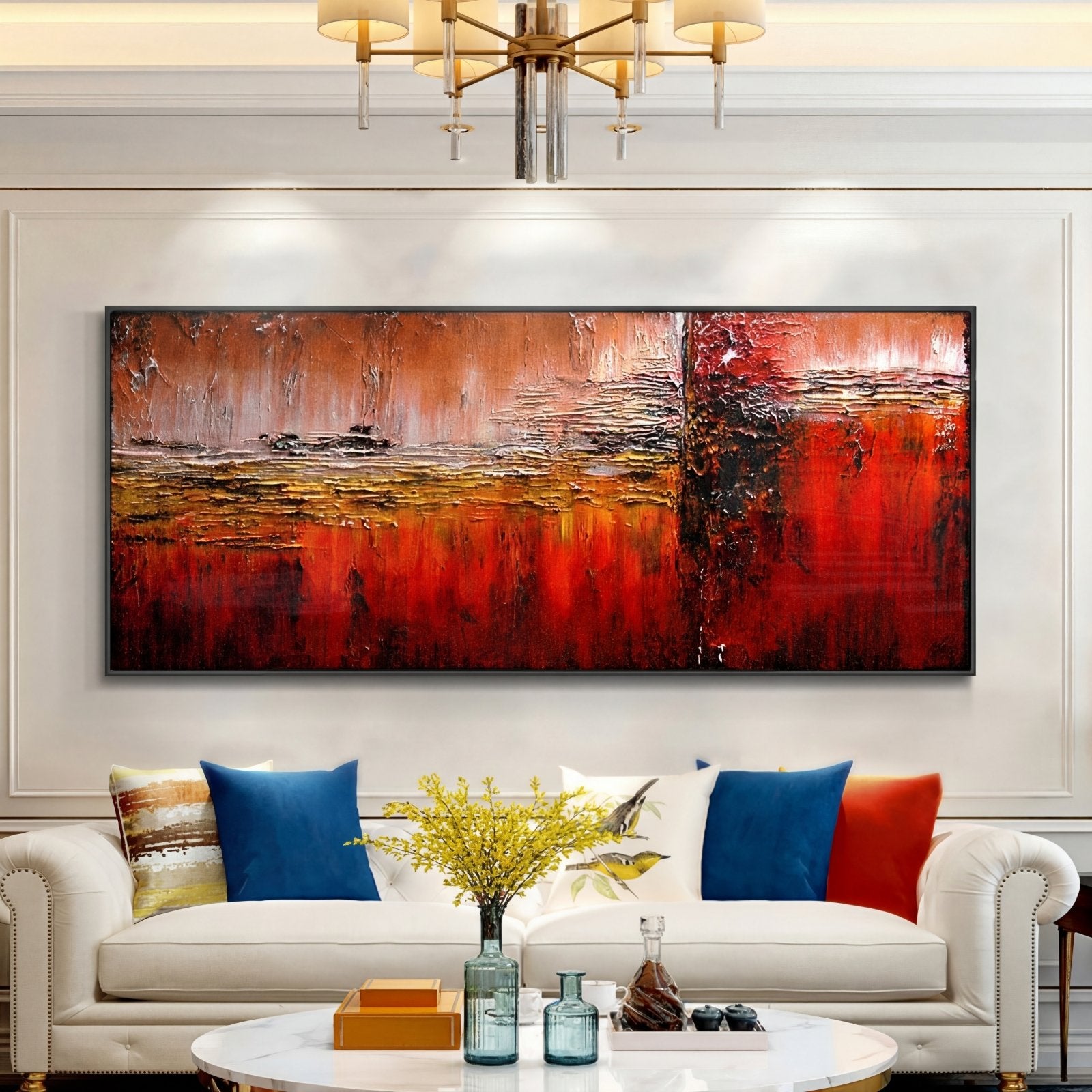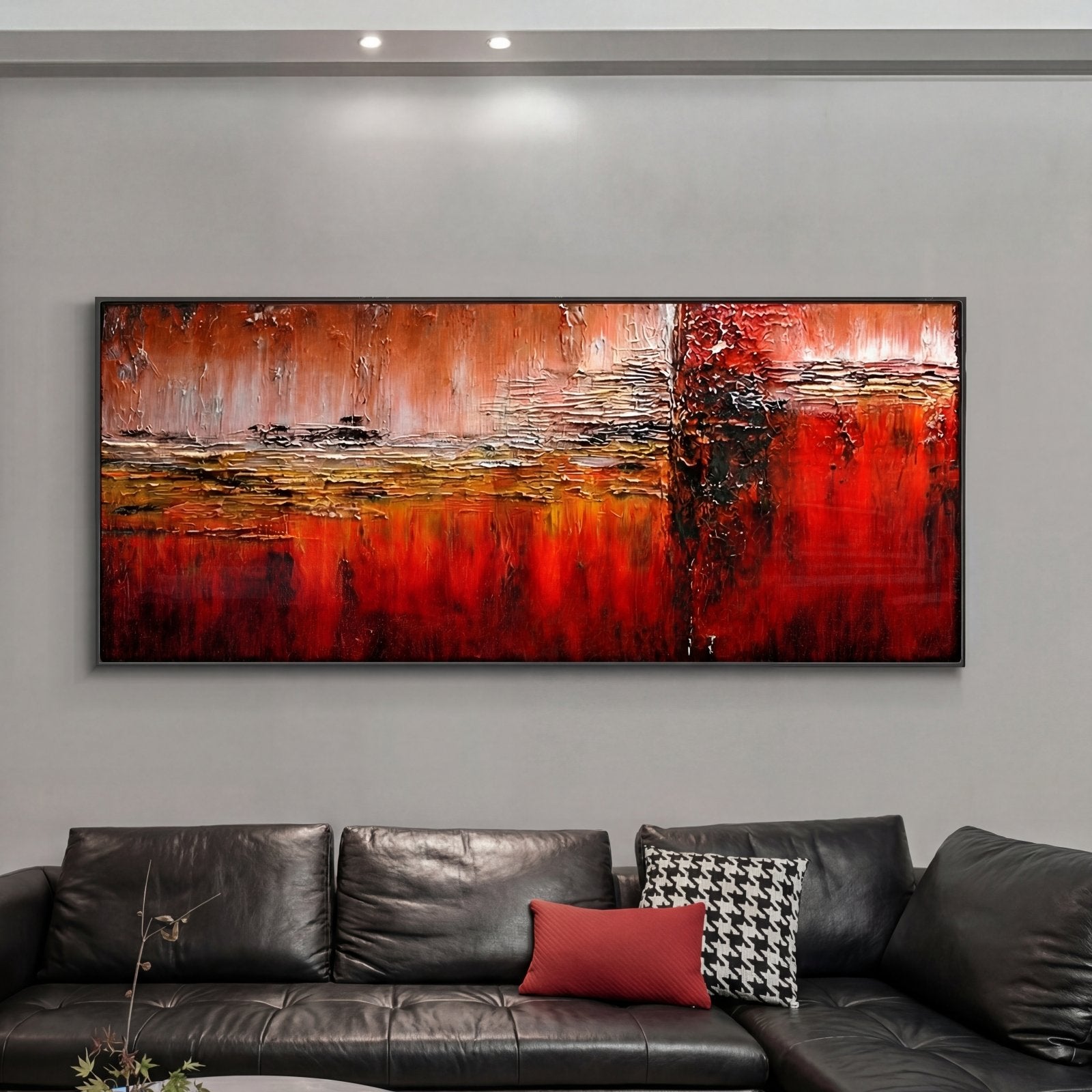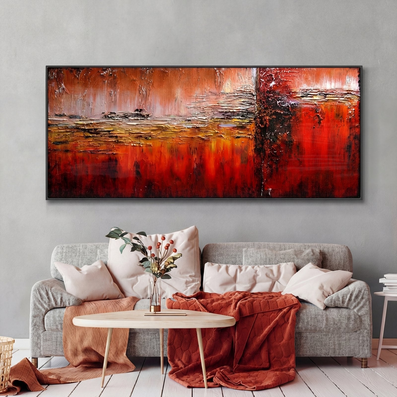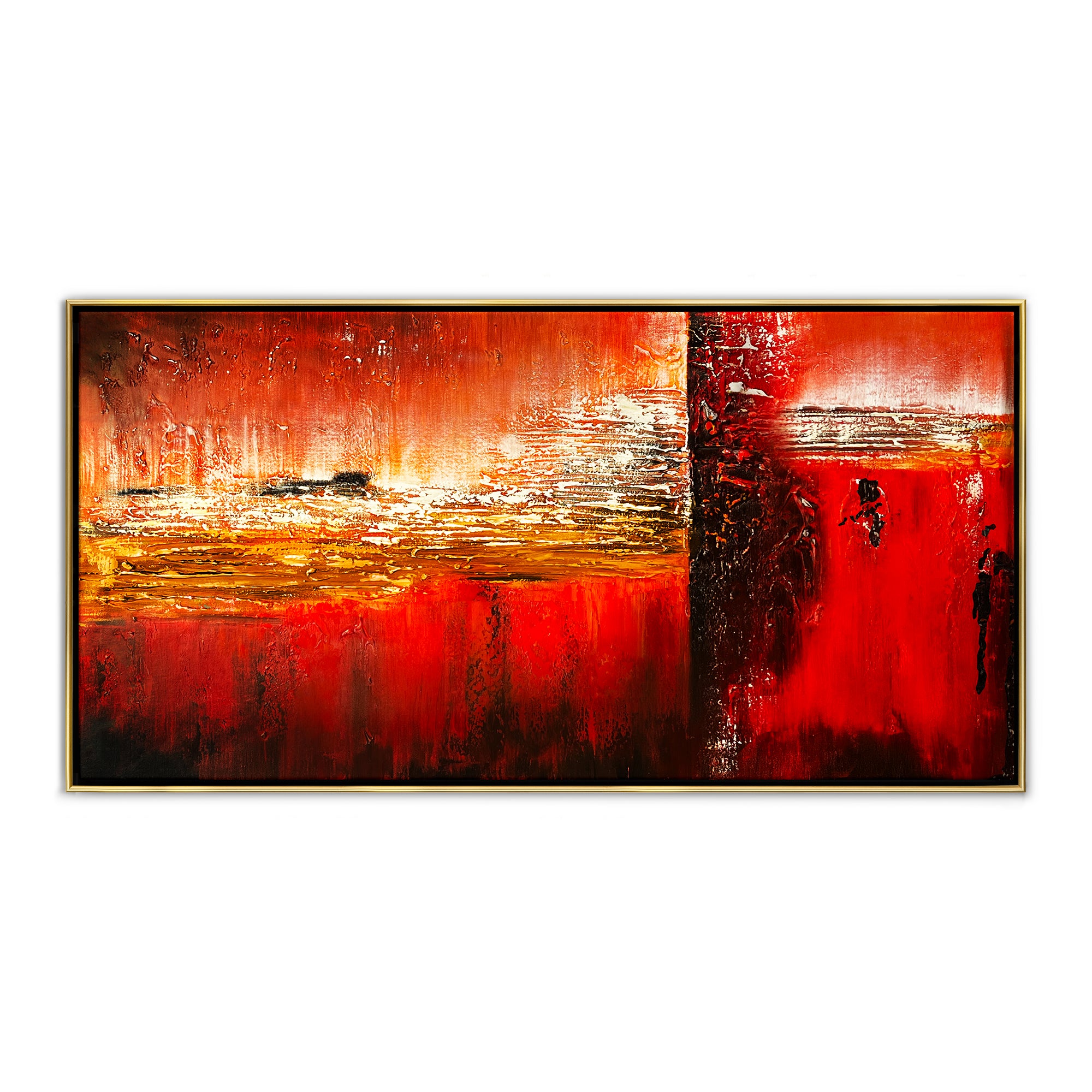 Almost bursting out of its canvas, this large wall painting 'Sunburst' sure is unique! With thick-layered strokes of paint and a beautiful palette of deep red colors the painting comes even more alive, creating a warm and dynamic atmosphere!