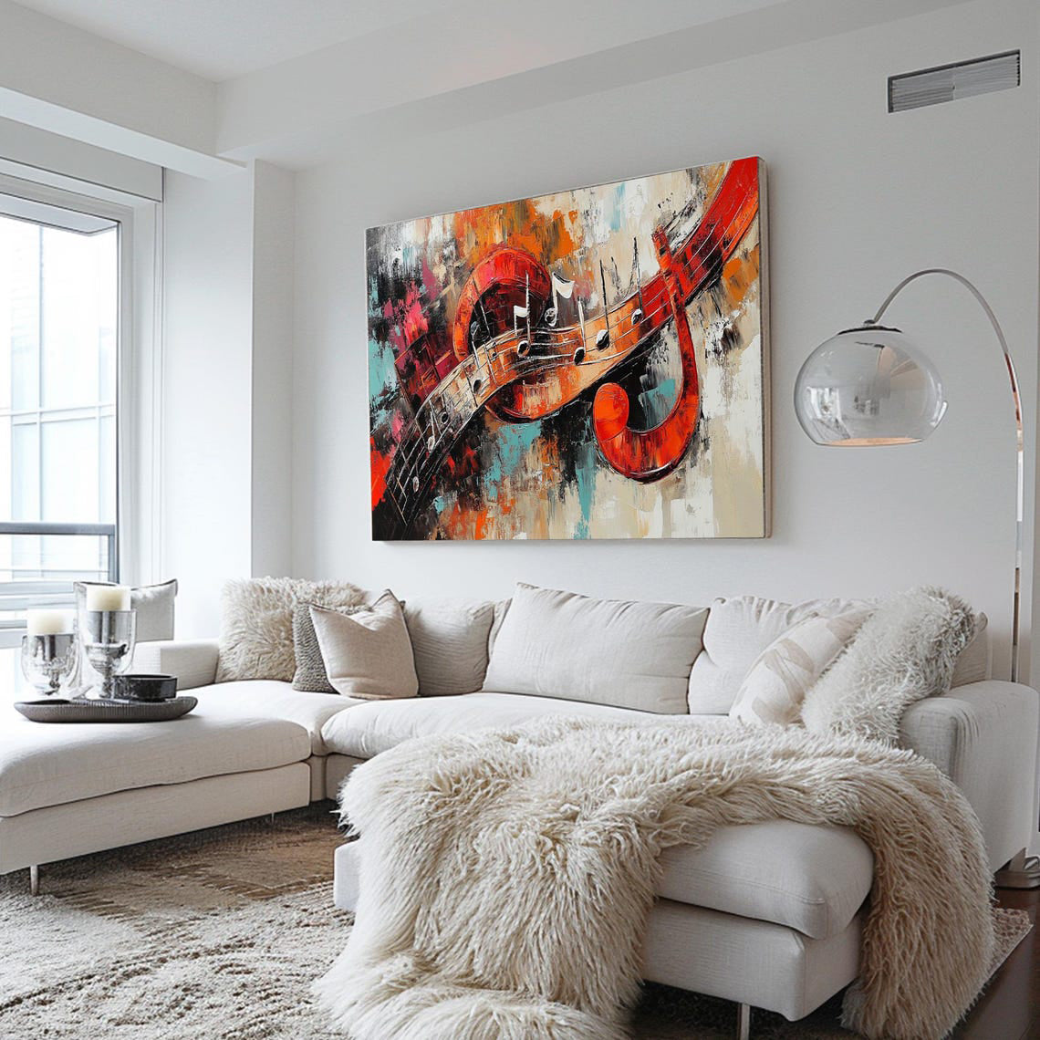 Swinging Melody is a burst of color and rhythm! The lively red curves of the treble clef swirl through musical notes, creating a visual symphony that fills your space with energy and charm. It’s not just art; it’s music for your eyes!
