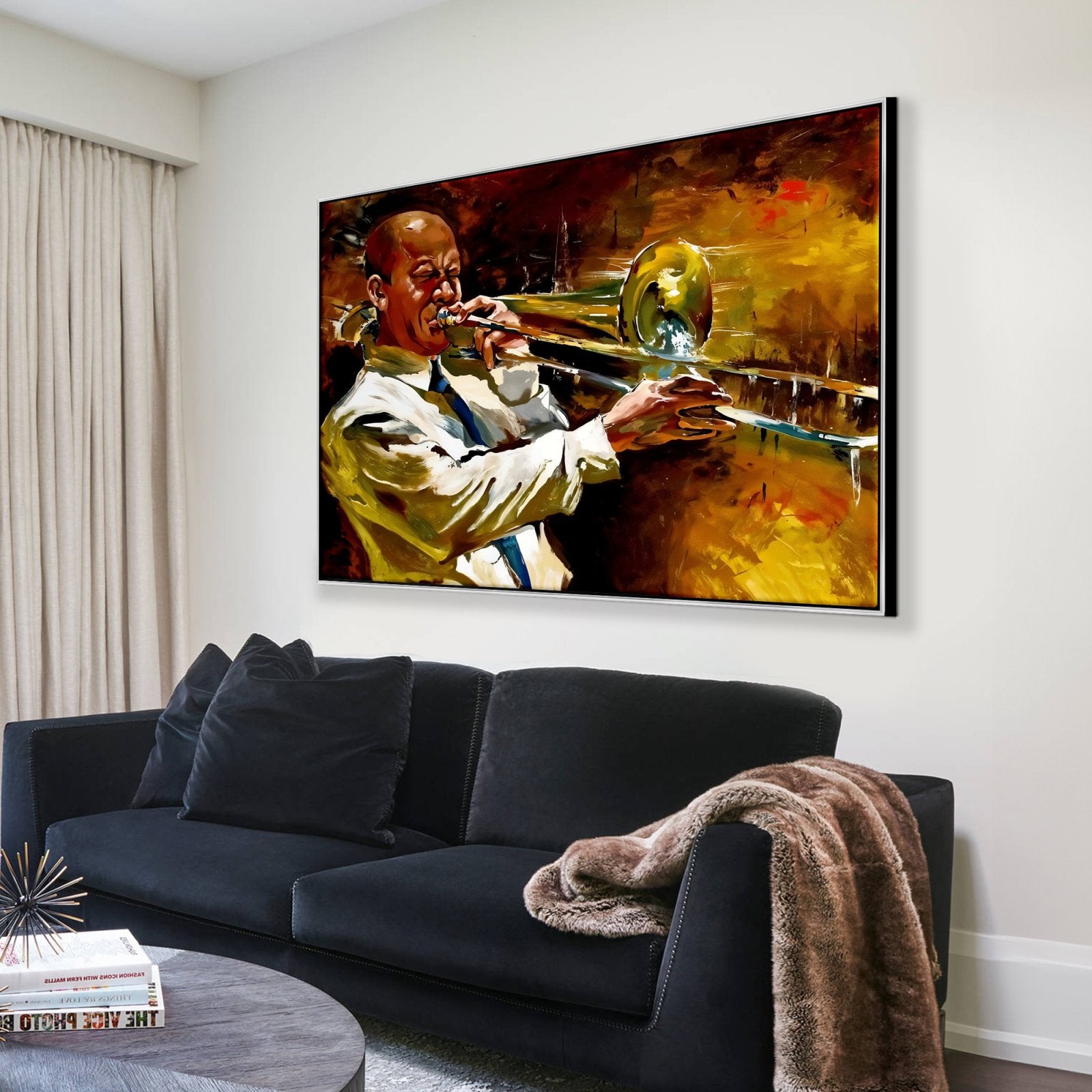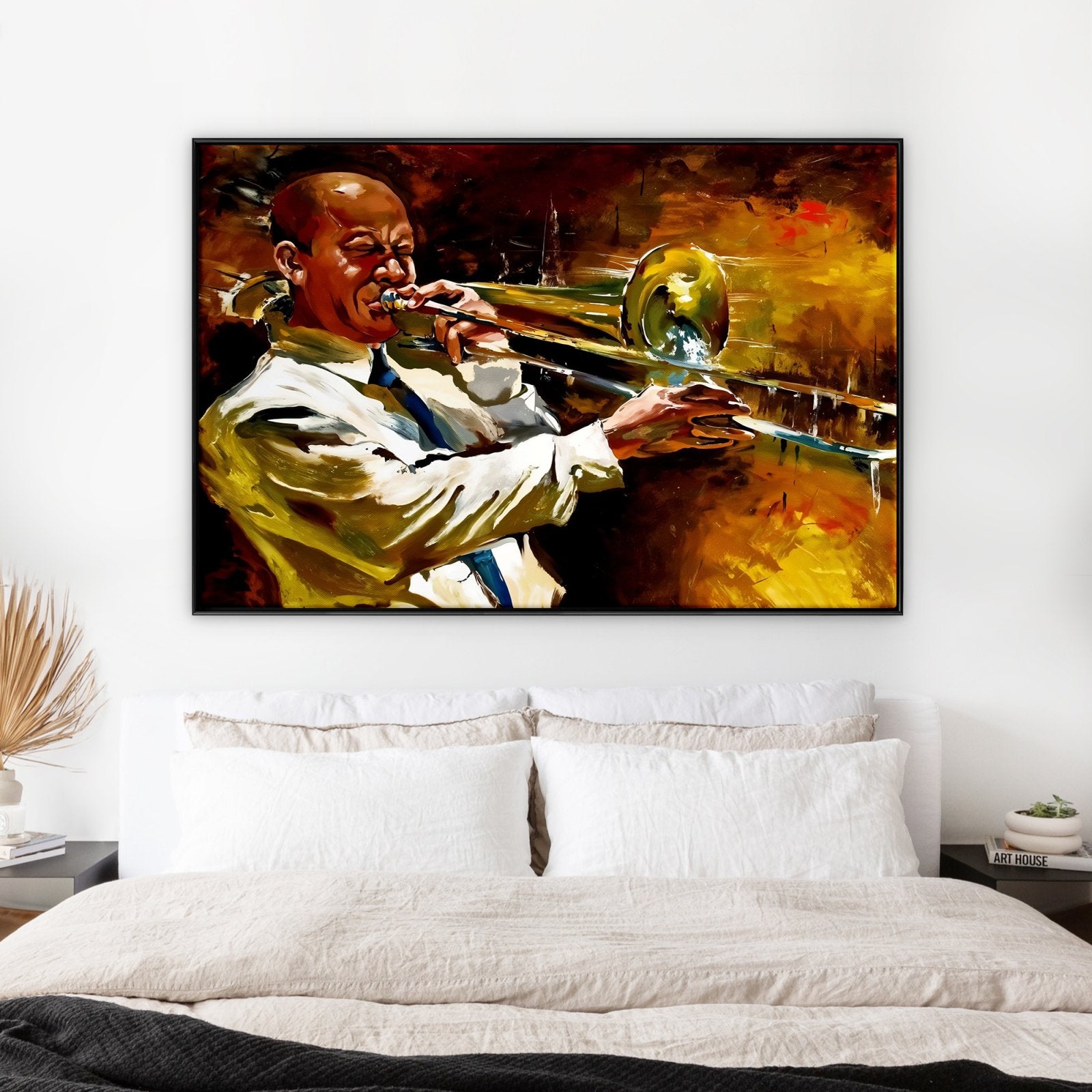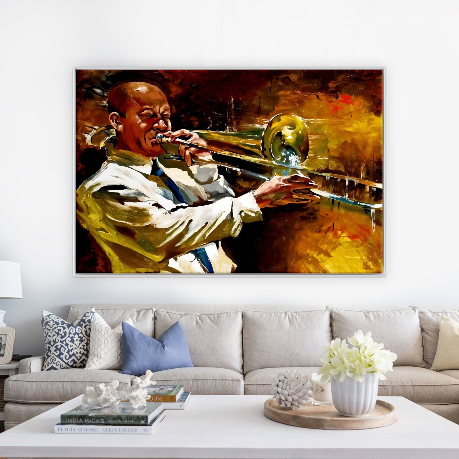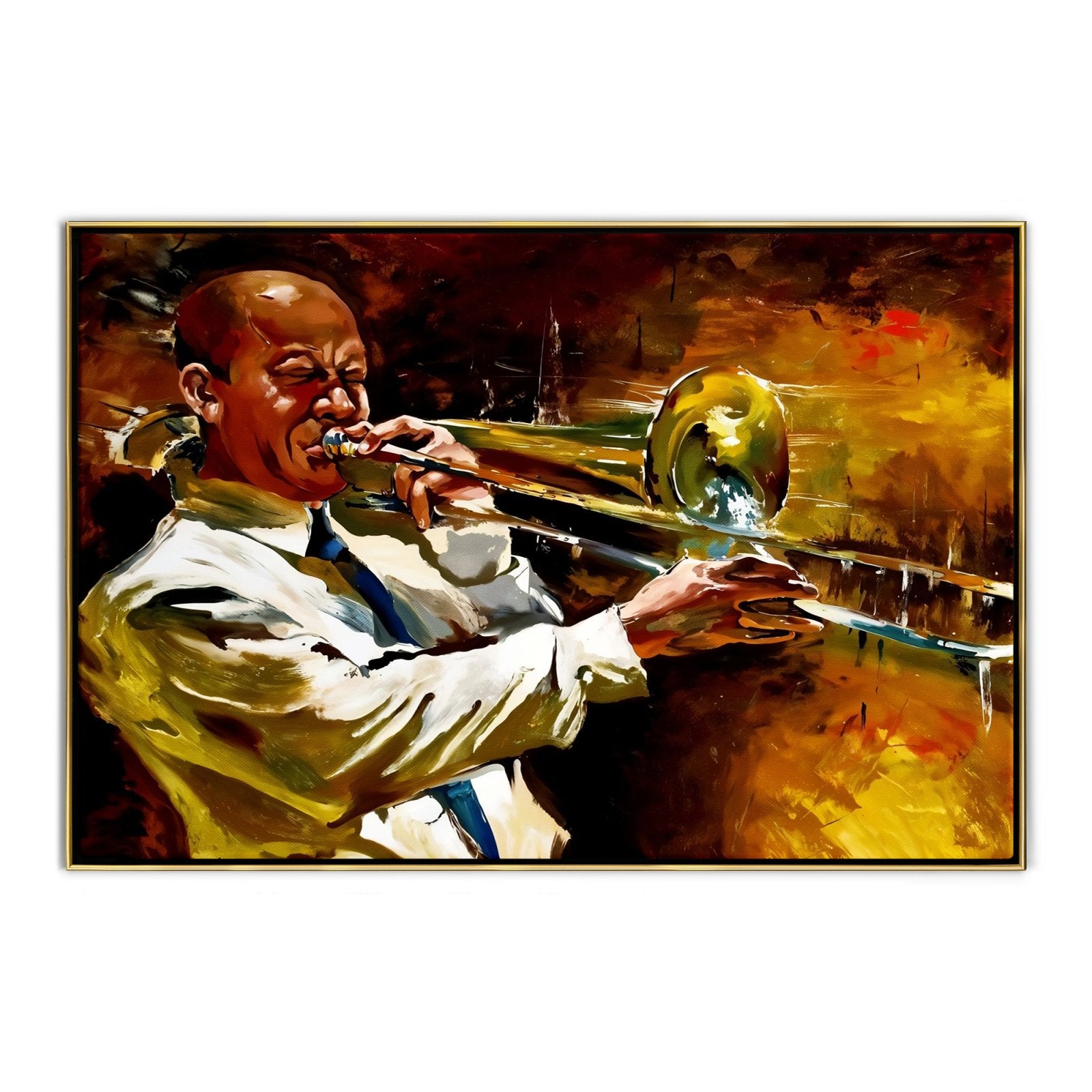 Experience the energy of live jazz with this vibrant painting. The musician's intense focus and the bold colors bring the scene to life, making it a perfect addition for anyone who love music.