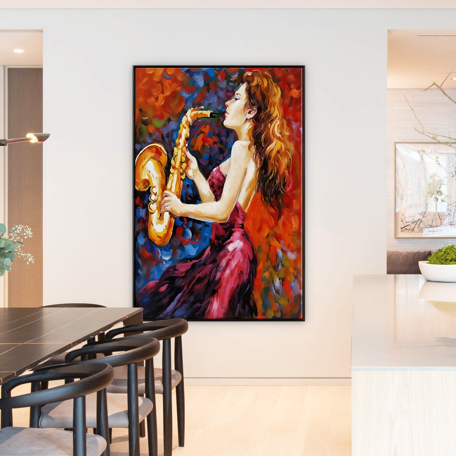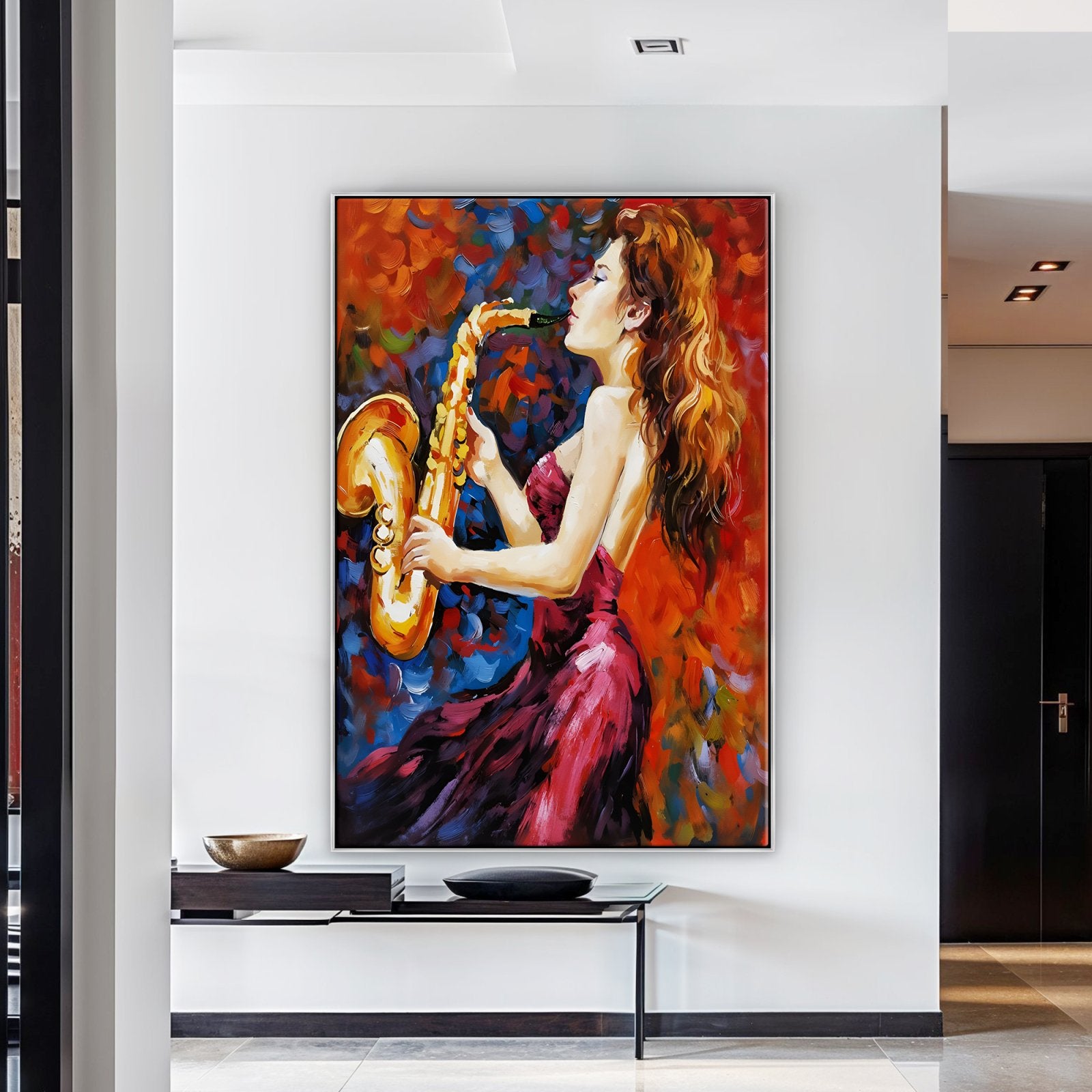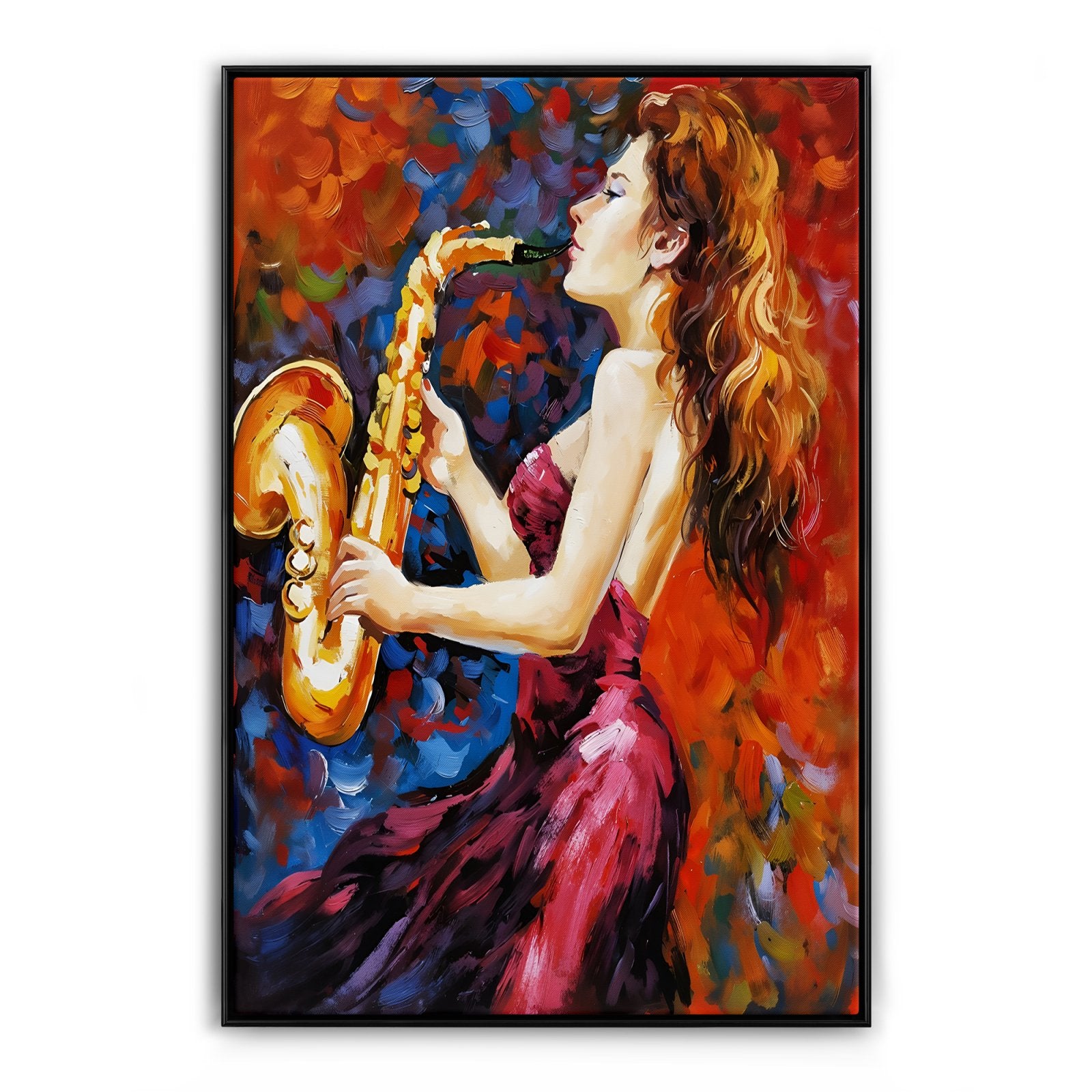 Immerse yourself in the rhythm of Velvet Funk. This striking painting features a saxophonist in full flow, surrounded by a vibrant mix of colors, bringing energy and life to your décor.