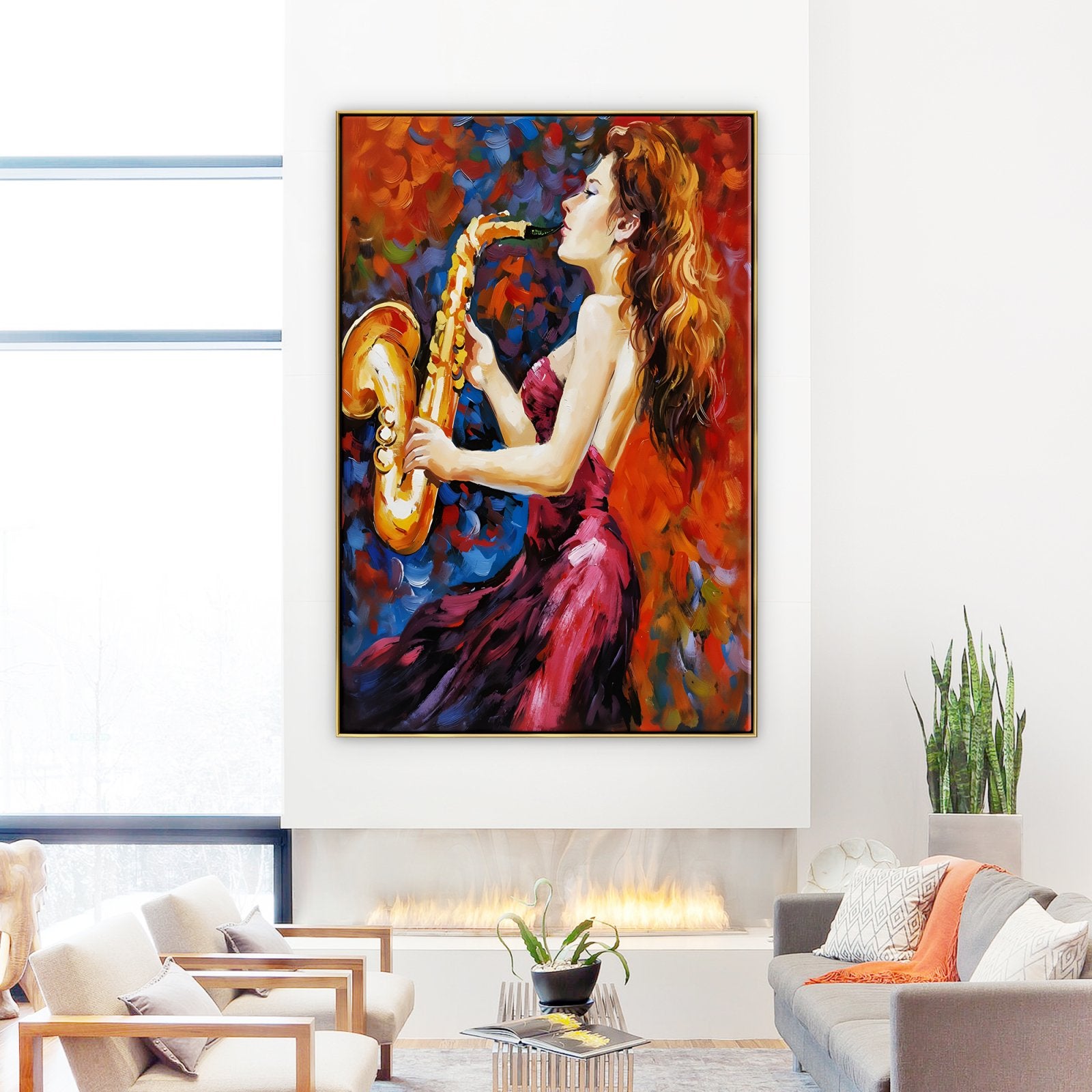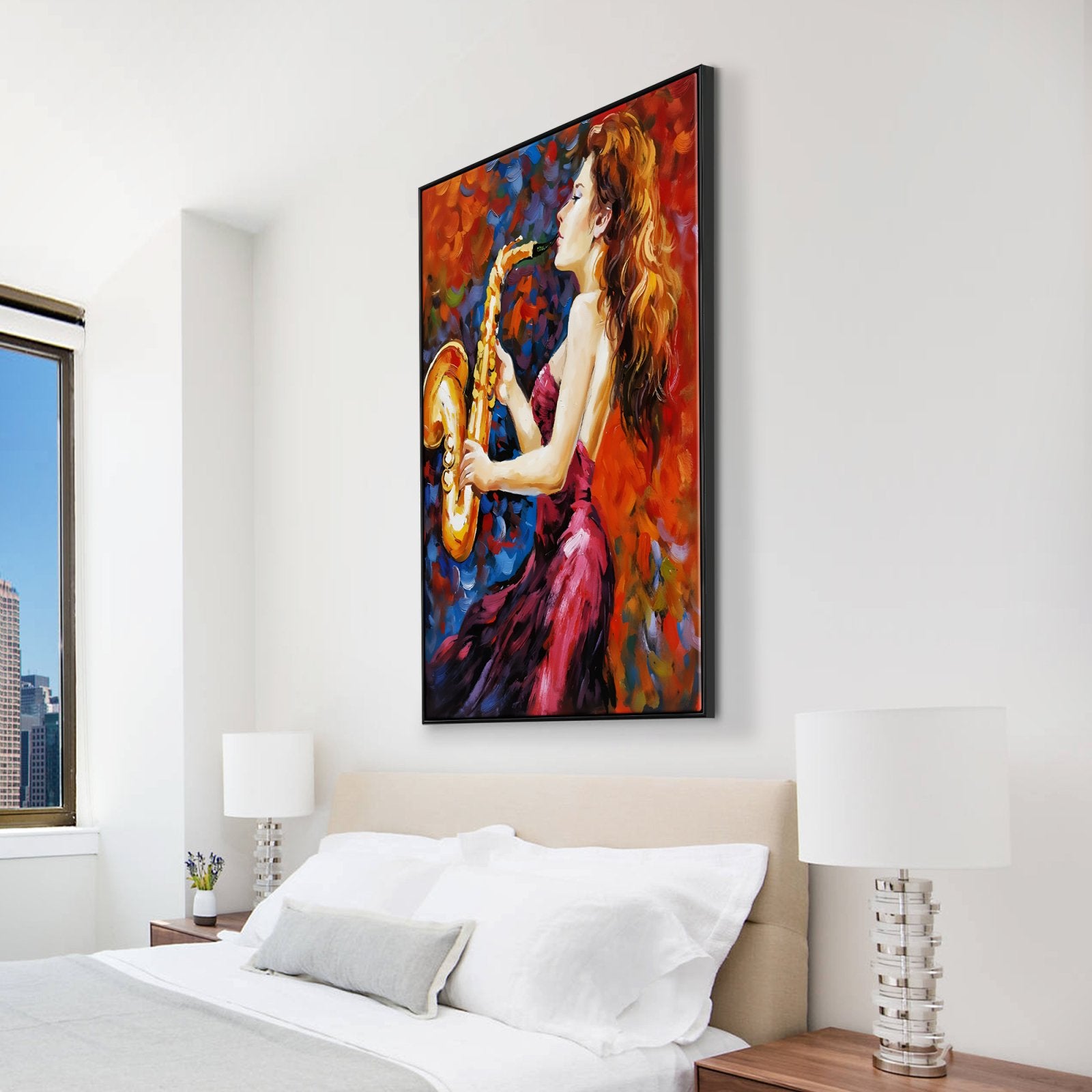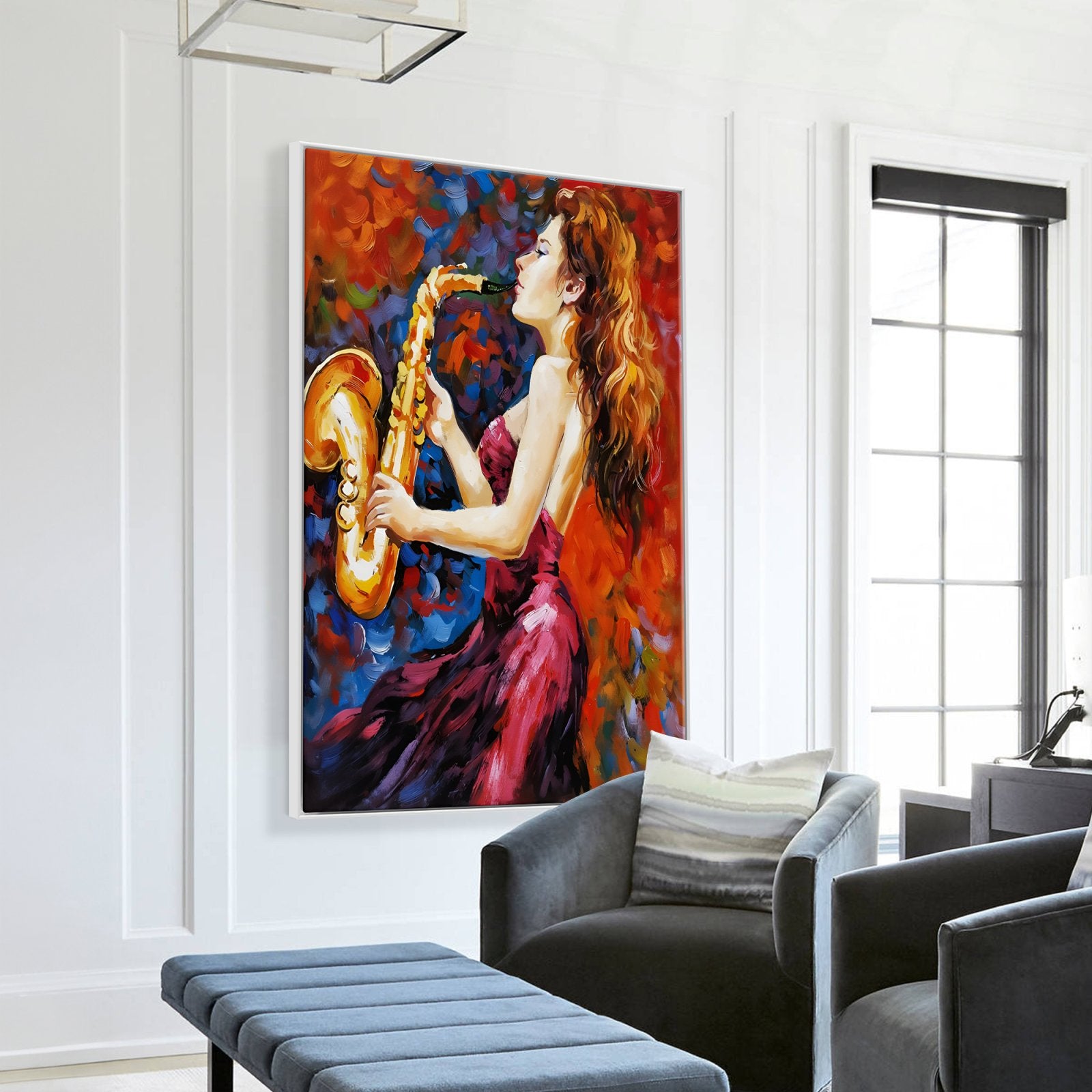 Immerse yourself in the rhythm of Velvet Funk. This striking painting features a saxophonist in full flow, surrounded by a vibrant mix of colors, bringing energy and life to your décor.