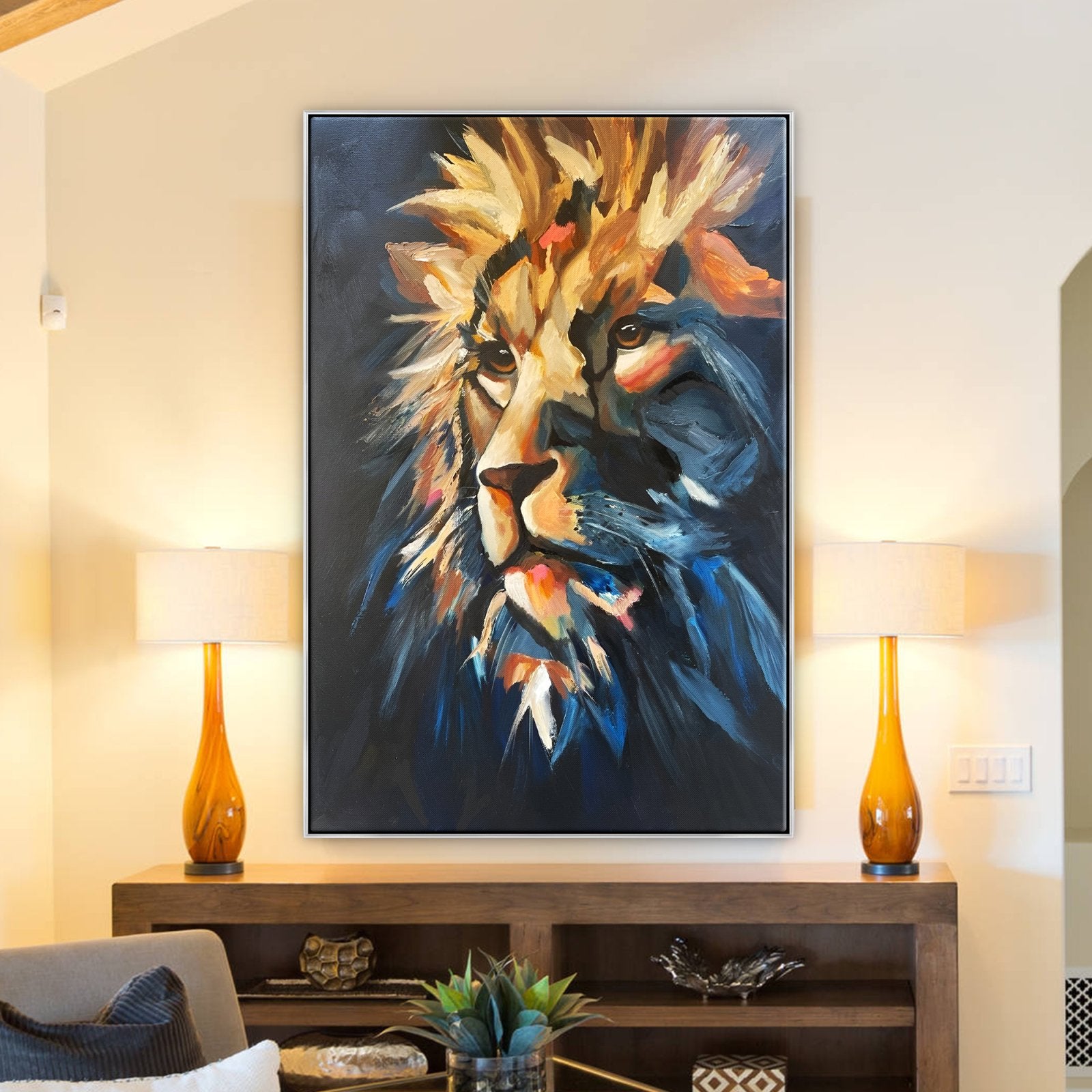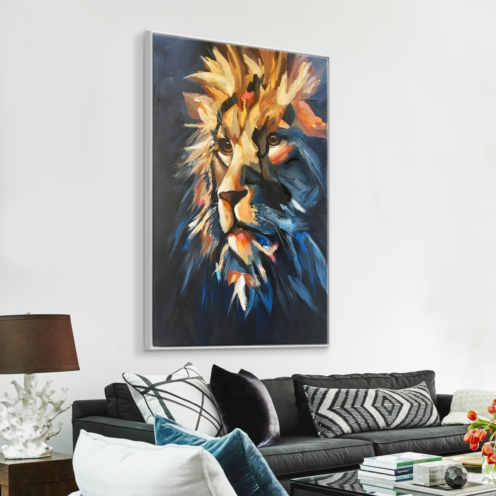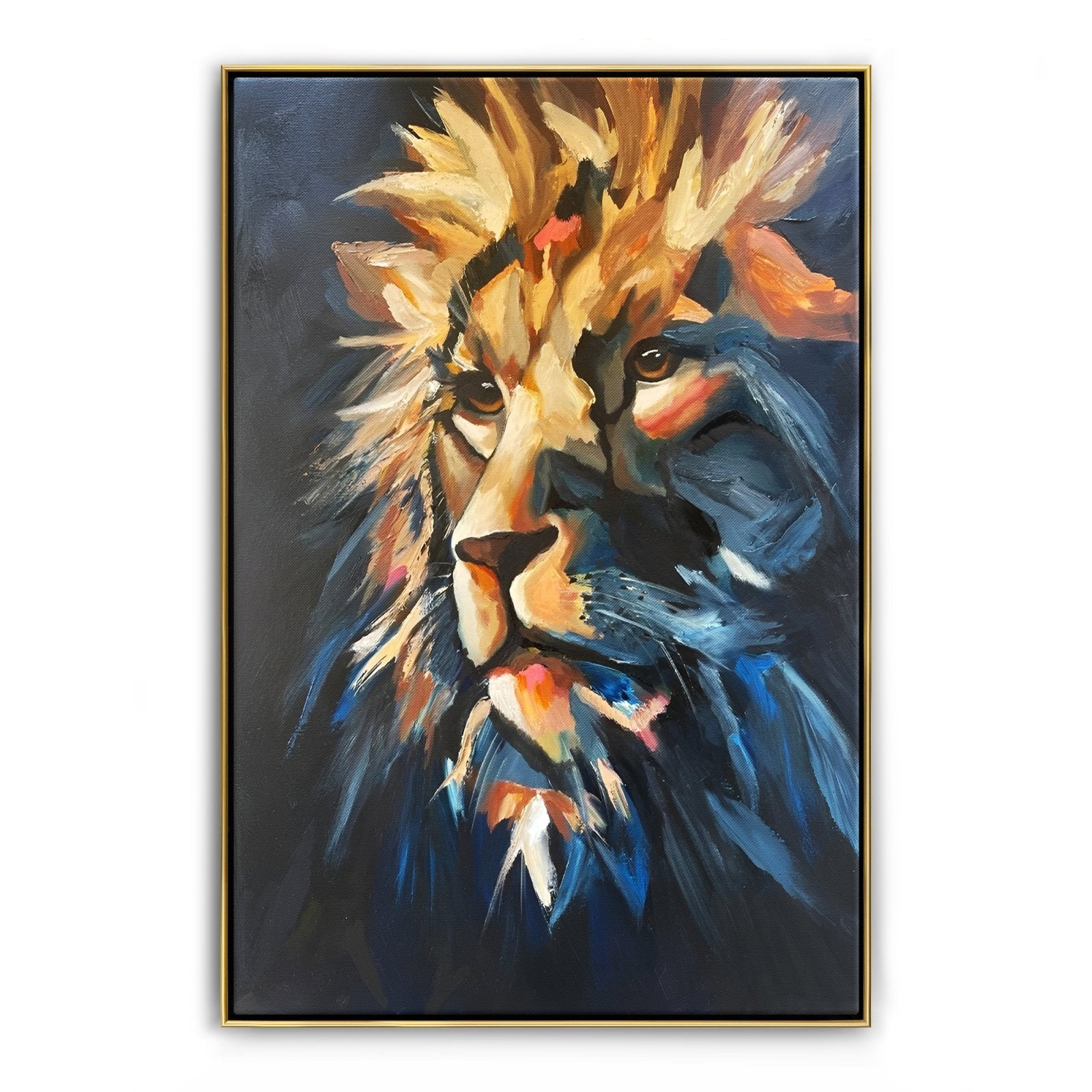 We'd like you to meet the true king of the jungle, Zarina! His friendly eyes show a lifetime of experience and leadership. With just a few brushstrokes his mighty manes are portrayed majestically, making it a beautiful addition to any home interior!