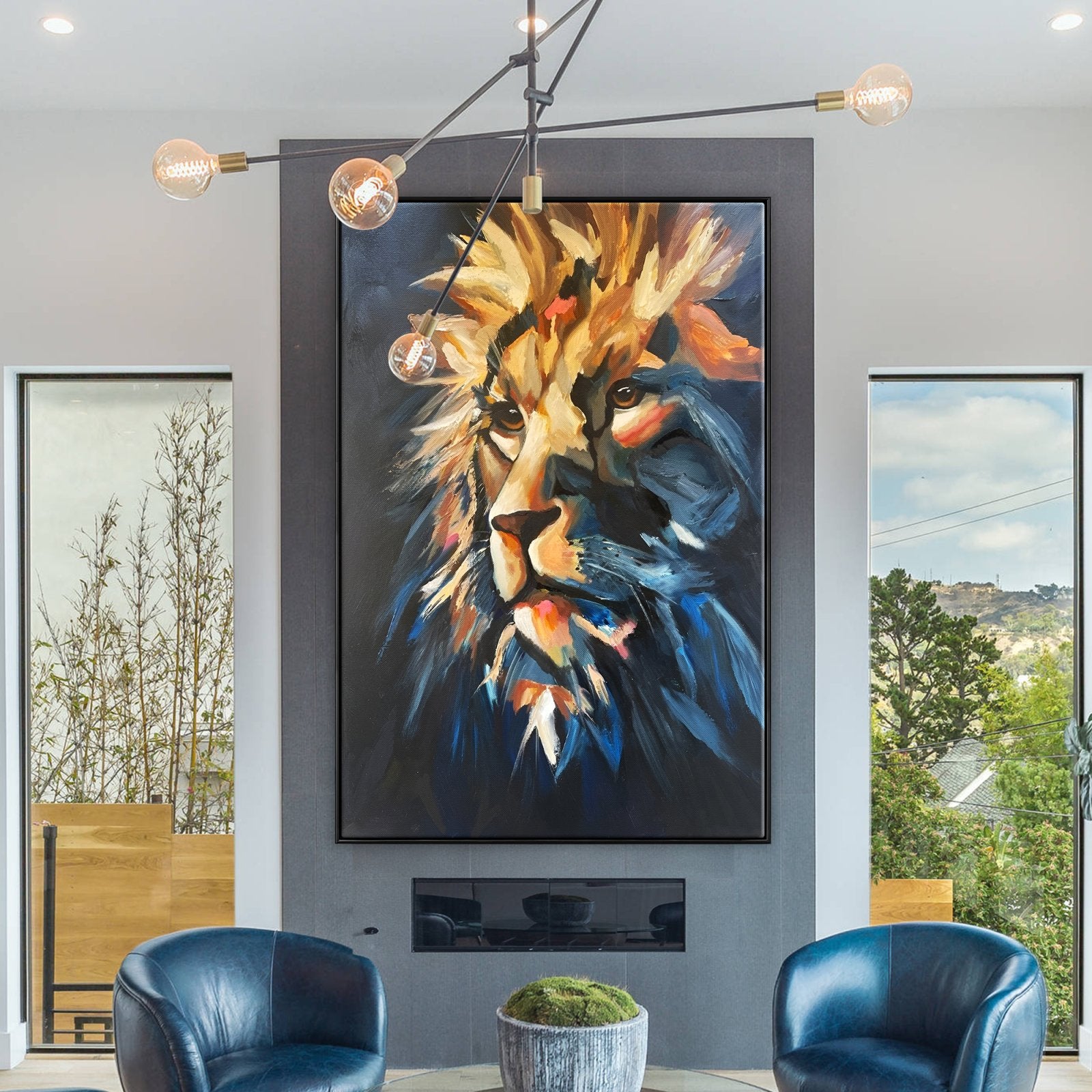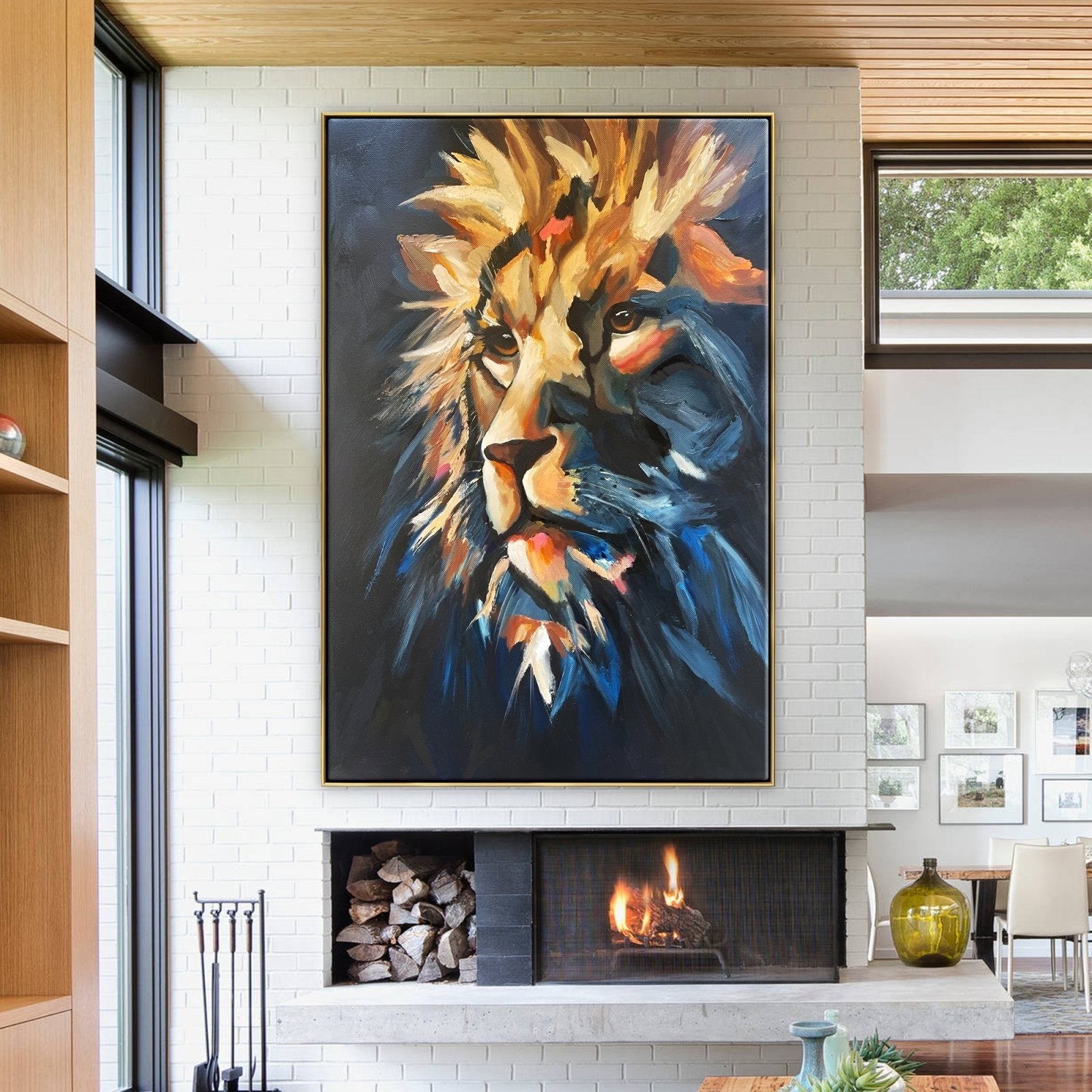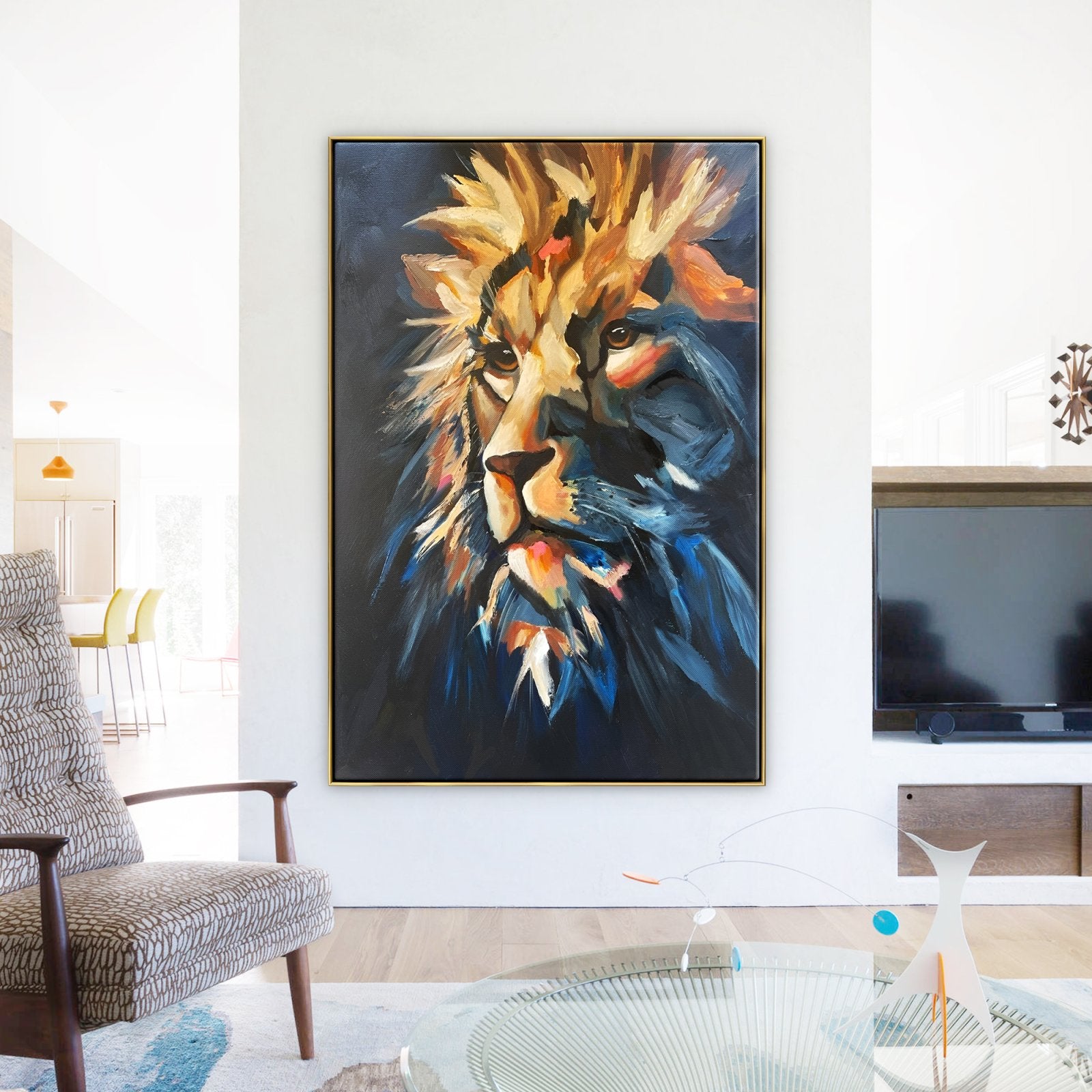 We'd like you to meet the true king of the jungle, Zarina! His friendly eyes show a lifetime of experience and leadership. With just a few brushstrokes his mighty manes are portrayed majestically, making it a beautiful addition to any home interior!