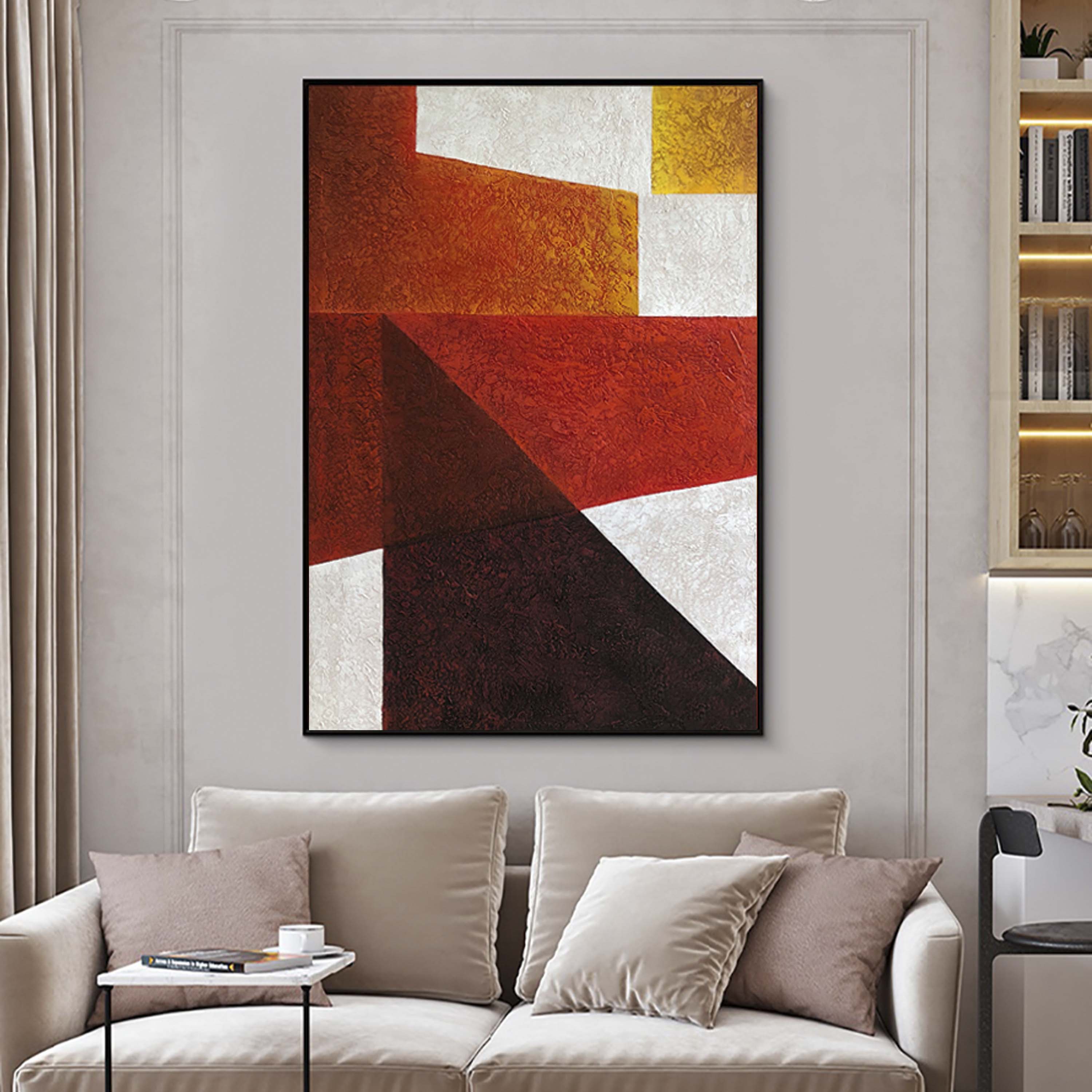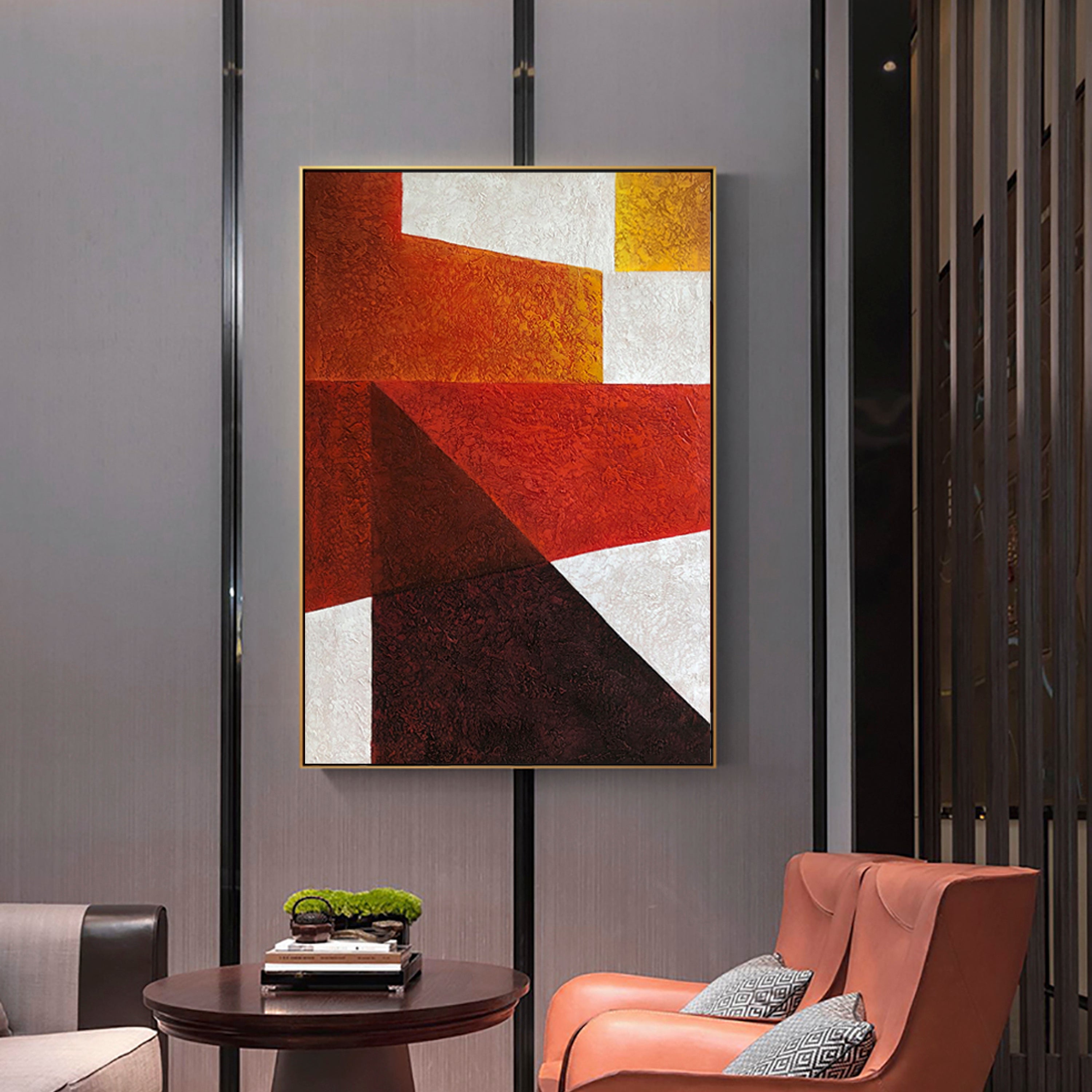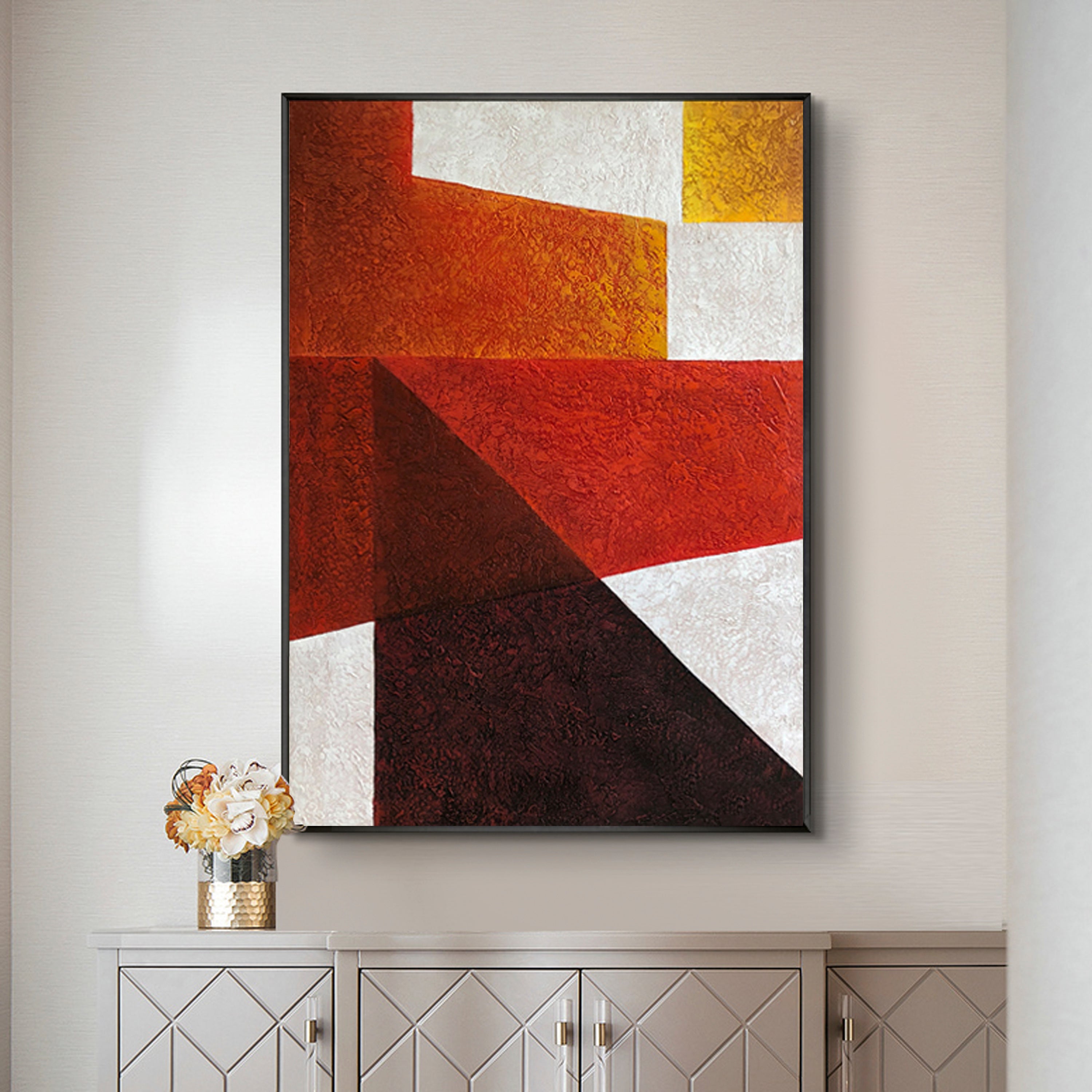 Dieses faszinierende, moderne Kunstwerk "Dimensional Shapes" zeigt uns die Raffinesse einer abstrakten Komposition, die wunderbar mit den verschiedenen Rottönen zusammenarbeitet, um ein stilvolles Kunstwerk zu schaffen, das sich perfekt für viele moderne Inneneinrichtungen eignet!!