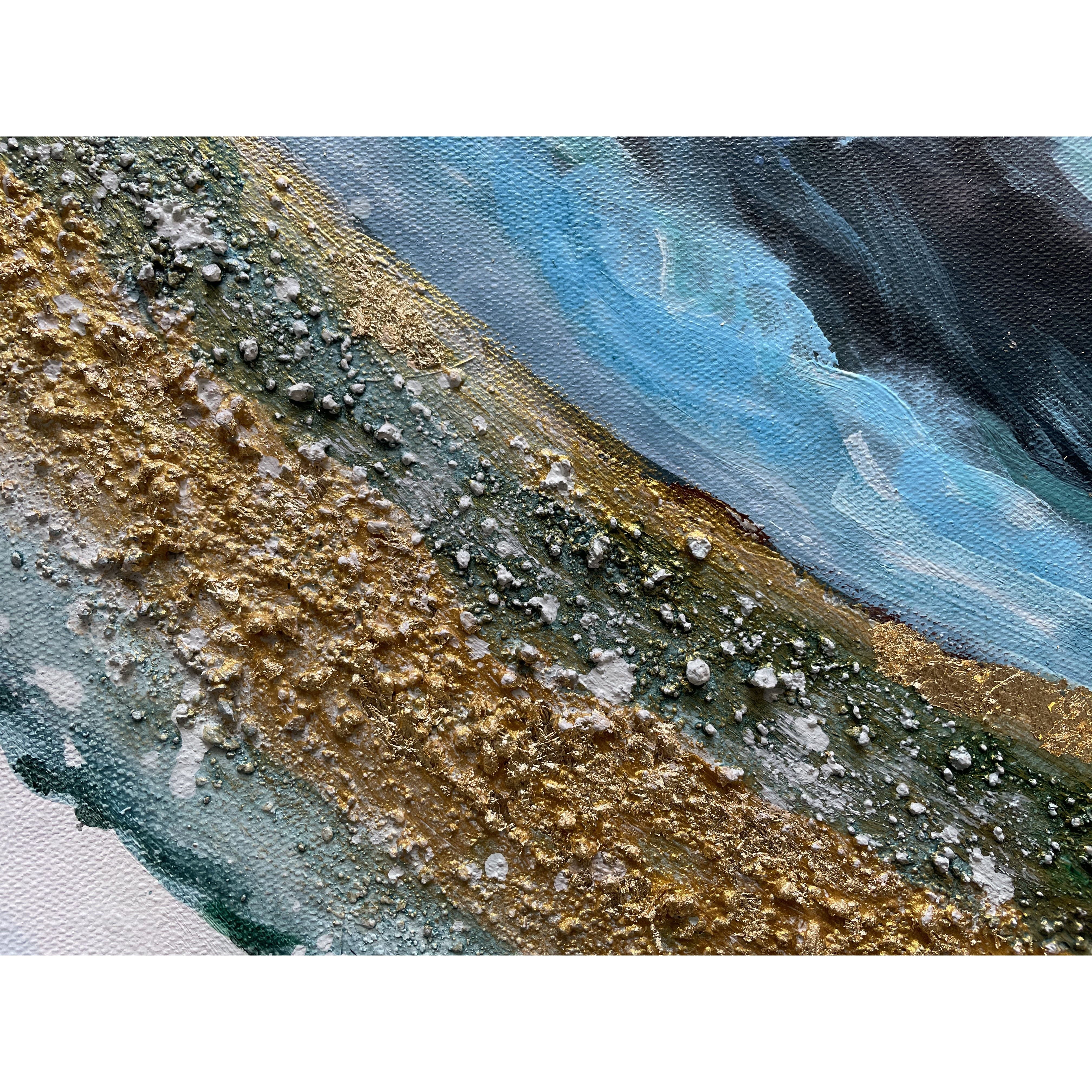 Was für ein prächtiges Stück ist das! Die verblüffend realistische Welle bricht majestätisch an die goldglänzende Küste. Durch die Verwendung mehrerer horizontaler Schichten und verschiedener überzeugender Blautöne hat dieses Gemälde auch eine große Tiefe.
