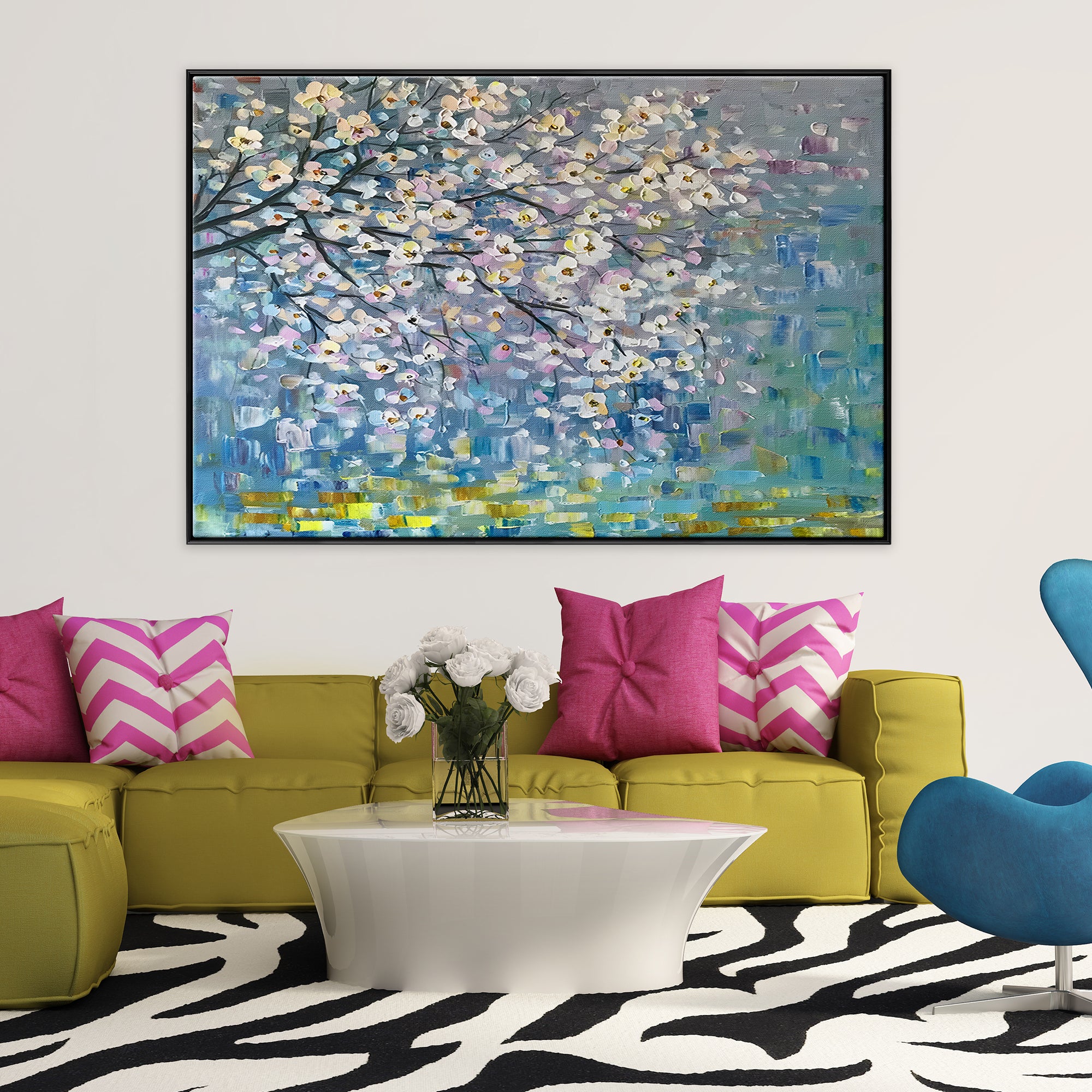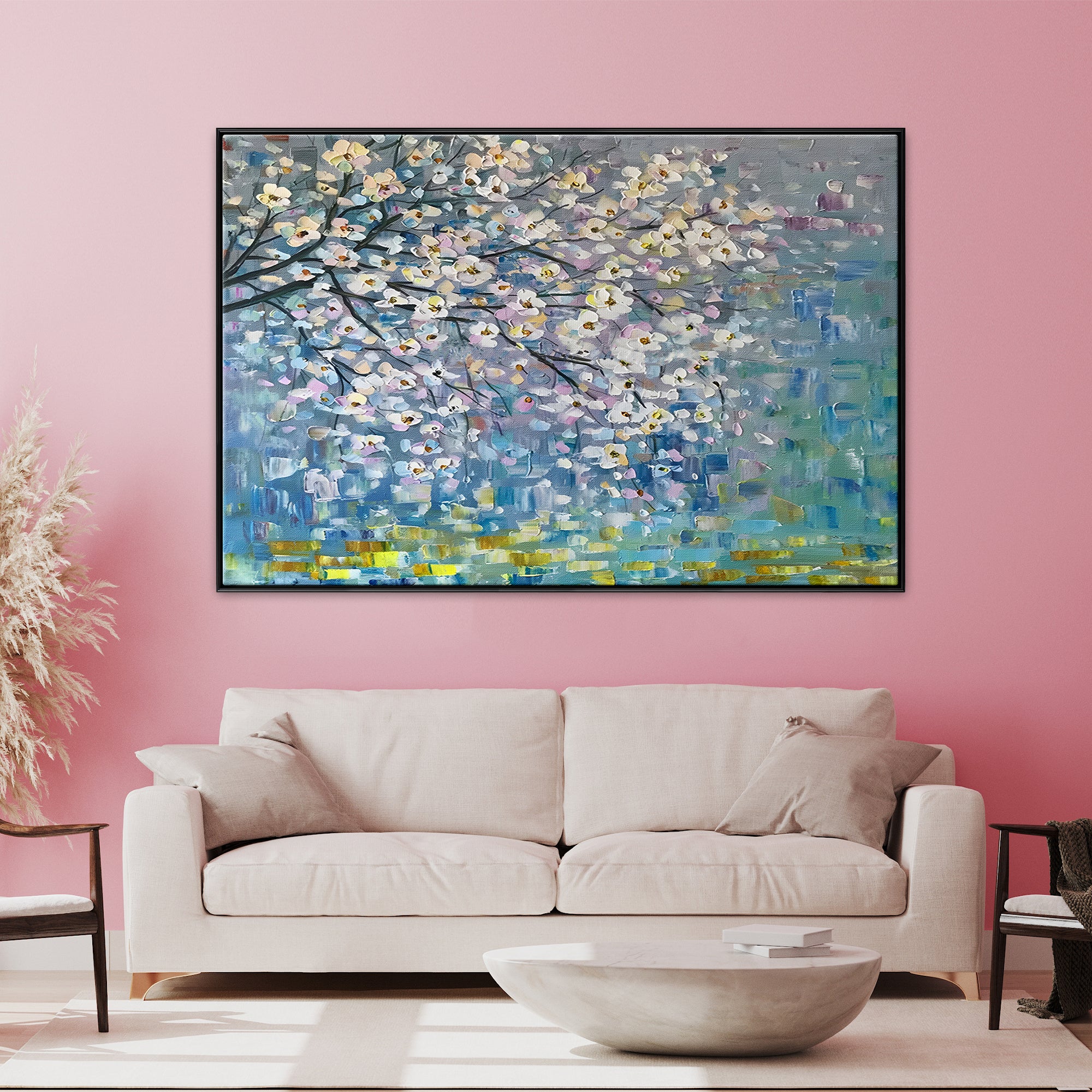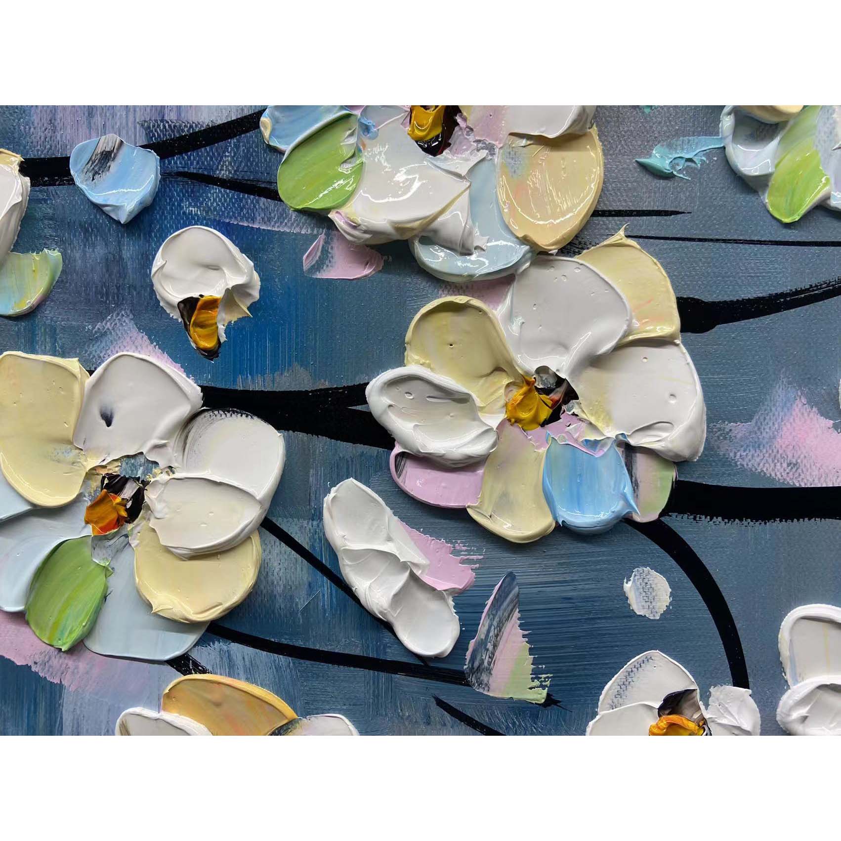 „Ikebana“ zeigt einen japanischen Baum mit bezaubernden weißen Blüten vor einem leuchtend blauen Hintergrund. Es fängt die ätherische Schönheit der Natur mit einem bezaubernden Touch ein, der Ihnen jedes Mal ein Lächeln entlocken wird, wenn Sie es betrachten!