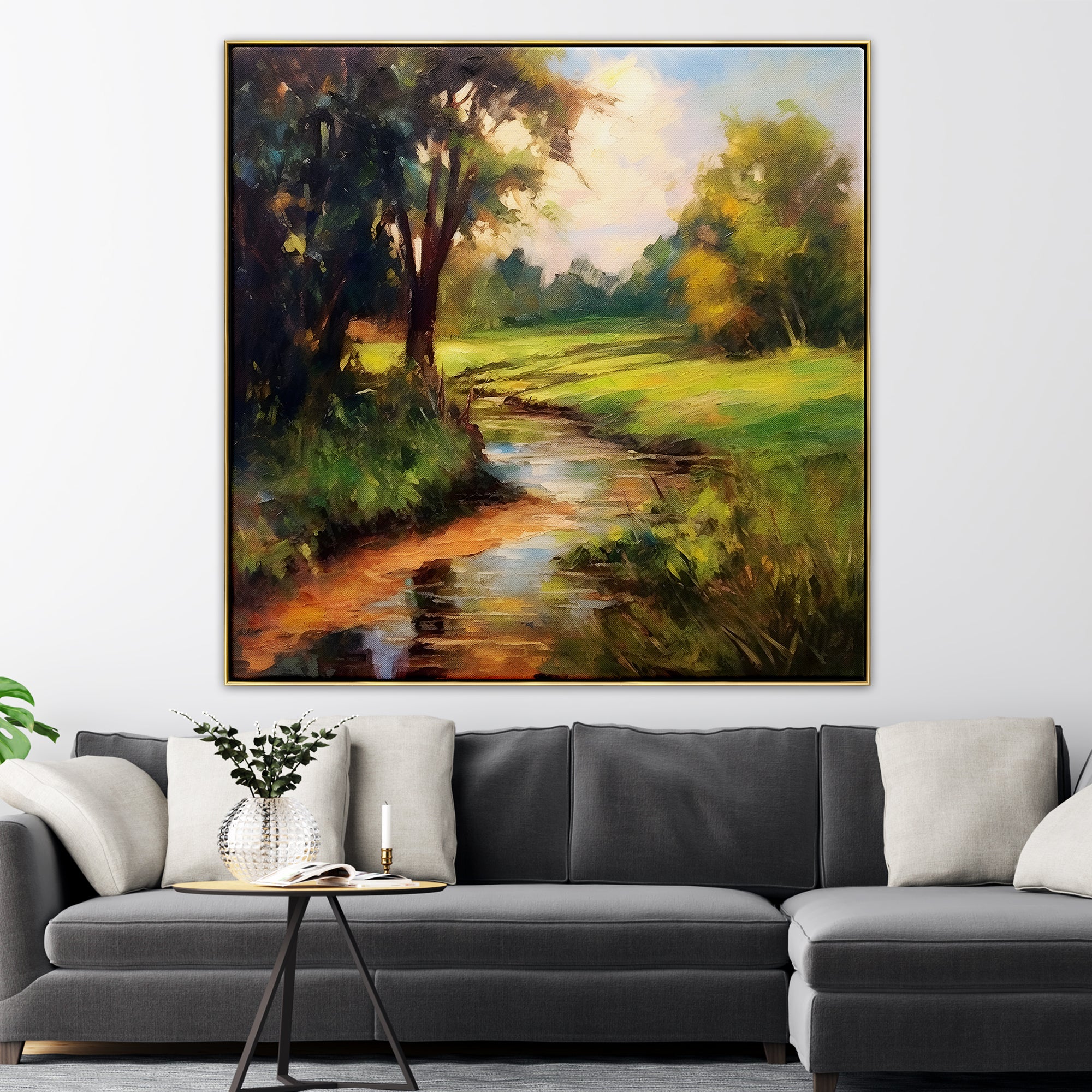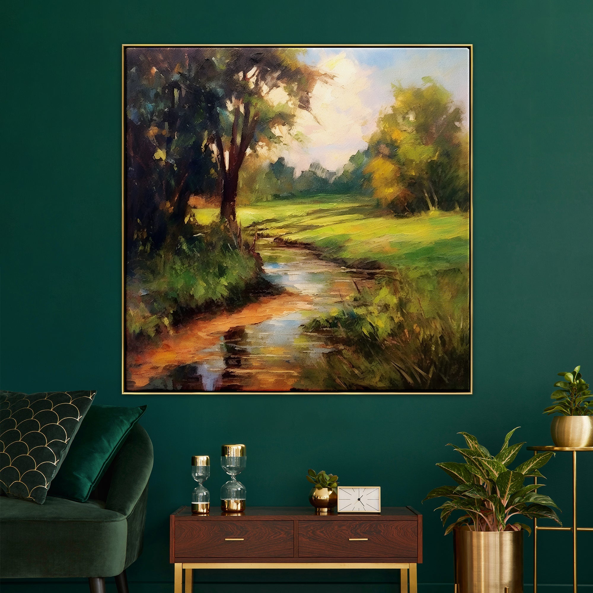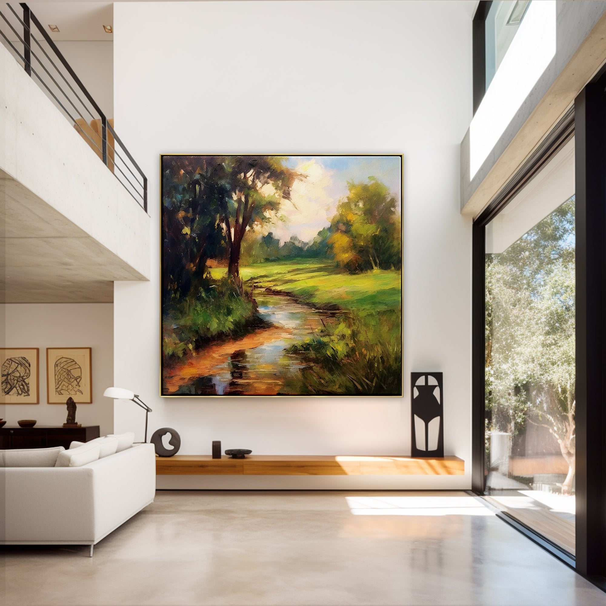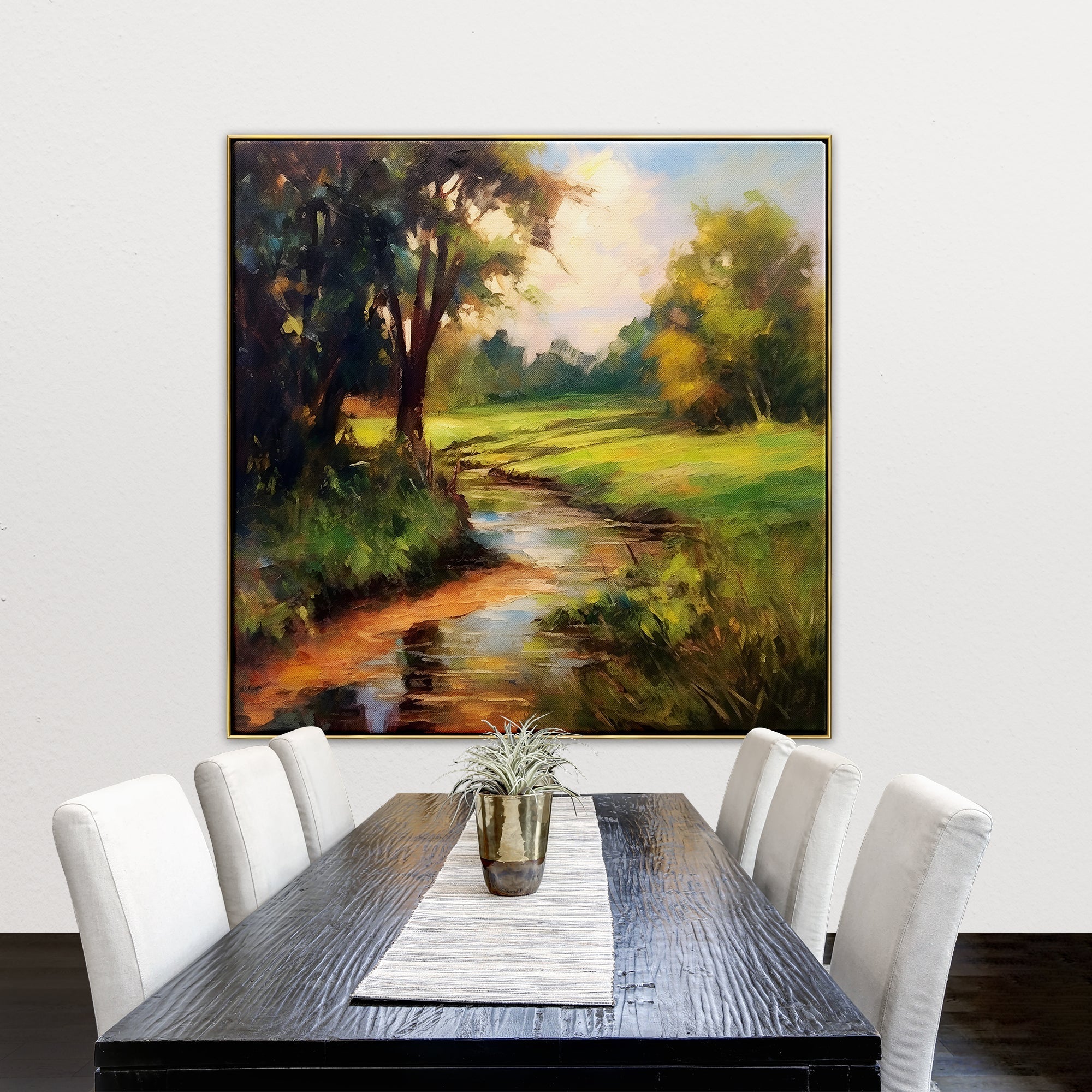 Among the trees, a gentle creek murmurs its secrets. This painting's hues and textures echo the forest's soul, inviting you to listen and immerse yourself in the serene symphony of nature.