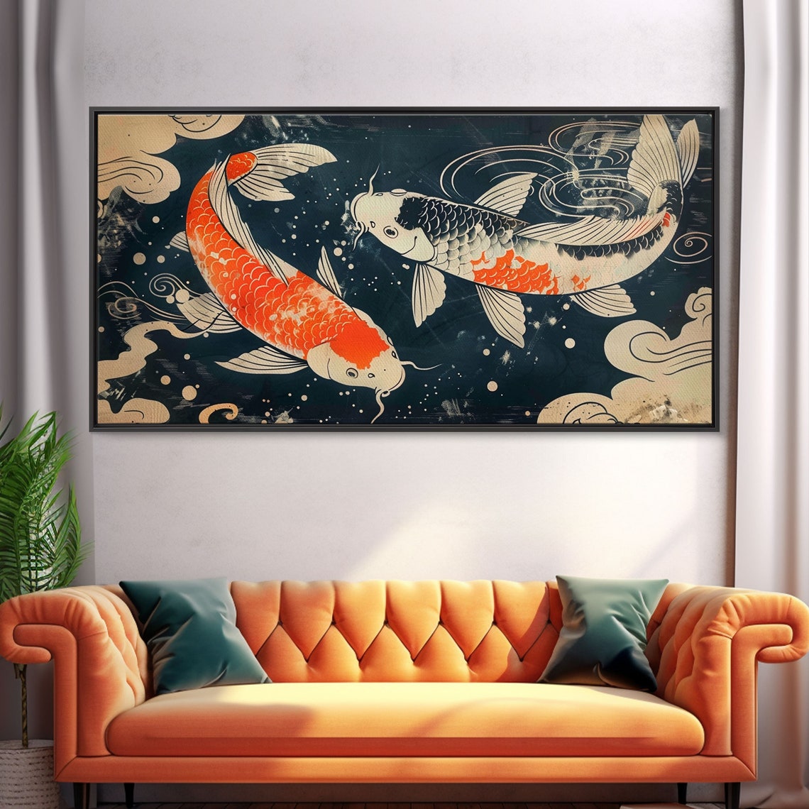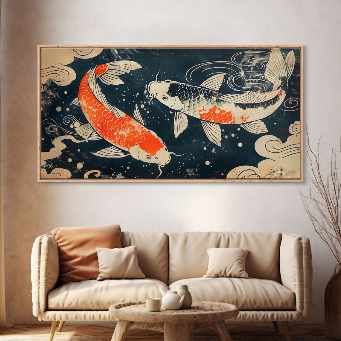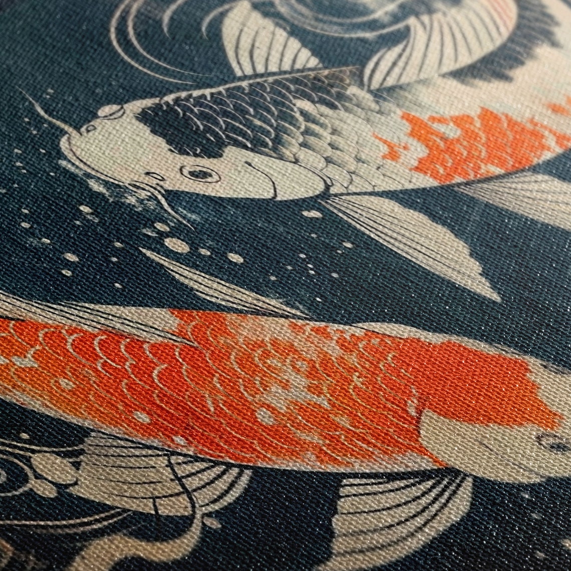 Nishikigoi is a dance of elegance and tradition. These koi fish, with their vibrant scales and graceful movements, symbolize harmony and perseverance. The deep blue background adds a tranquil charm, making this painting a timeless piece to inspire calm and balance in any room.