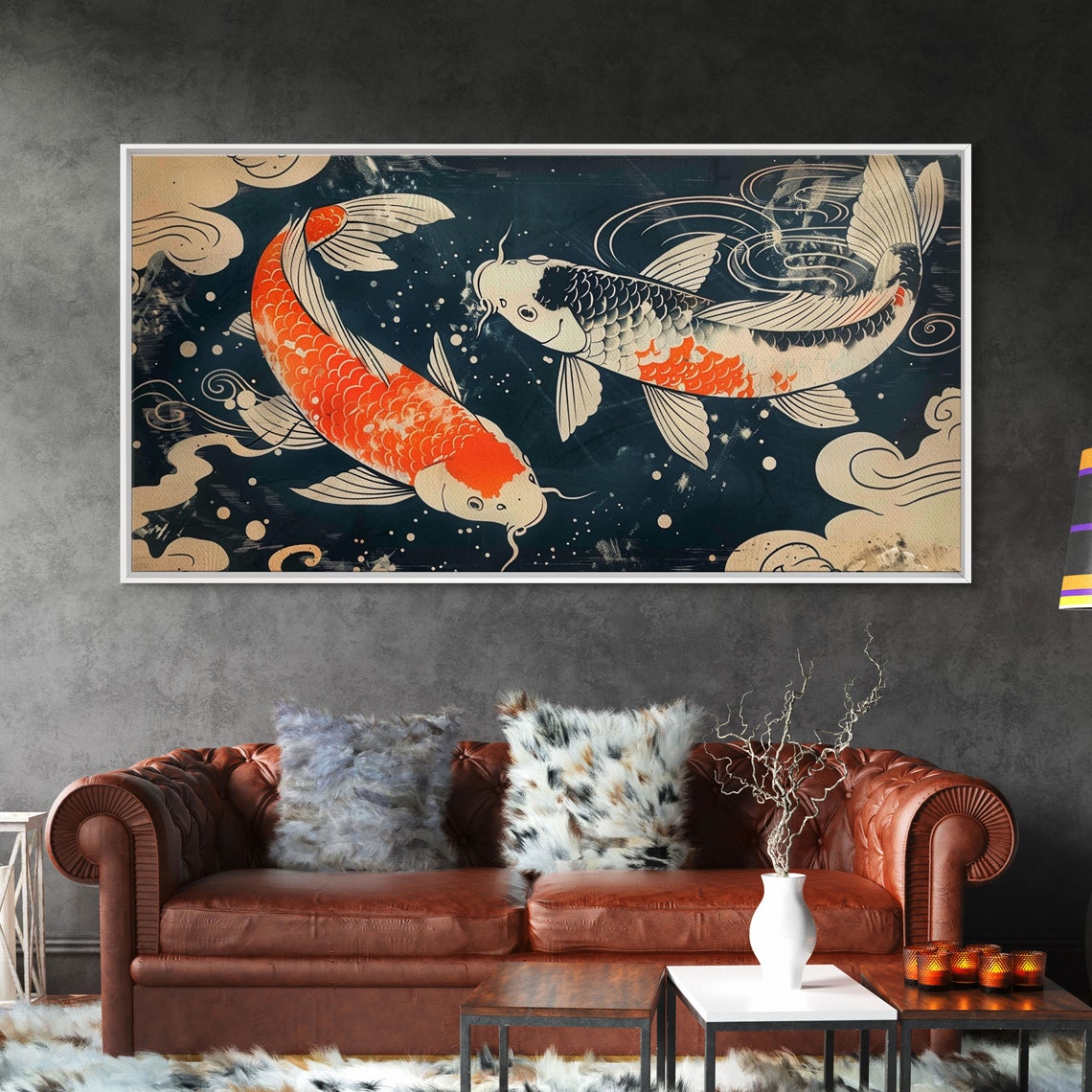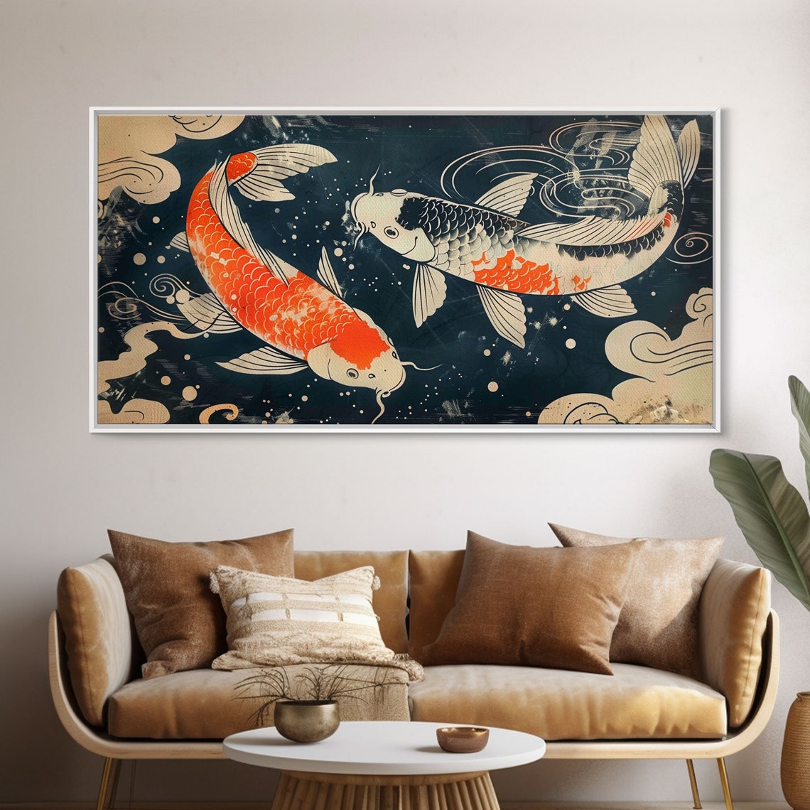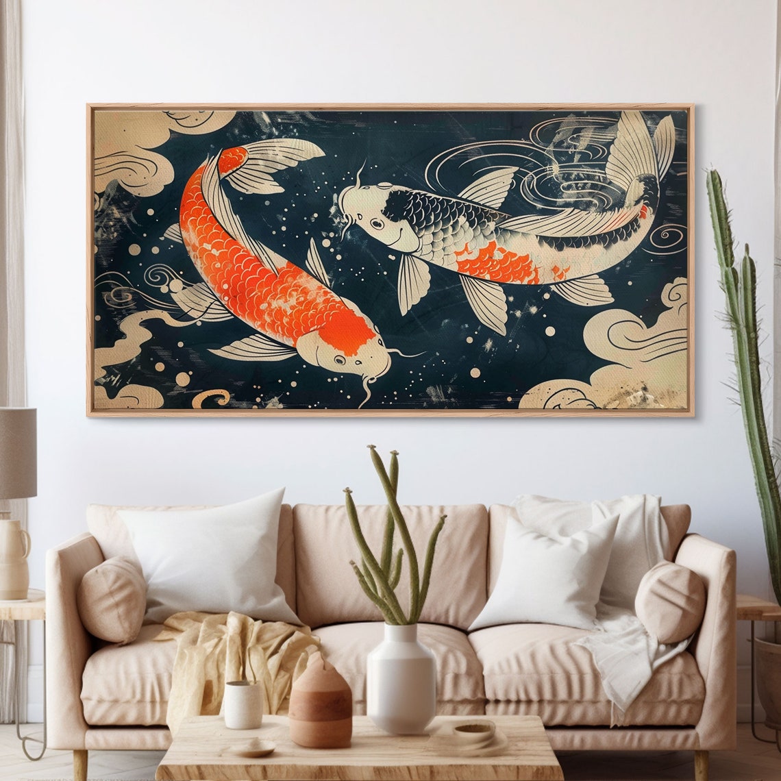 Nishikigoi is a dance of elegance and tradition. These koi fish, with their vibrant scales and graceful movements, symbolize harmony and perseverance. The deep blue background adds a tranquil charm, making this painting a timeless piece to inspire calm and balance in any room.