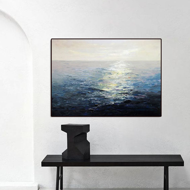 Glittering sunlight reflecting beautifully on the dark, blue sea... What a sight to behold! This fantastic realism artwork portrays the astonishing beauty of an idyllic ocean sunrise! Its realistic color scheme makes this piece suited for many types of home interiors!
