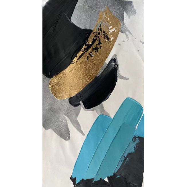 Reverie" captivates with its striking interplay of gold, black, and turquoise. This unique abstract piece adds a touch of refined elegance and mystery to any space. Ideal for modern interiors, it sparks joy and imagination, transforming your space into a gallery of inspiration.