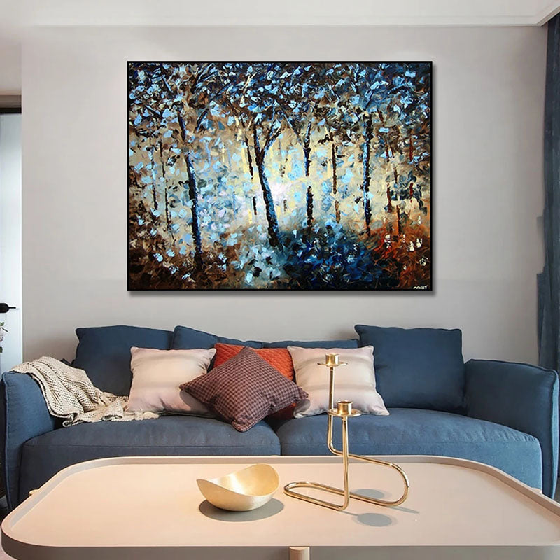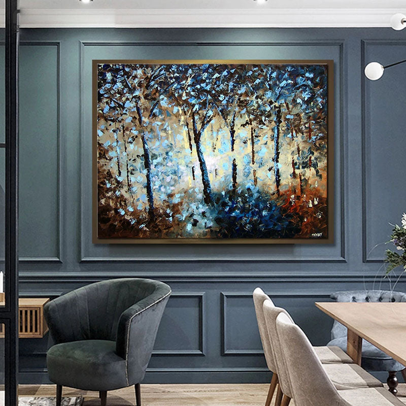 ¡Este bosque se siente vivo! El destello de luz que se filtra entre los árboles parece contar historias inéditas. Los azules profundos y los tonos terrosos crean una atmósfera de otro mundo, perfecta para añadir un toque de magia serena a tu espacio.