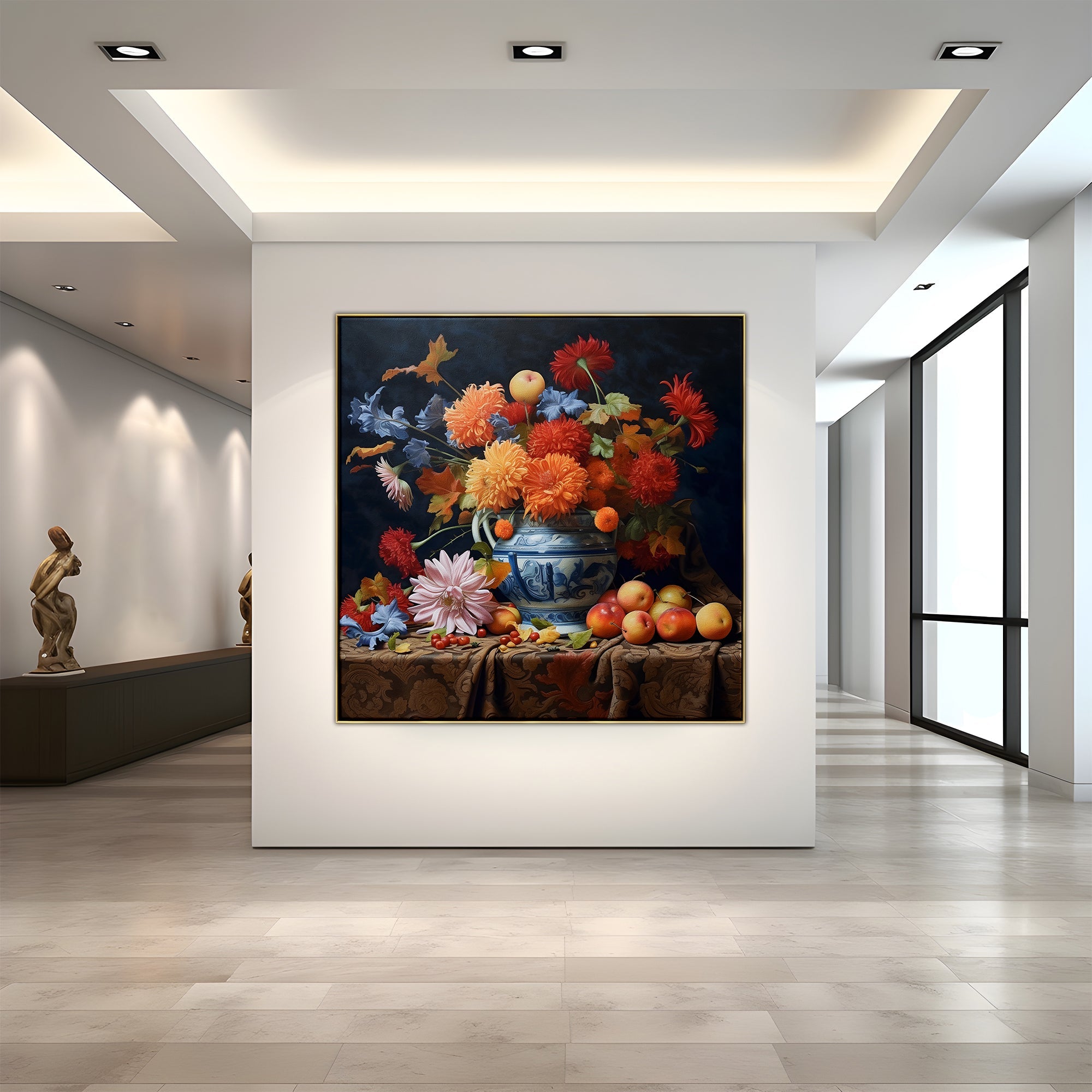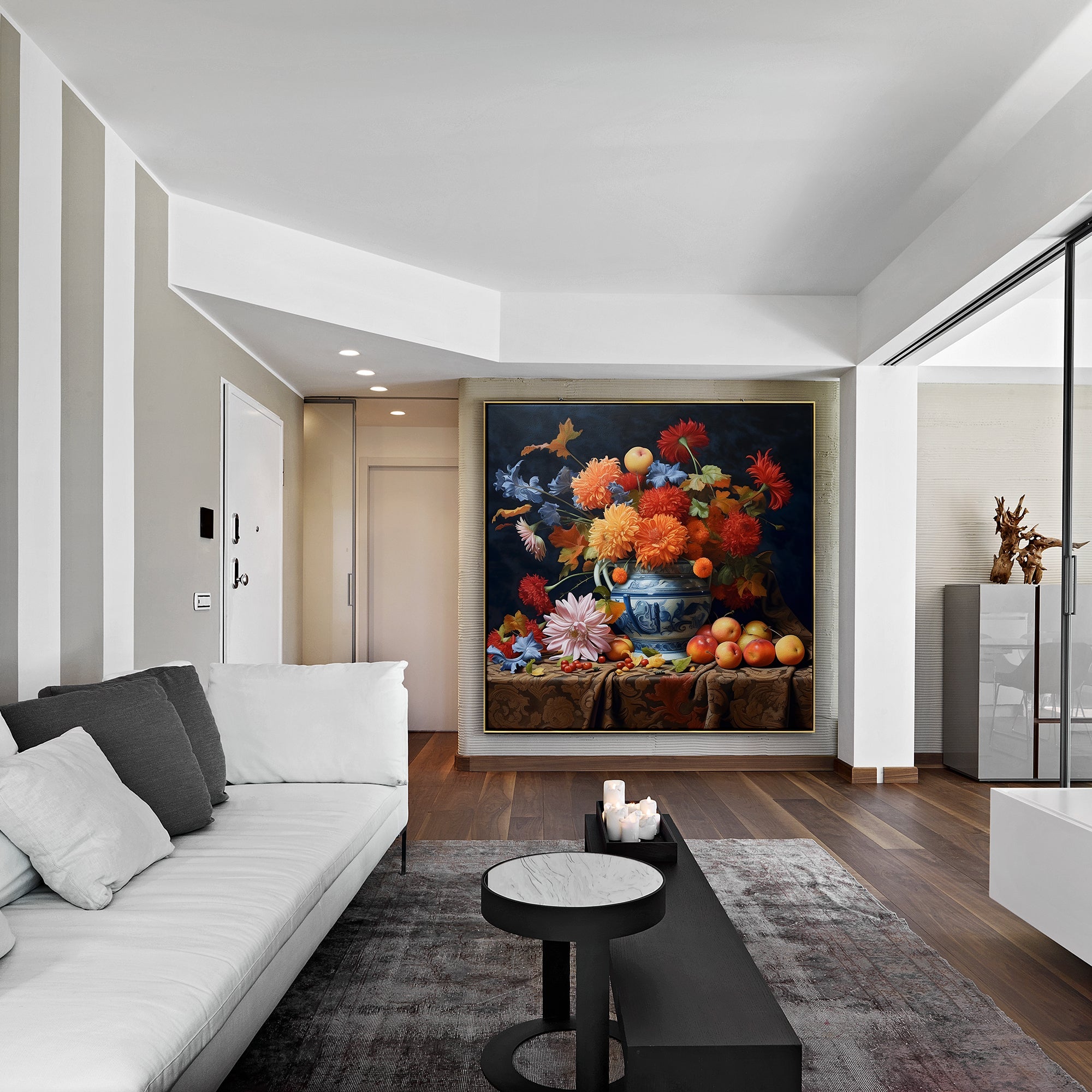 "Ramo Francés" es una sinfonía visual de lo mejor de la naturaleza. Esta composición de flores y frutas crea una melodía armoniosa que celebra la belleza atemporal de los placeres sencillos de la vida con un intrincado estilo realista.