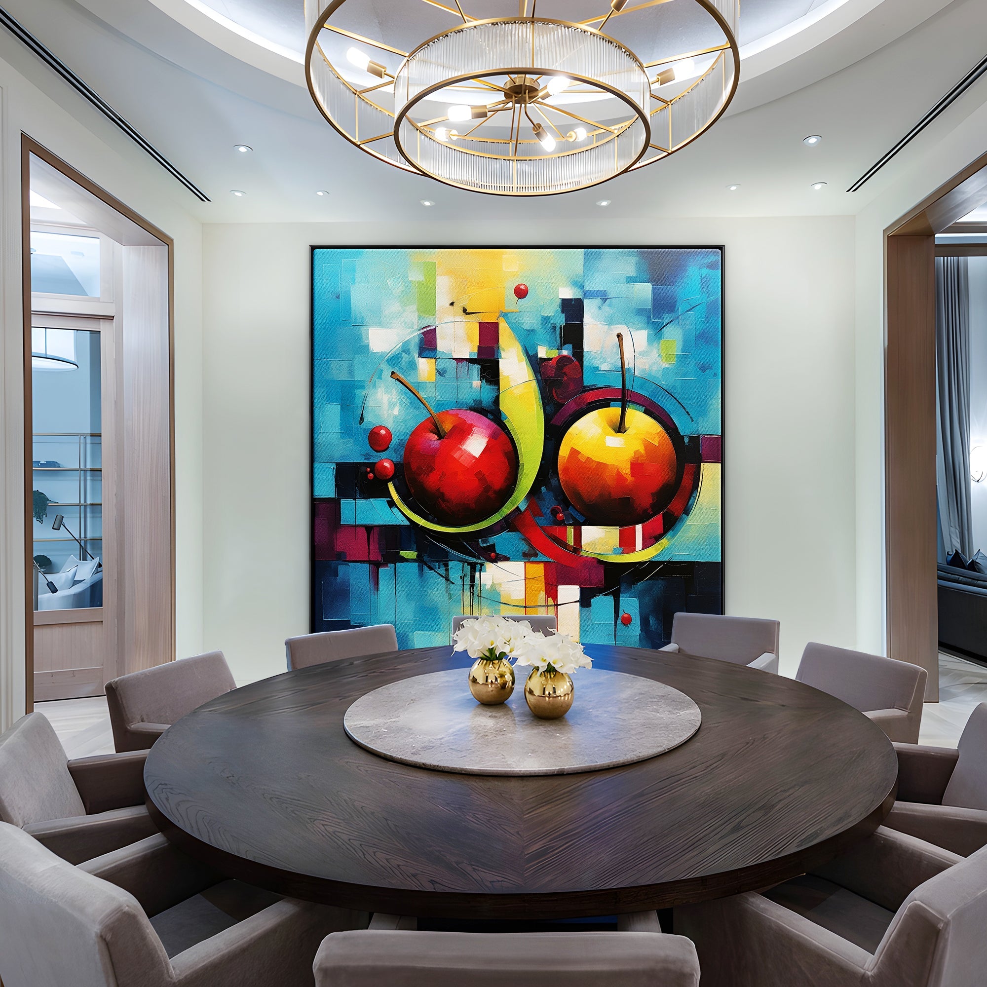 Esta moderna obra, «Bodegón Futurista», adopta una estética futurista en un entorno clásico. Dos manzanas, protagonistas de este bodegón, desafían la tradición, reflejando innovación y simplicidad.