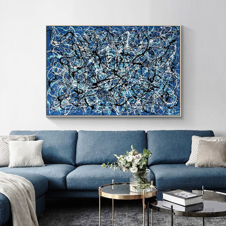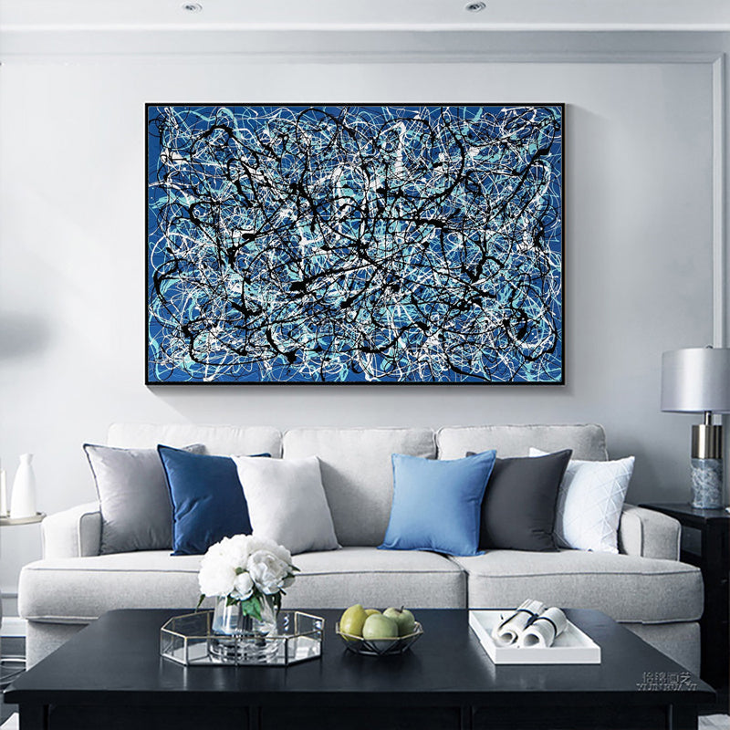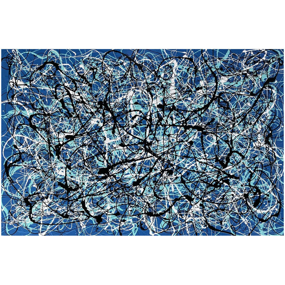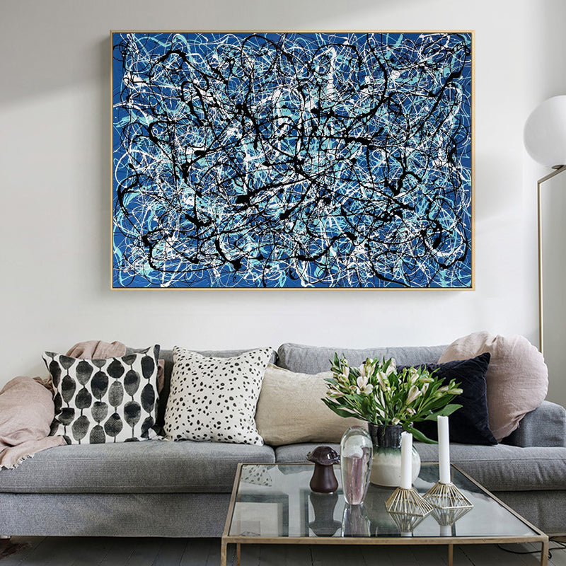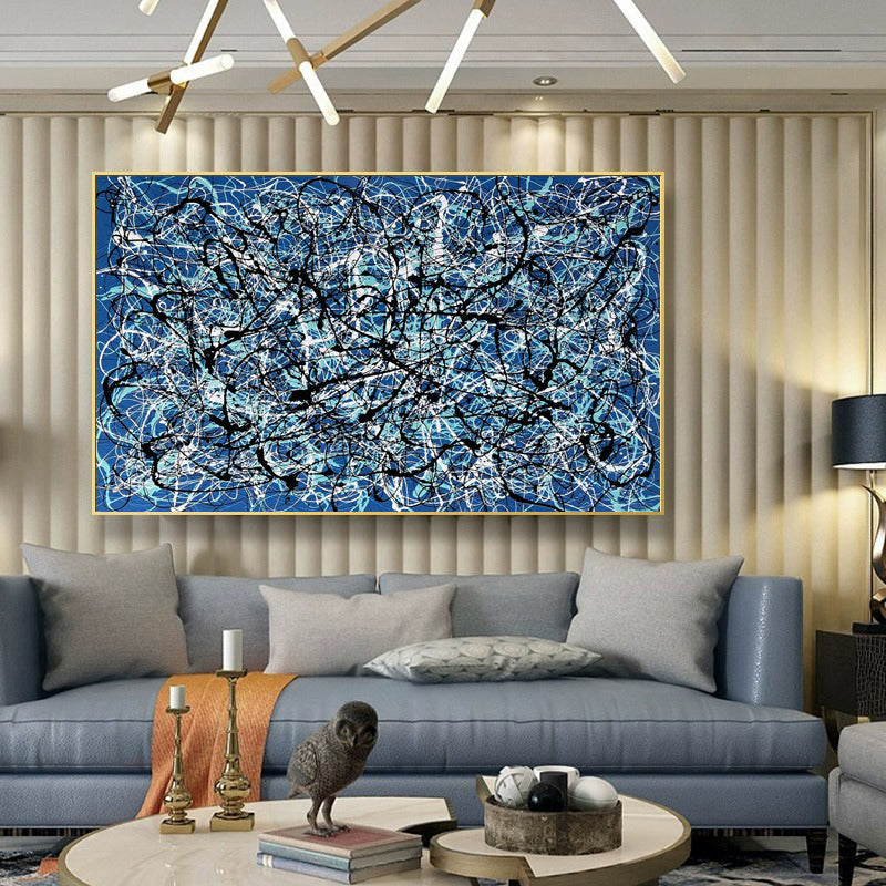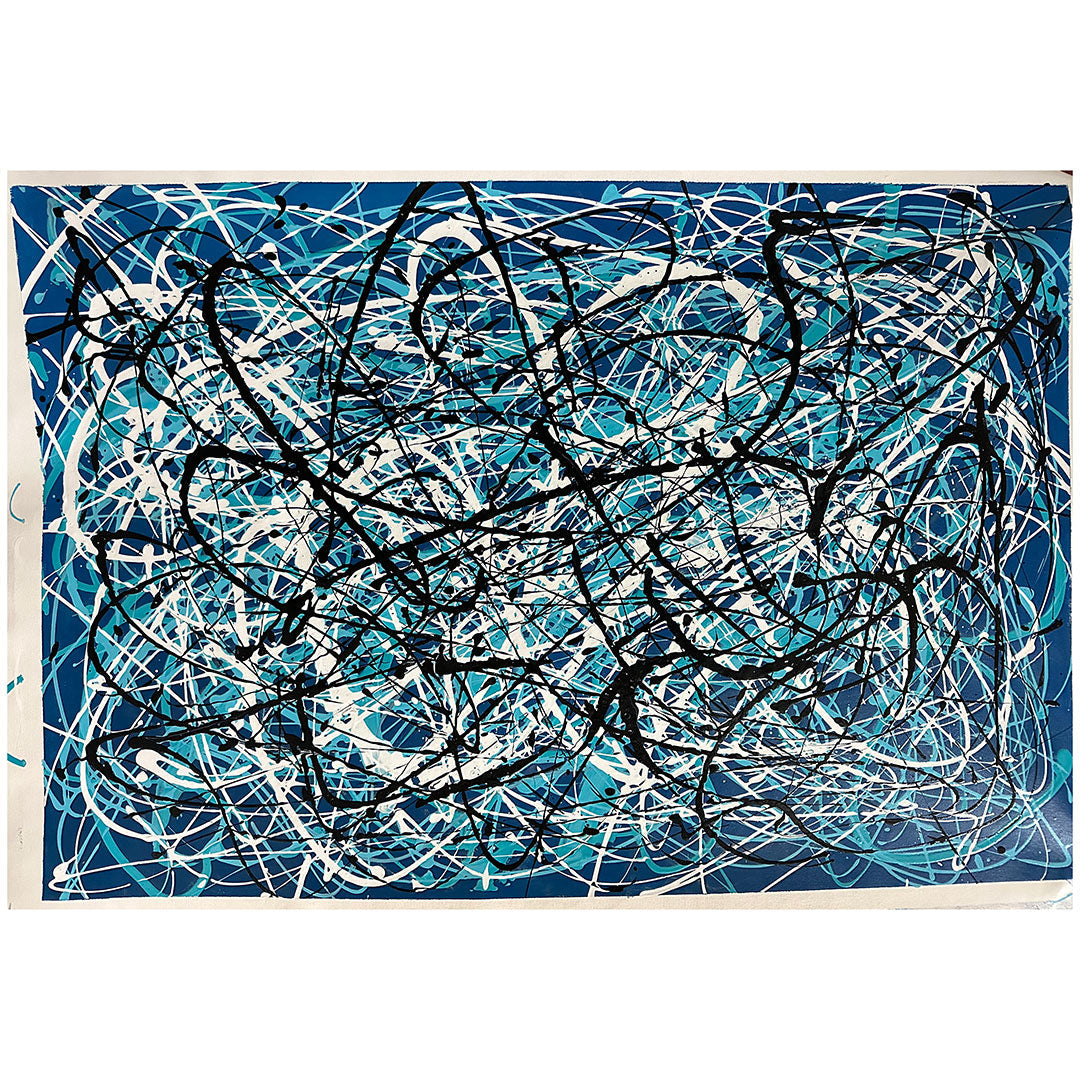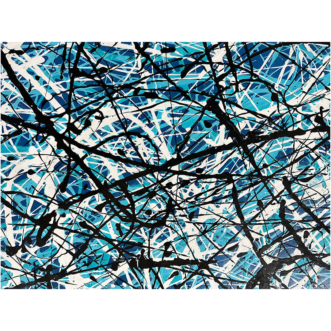 En el cautivador lienzo de "Lost", un hermoso fondo azul envuelve una coreografía única. Vívidas líneas blancas y negras danzan a lo largo de la dinámica composición, evocando una sensación de asombro, como si se caminara por el laberinto de lo desconocido.