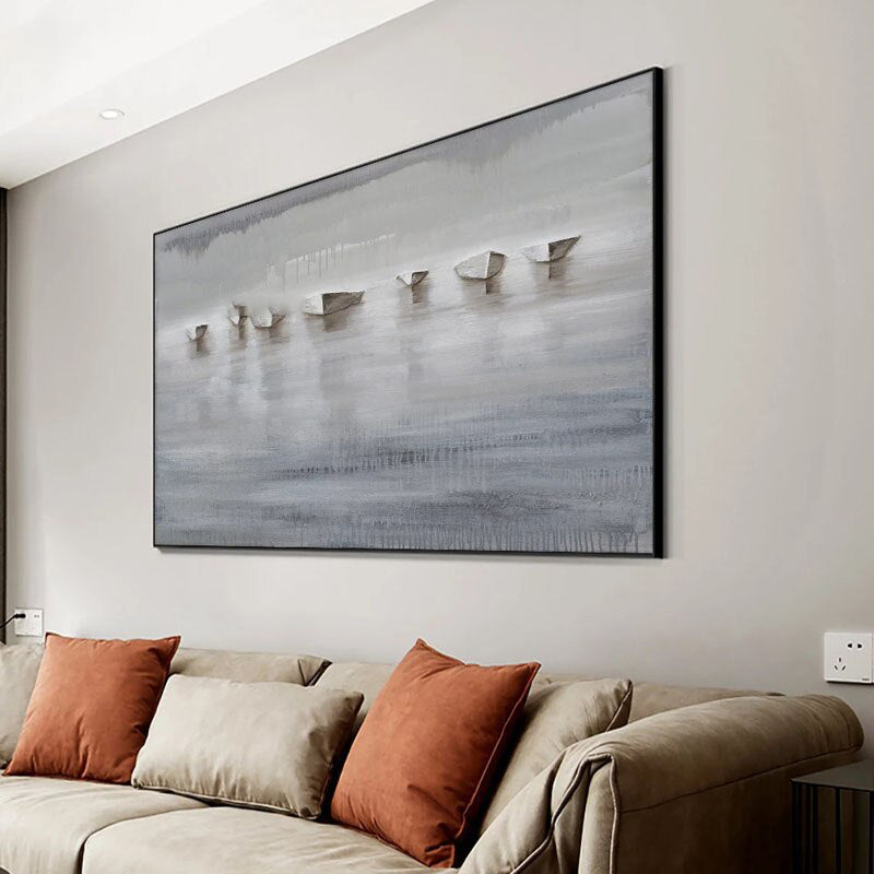 Barcos Brumosos susurra una historia de aguas tranquilas y misterios silenciosos. ¿Por qué están vacíos estos barcos? Los tonos serenos y la niebla etérea invitan a infinitas interpretaciones. Esta cautivadora pintura transforma tu espacio en un remanso de paz, haciendo que cada mirada se sienta como una invitación a soñar más allá de la niebla.