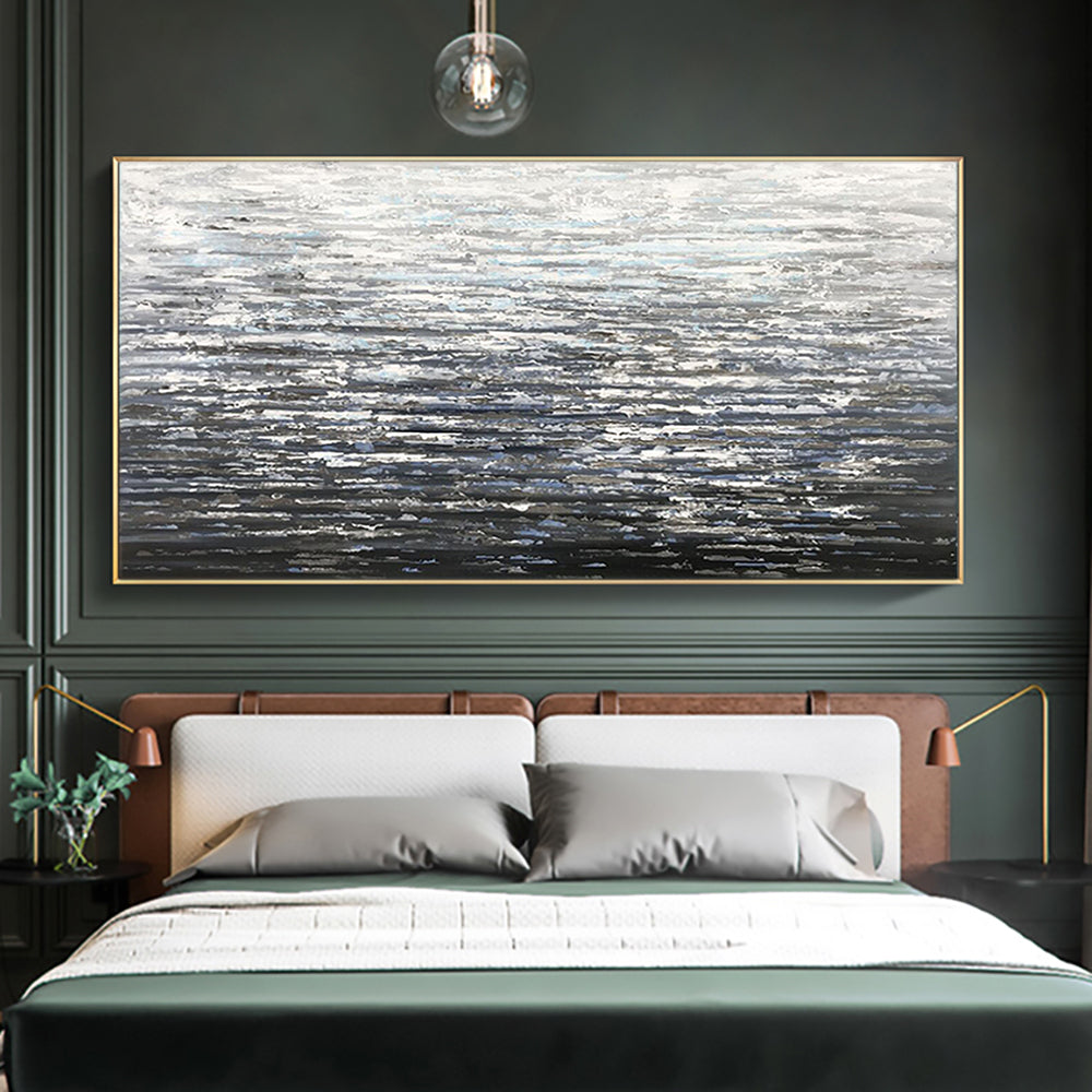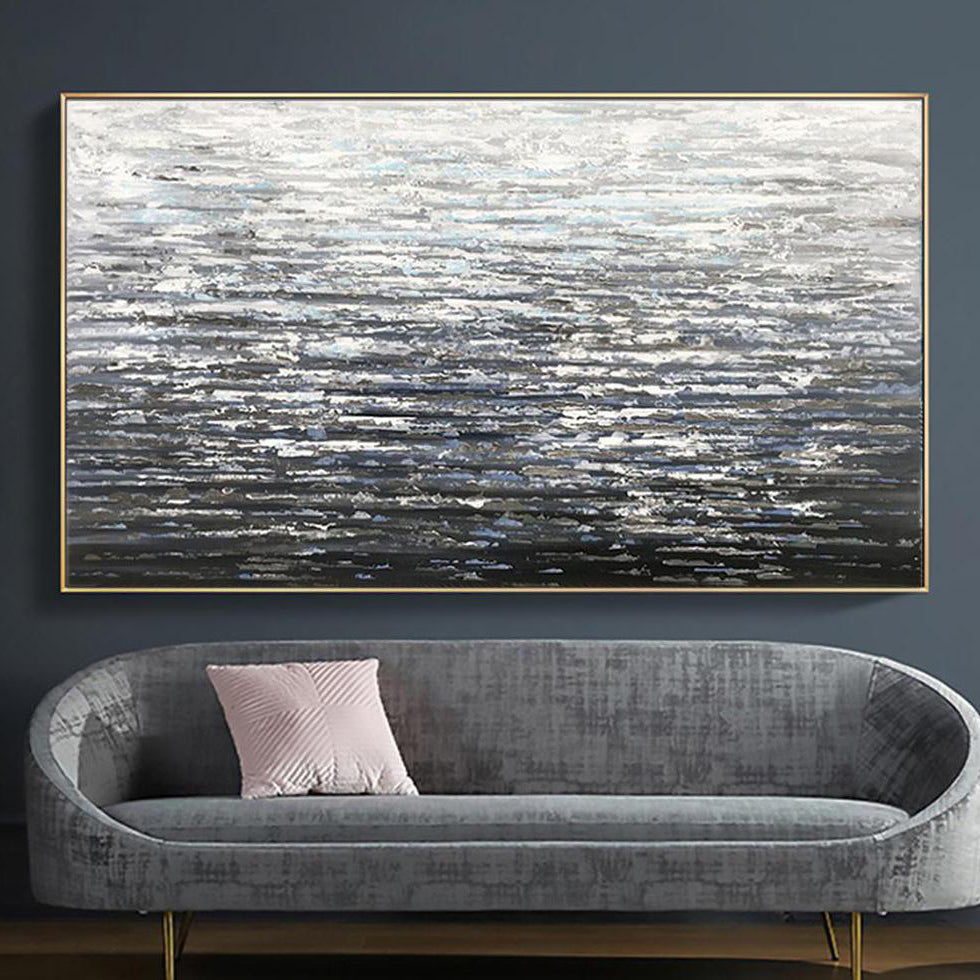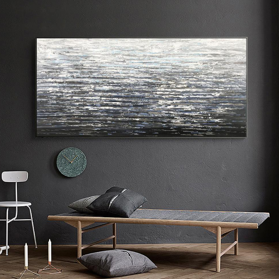 Esta hermosa obra de arte de gran tamaño representa impresionantes líneas horizontales grises. Juntos, crean una brillante ola de contraste, como una superficie brillante. ¡Con el uso de colores principalmente sutiles, esta obra de arte única se adaptará a cualquier tipo de interior de casa!