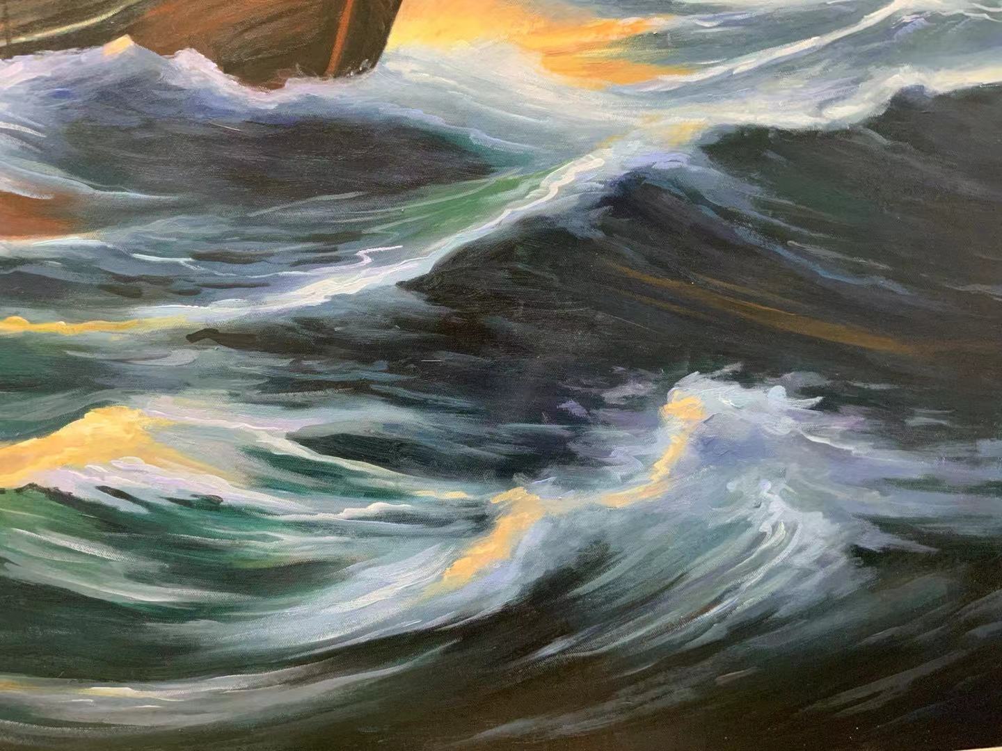 Con el viento a favor y el sol poniente en el horizonte, "El Pionero" se embarca en una aventura. Ninguna tormenta es demasiado grande ni ningún viaje demasiado difícil para este imponente barco, que llena el lienzo con una grandeza épica.