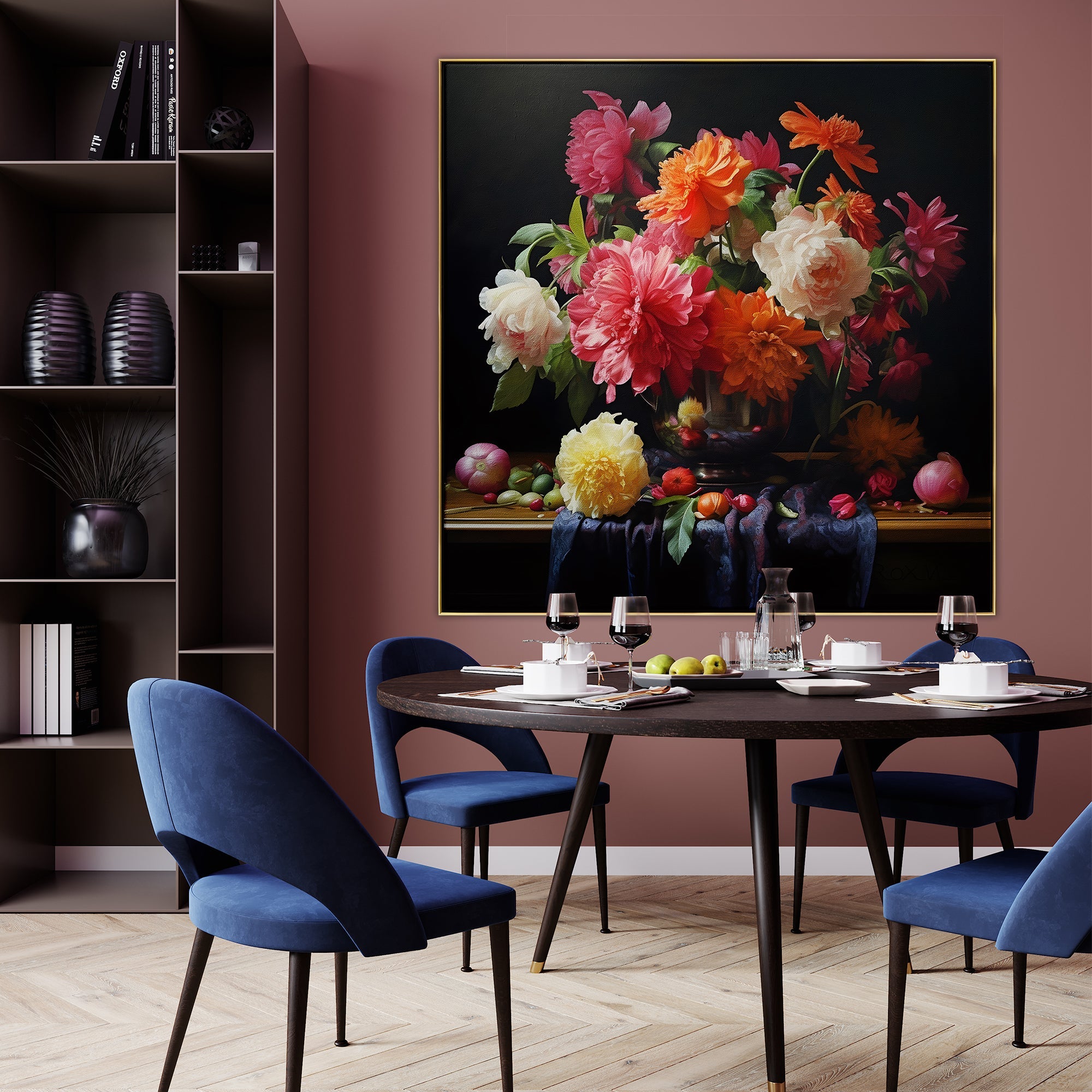 ¡Estas flores nunca se marchitan! Esta hermosa obra de arte muestra flores vívidas en un impresionante estilo realista. Debido al fondo negro, los colores vibrantes resaltan aún más, ¡lo que lo convierte en un atractivo para cualquier espacio!