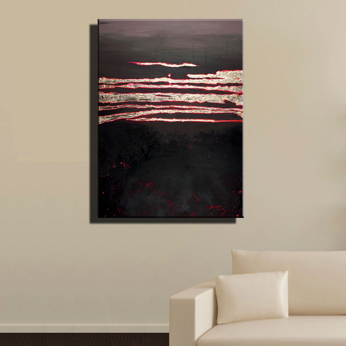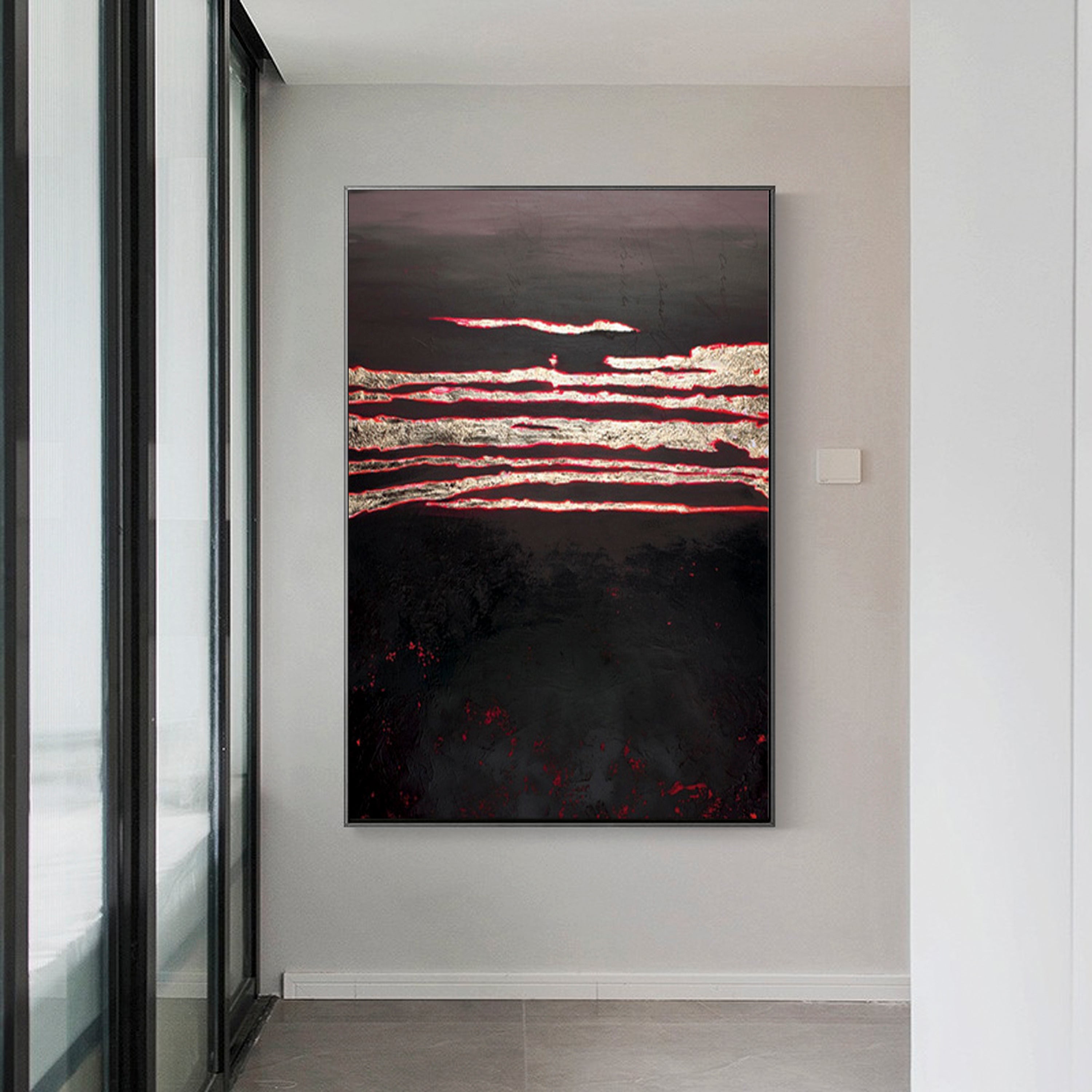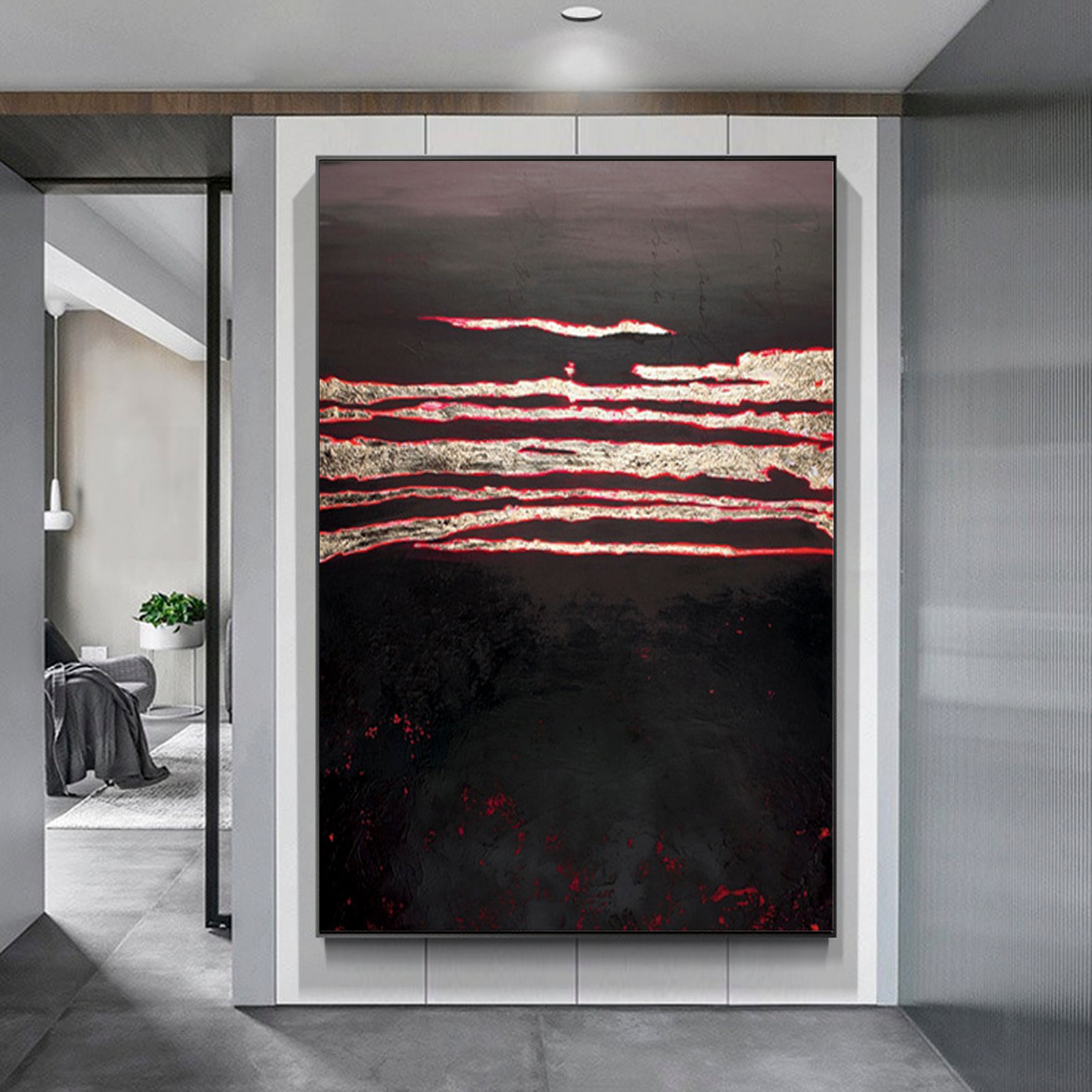 The charred ground opens up, and hot lava streams pour out! The charcoal-black colors work together beautifully with the dark red strokes of paint. Also, its subtle composition makes this painting suited for many different home interiors! ⁠