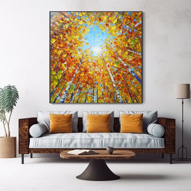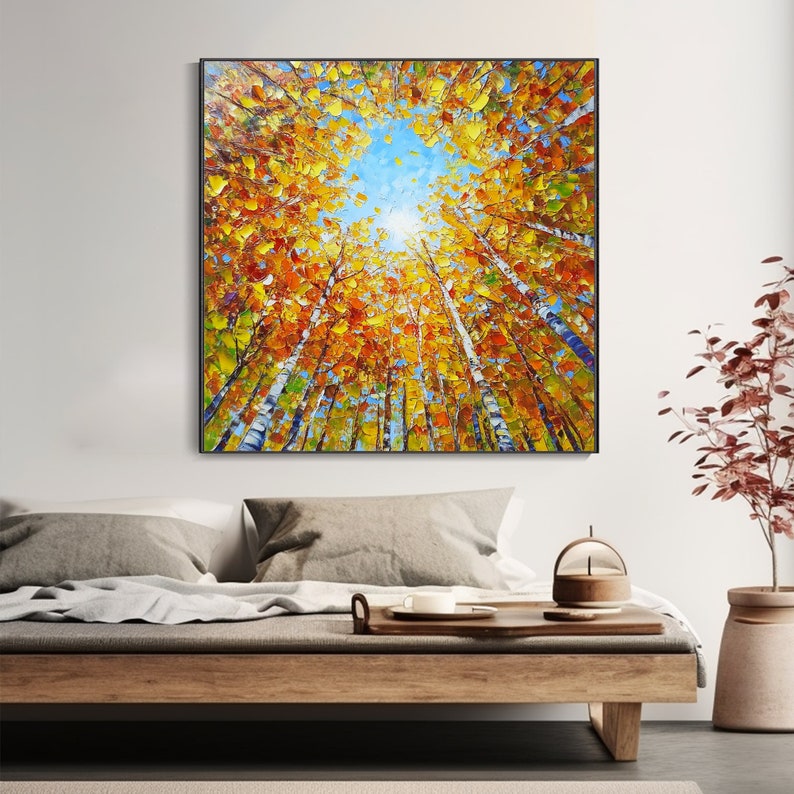 Feel the warmth of Basking Light as sunlight shines through a canopy of autumn trees. The vibrant orange and yellow leaves seem to glow against the sky, drawing you in. It's a painting that brings energy, brightness, and good vibes to any home interior.