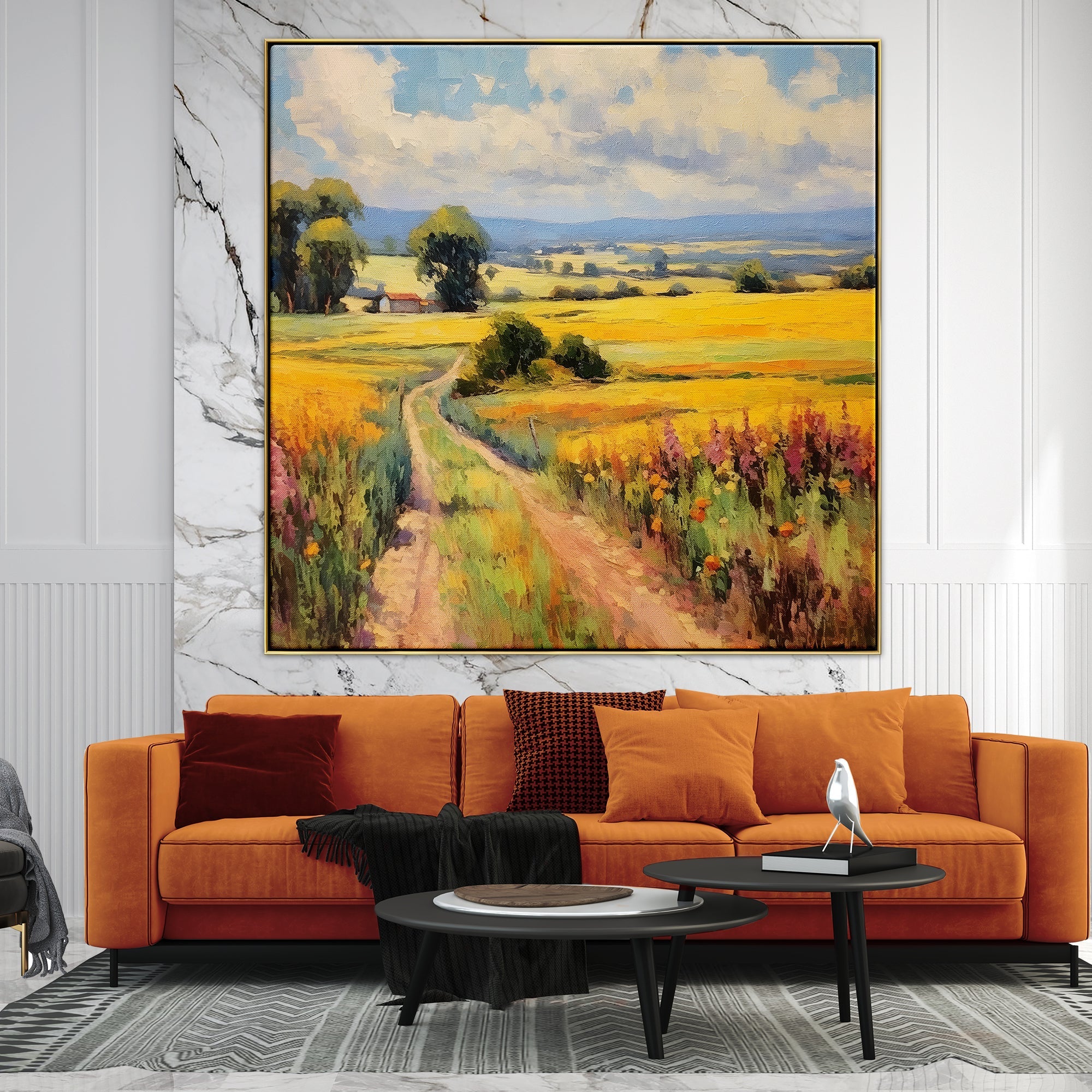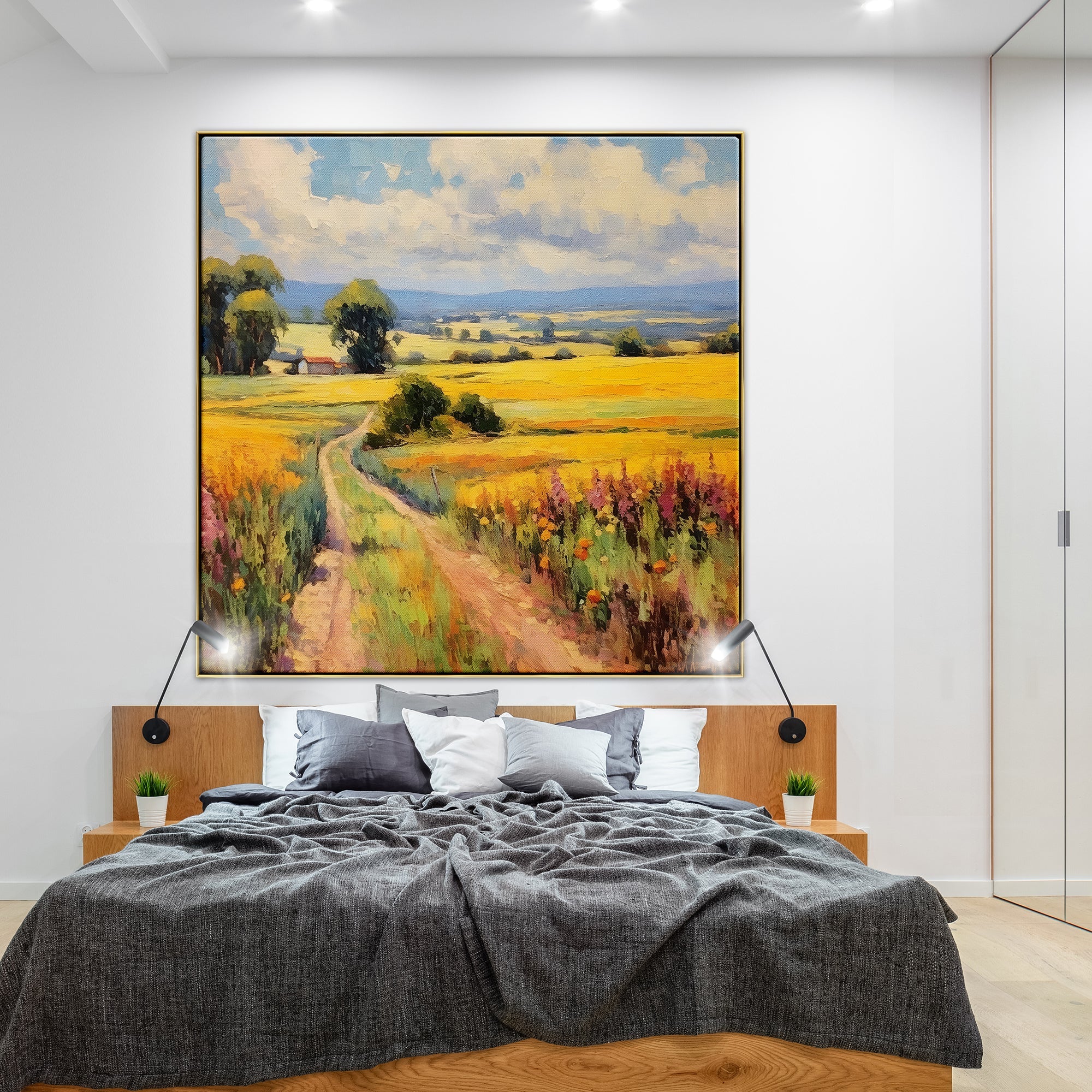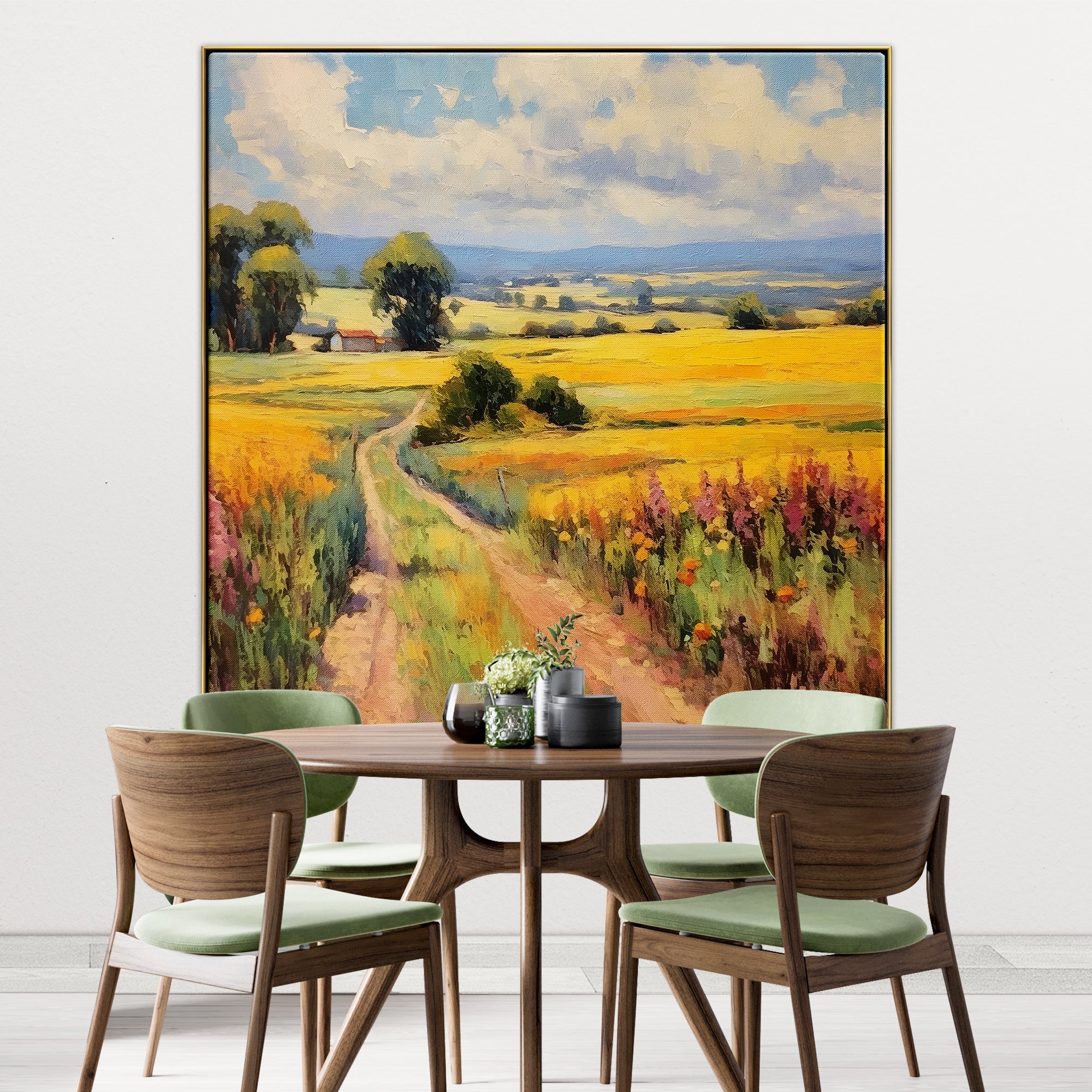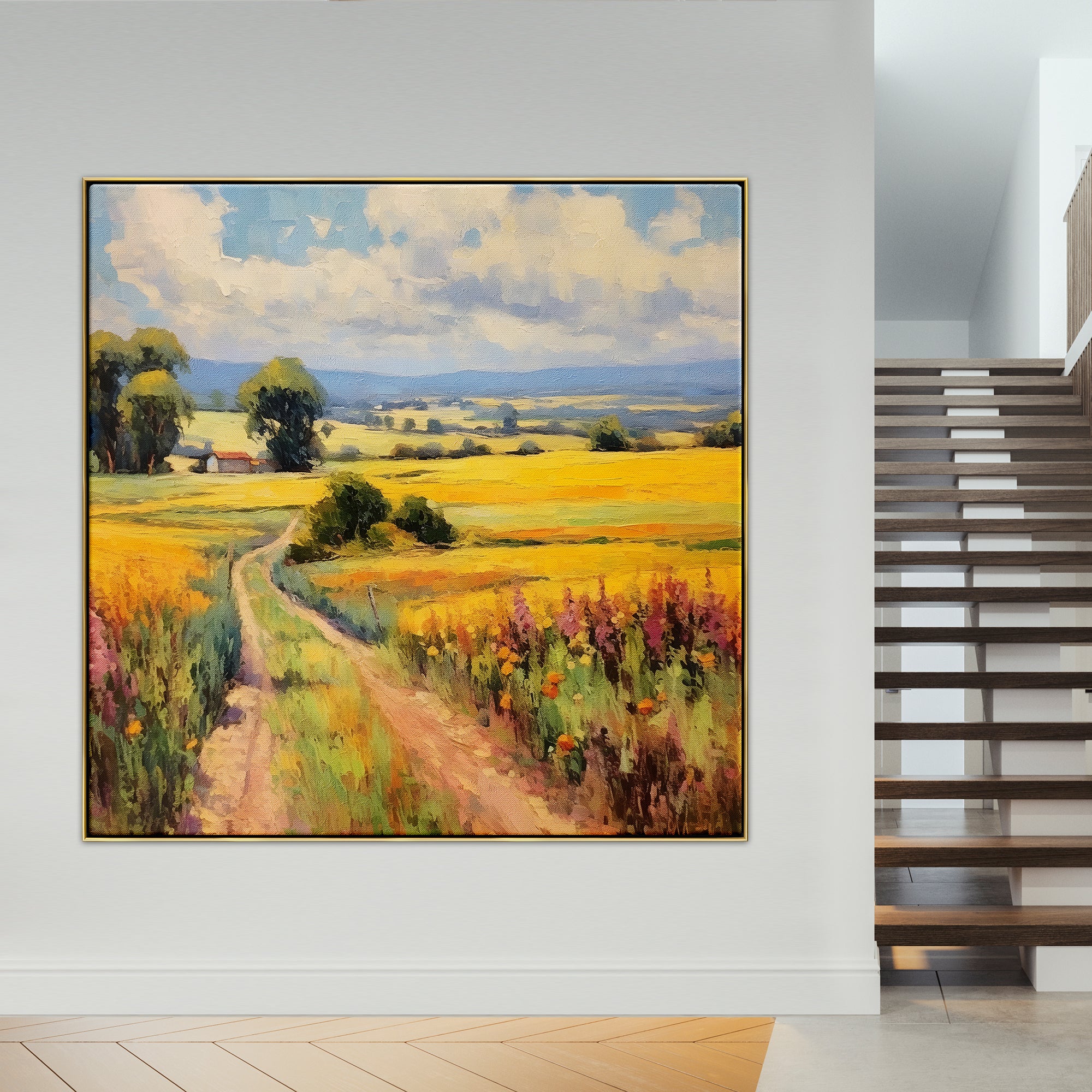 Beneath the canvas of clouds, "Cordes-sur-Ciel' showcases a wheat field's rich tones. This painting captures the vivid beauty of nature in every stroke and takes you to better places.