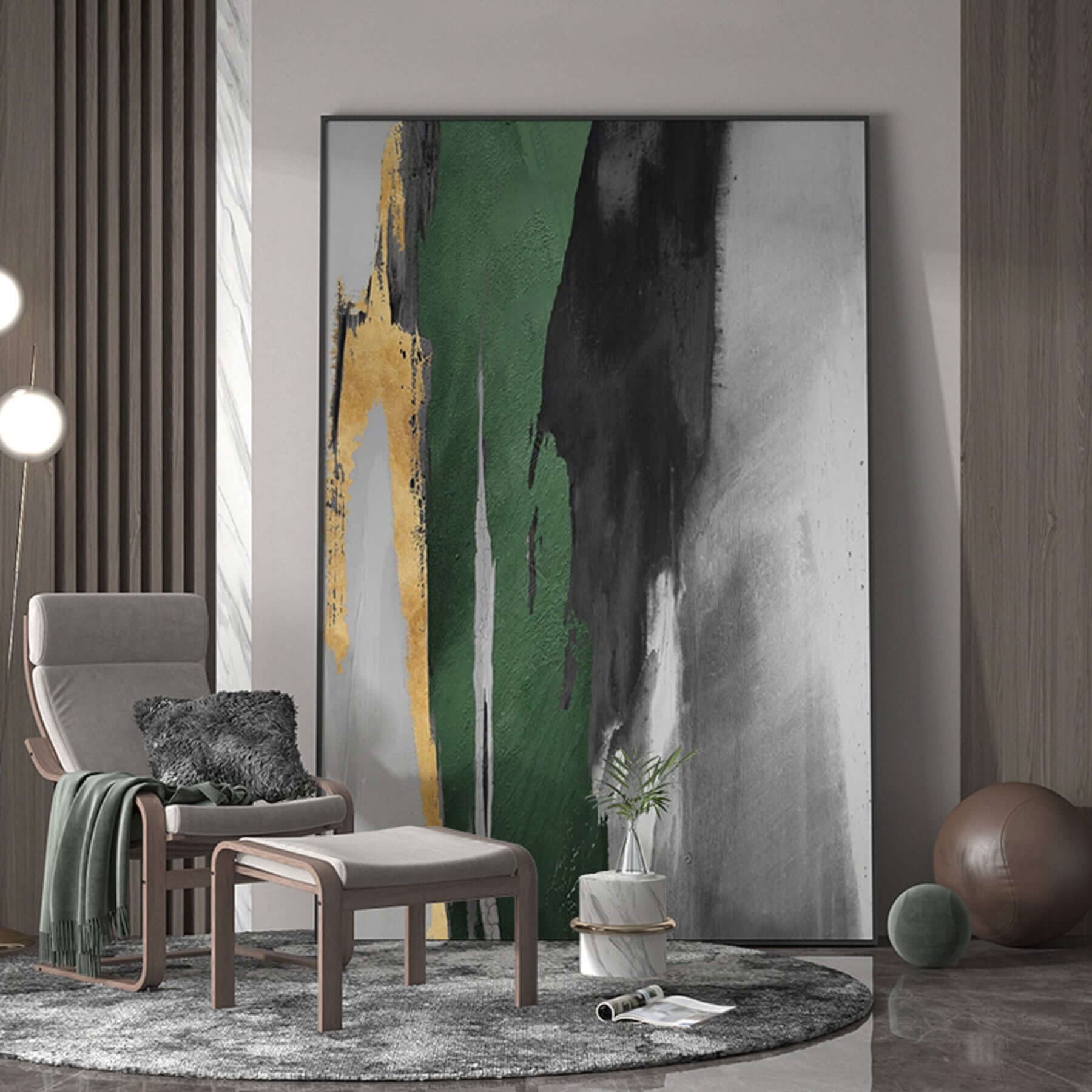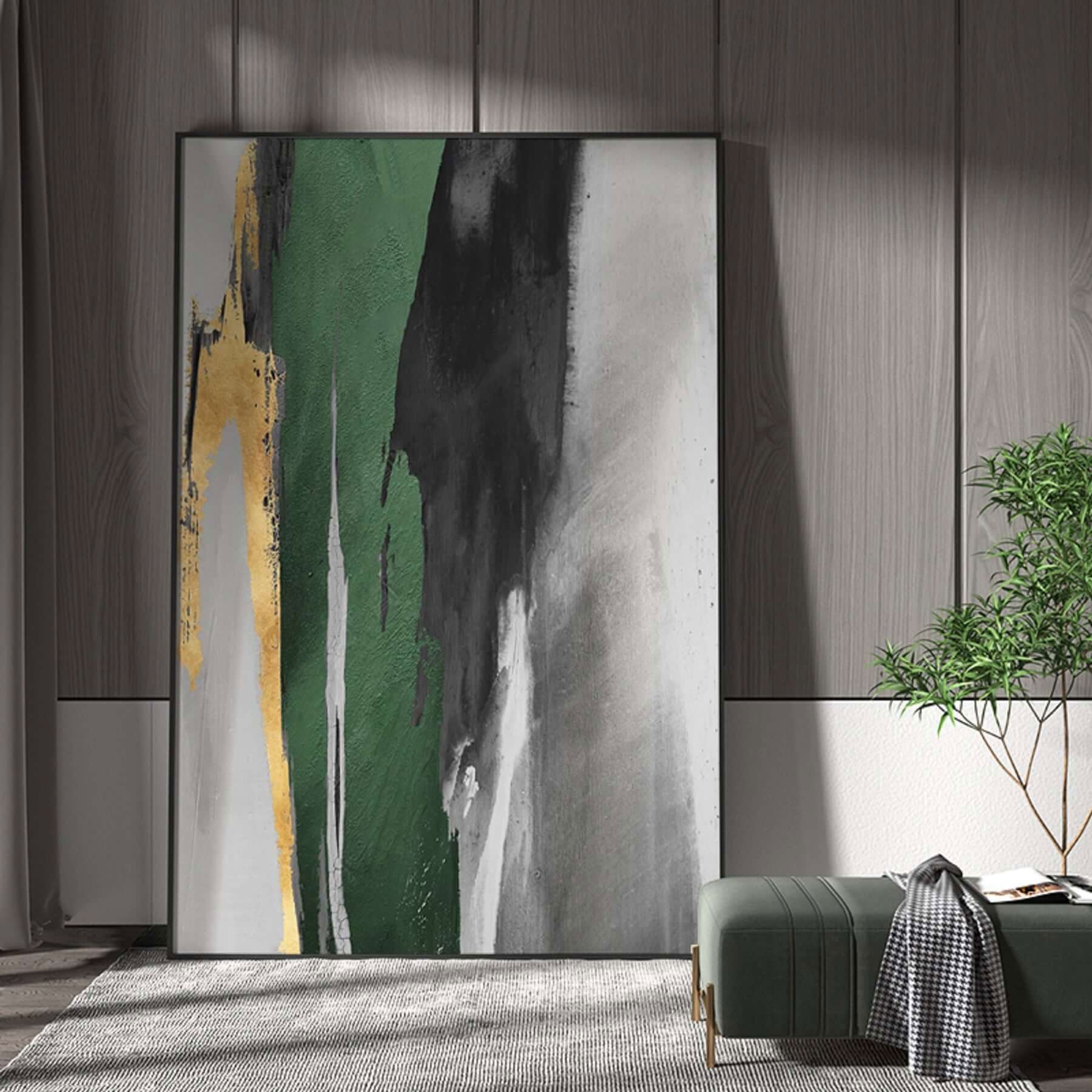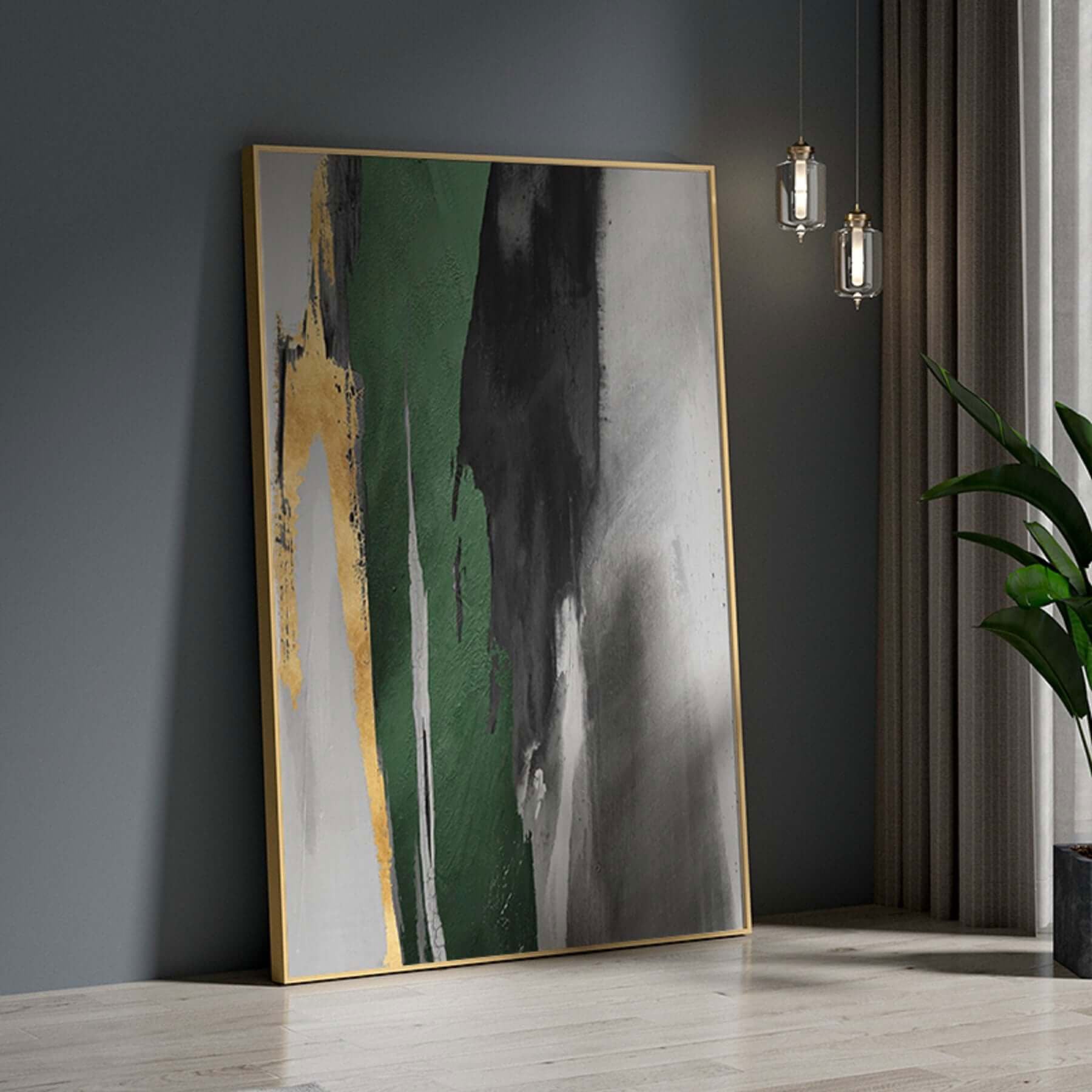 Immerse yourself in the dynamic beauty of this abstract painting. Bold strokes of green, black, and gold create a striking composition that brings a sense of modern elegance to any room