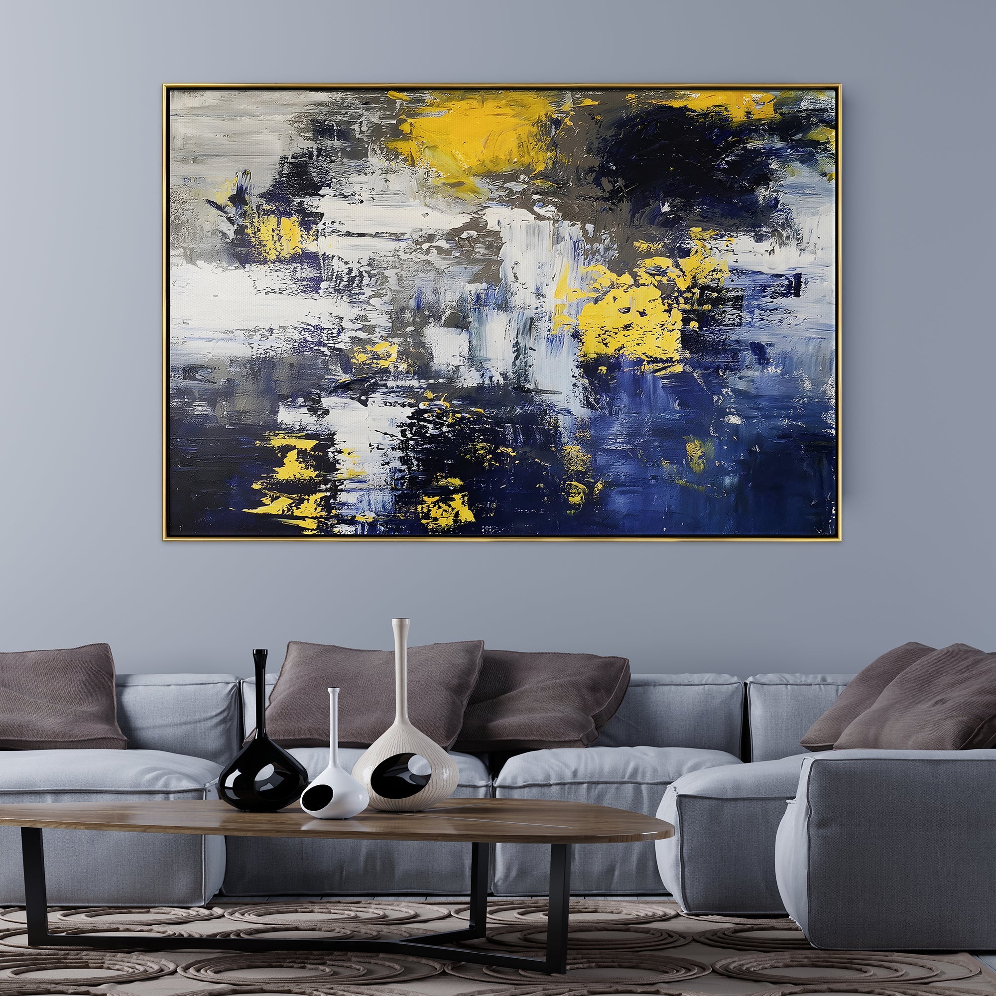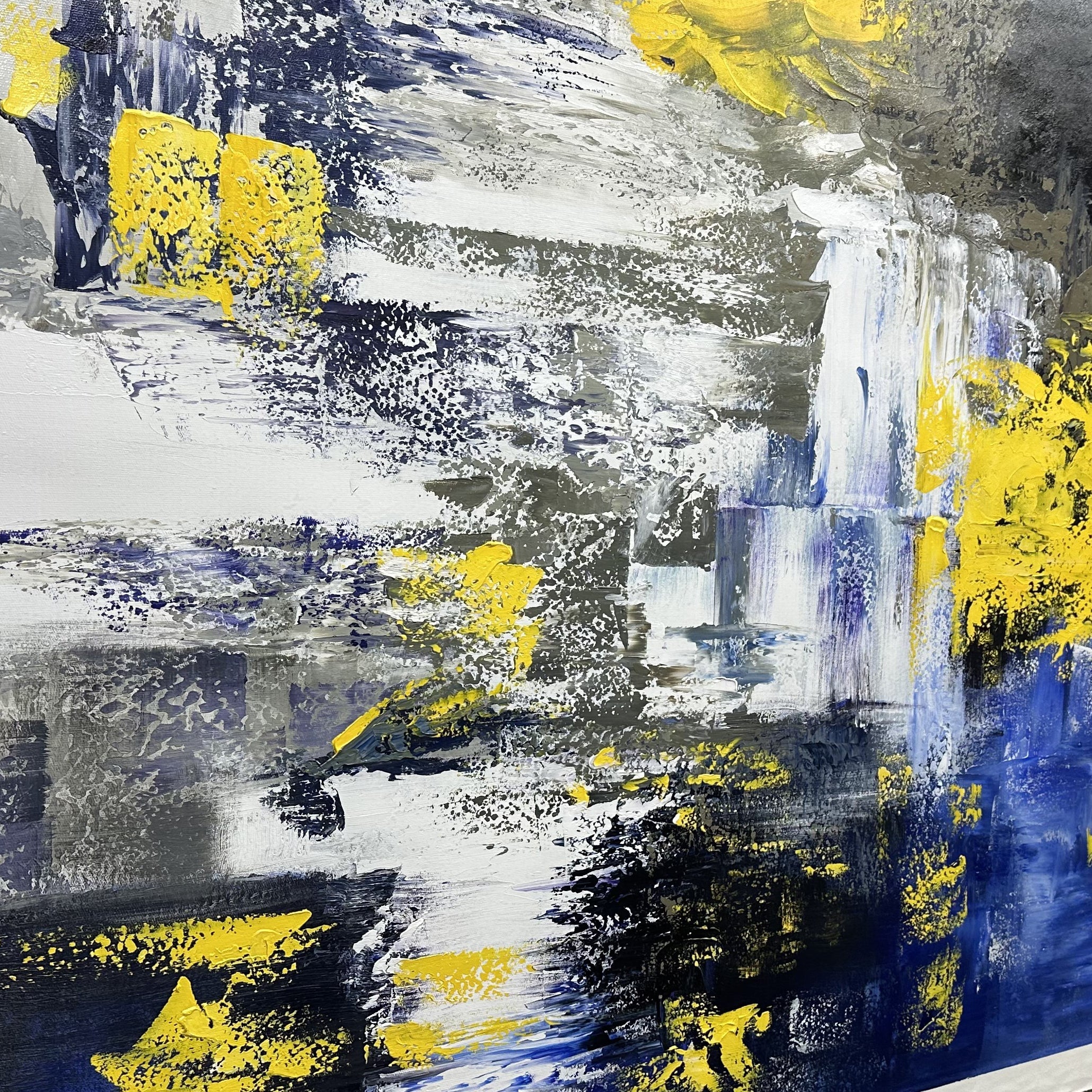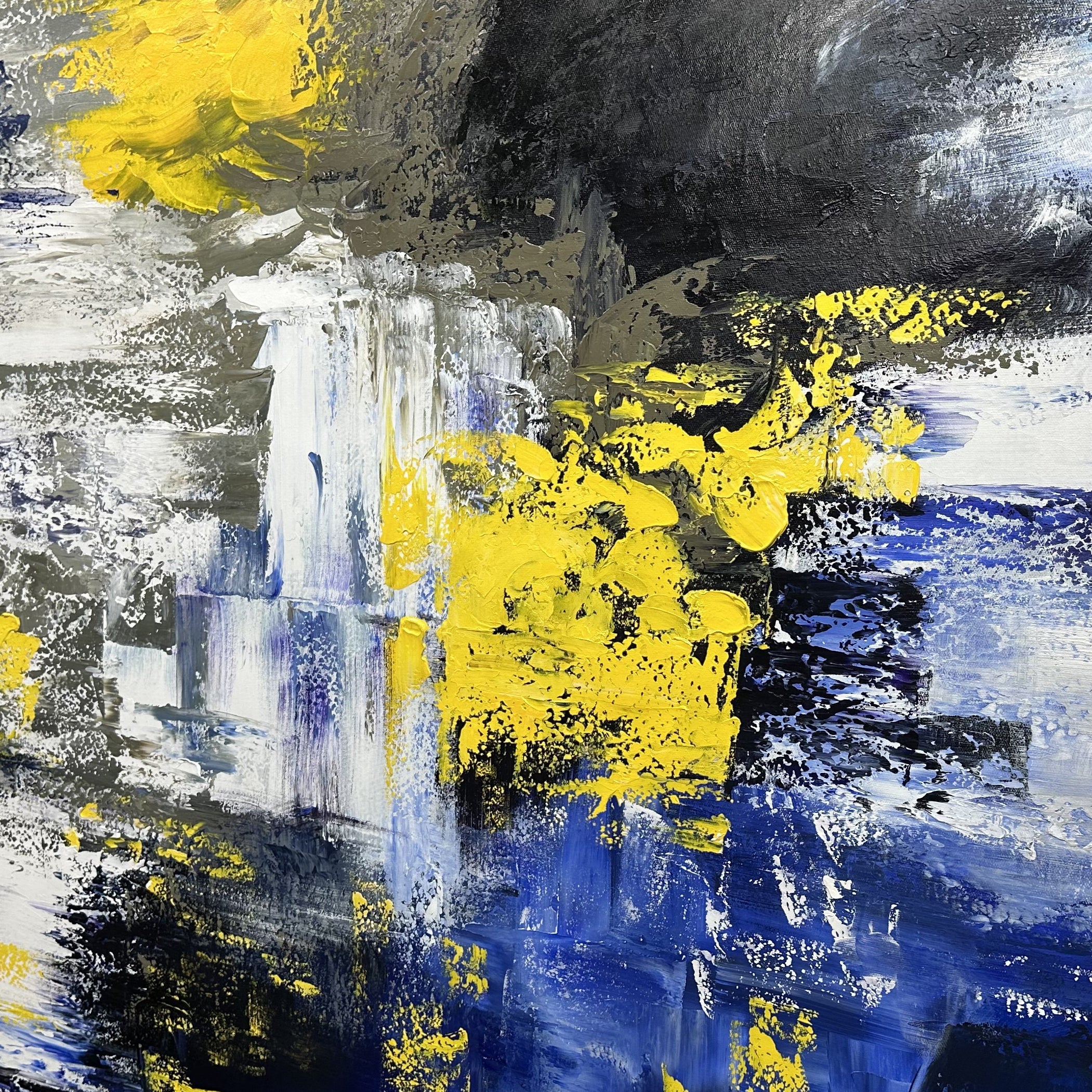 Let this painting take you by storm! It delves into the heart of a storm, delivering a vivid portrayal of chaos and beauty. Dynamic blues and yellows entwine to create a unique and exciting composition.