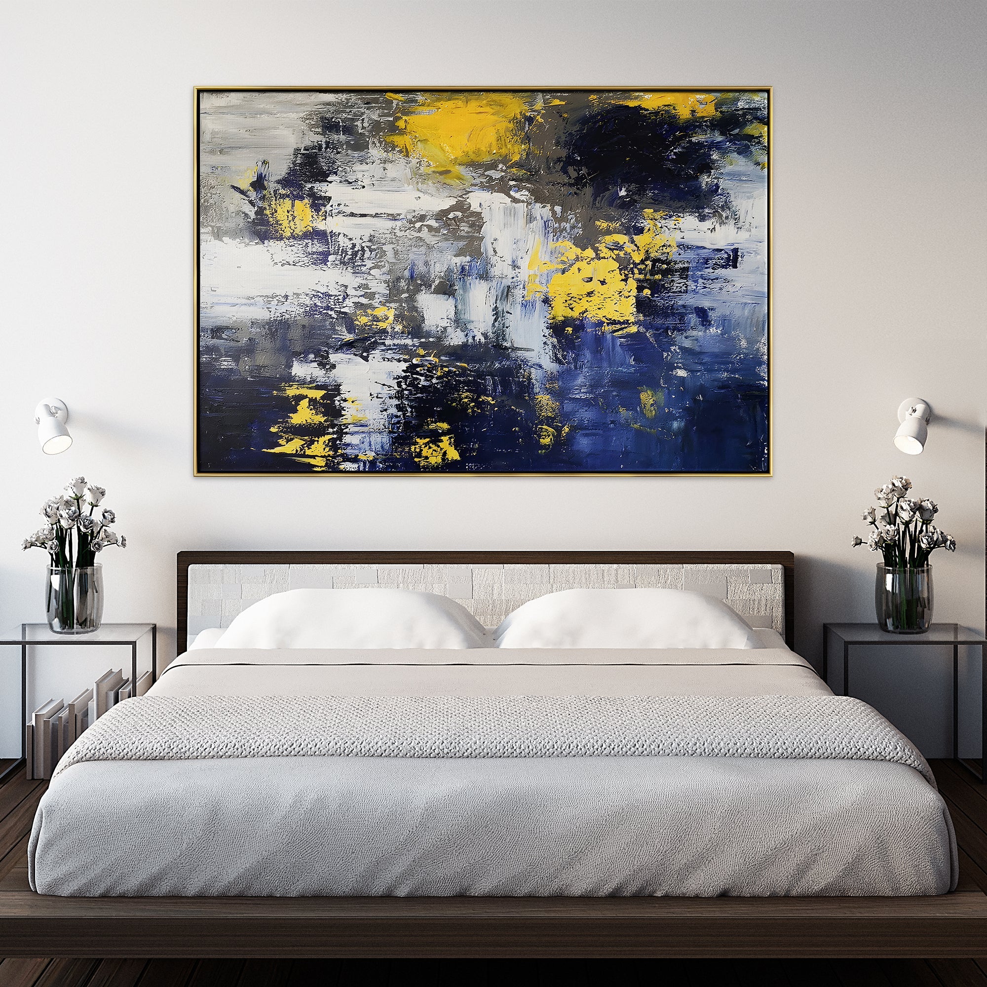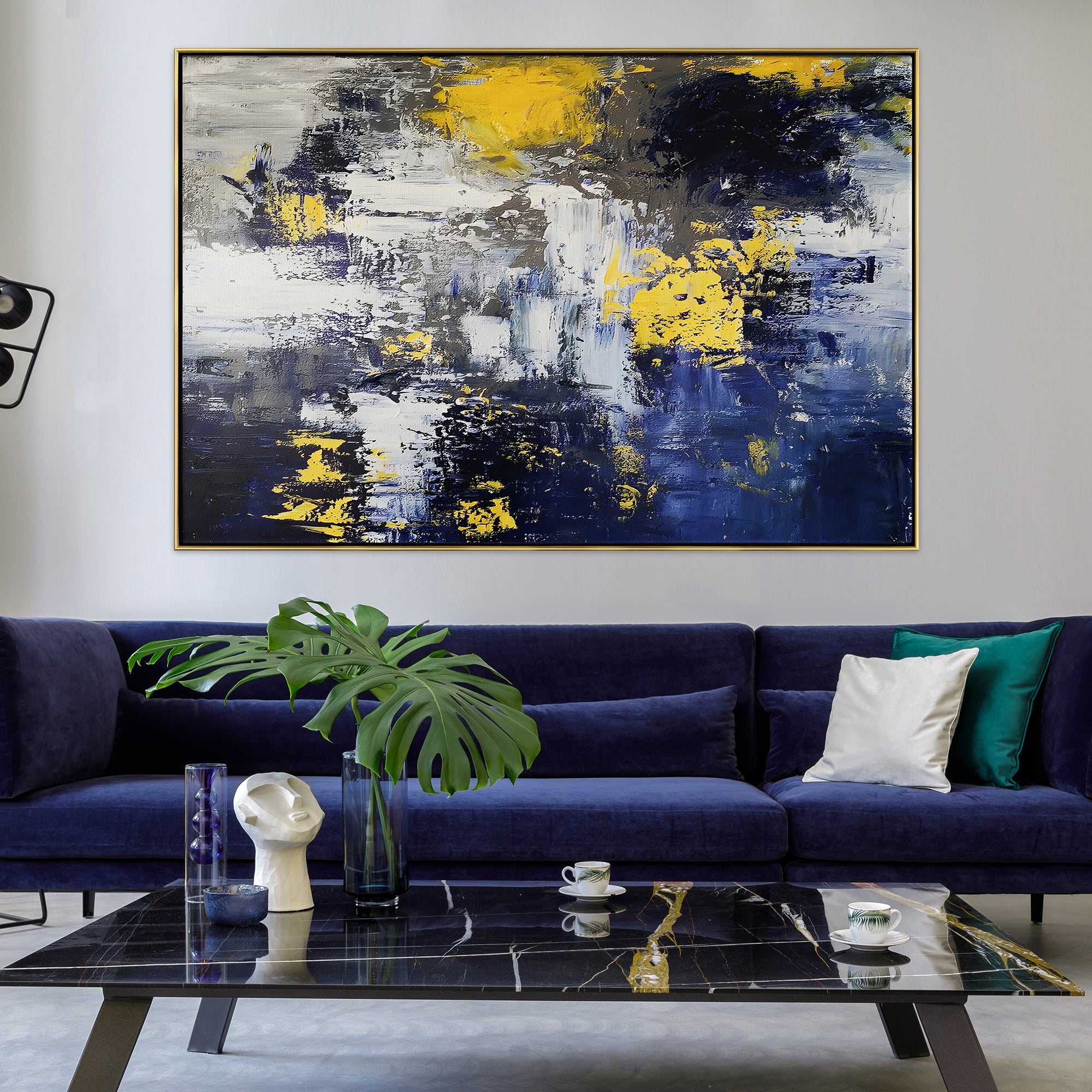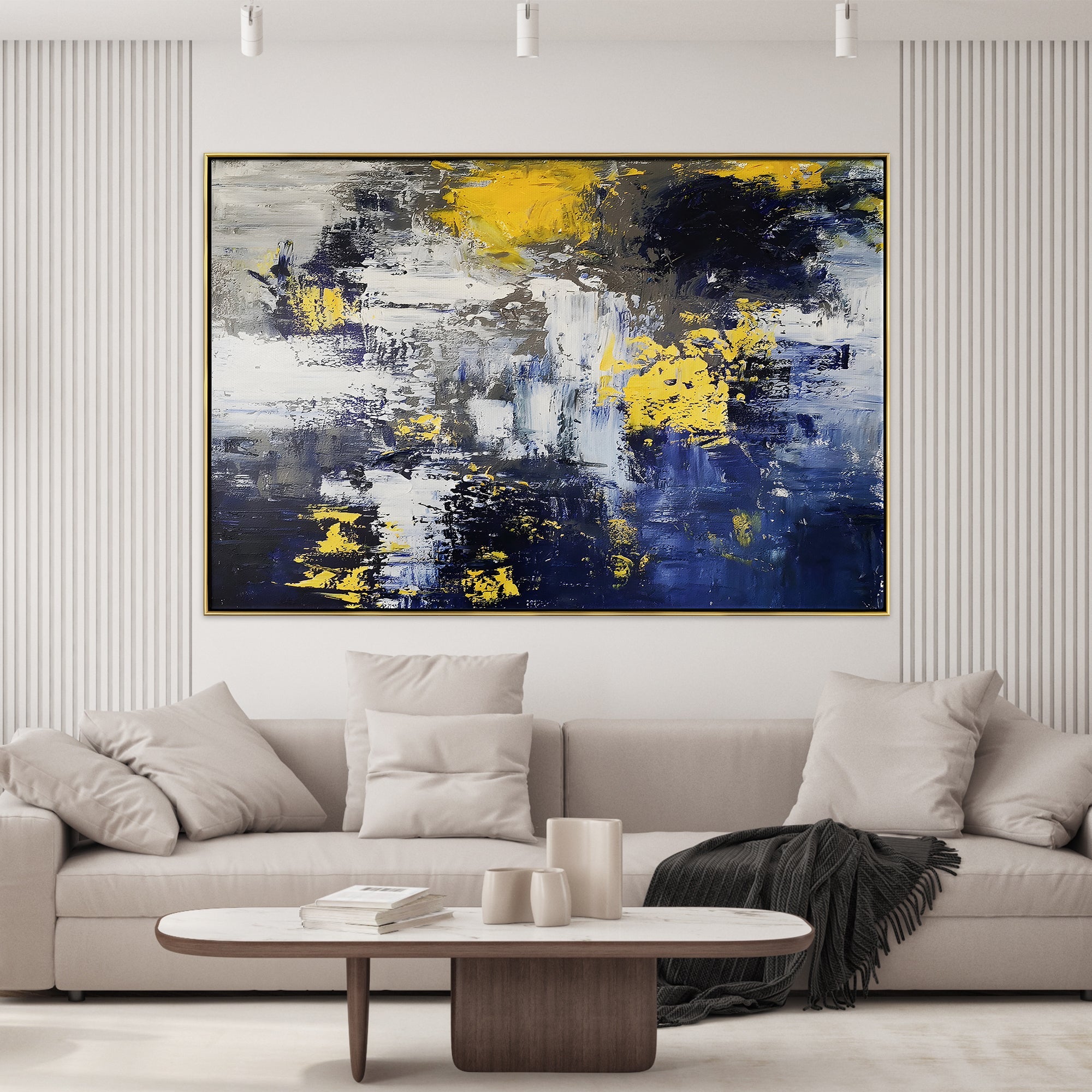 Let this painting take you by storm! It delves into the heart of a storm, delivering a vivid portrayal of chaos and beauty. Dynamic blues and yellows entwine to create a unique and exciting composition.