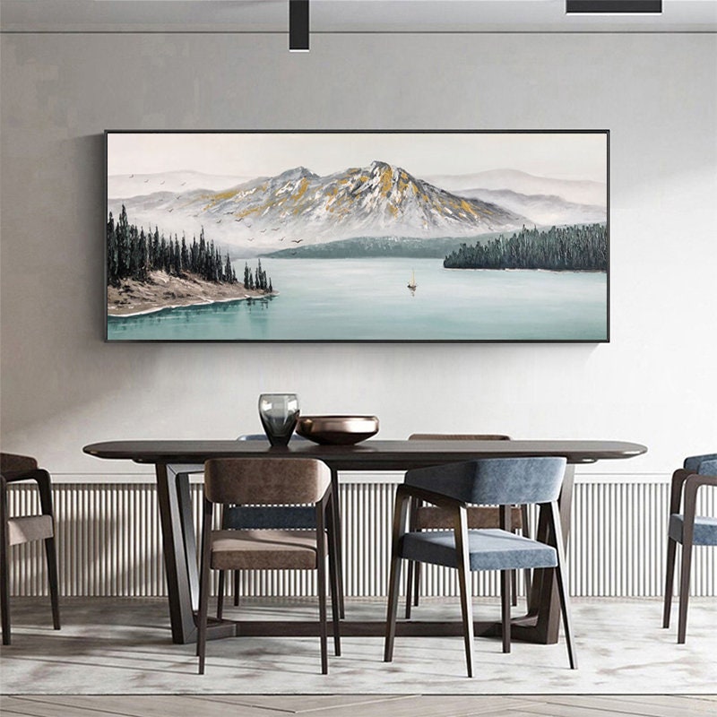 Experience the majesty of 'King Peak.' This stunning artwork showcases a majestic mountain range reflected in tranquil waters, providing a serene and sophisticated touch to any space.