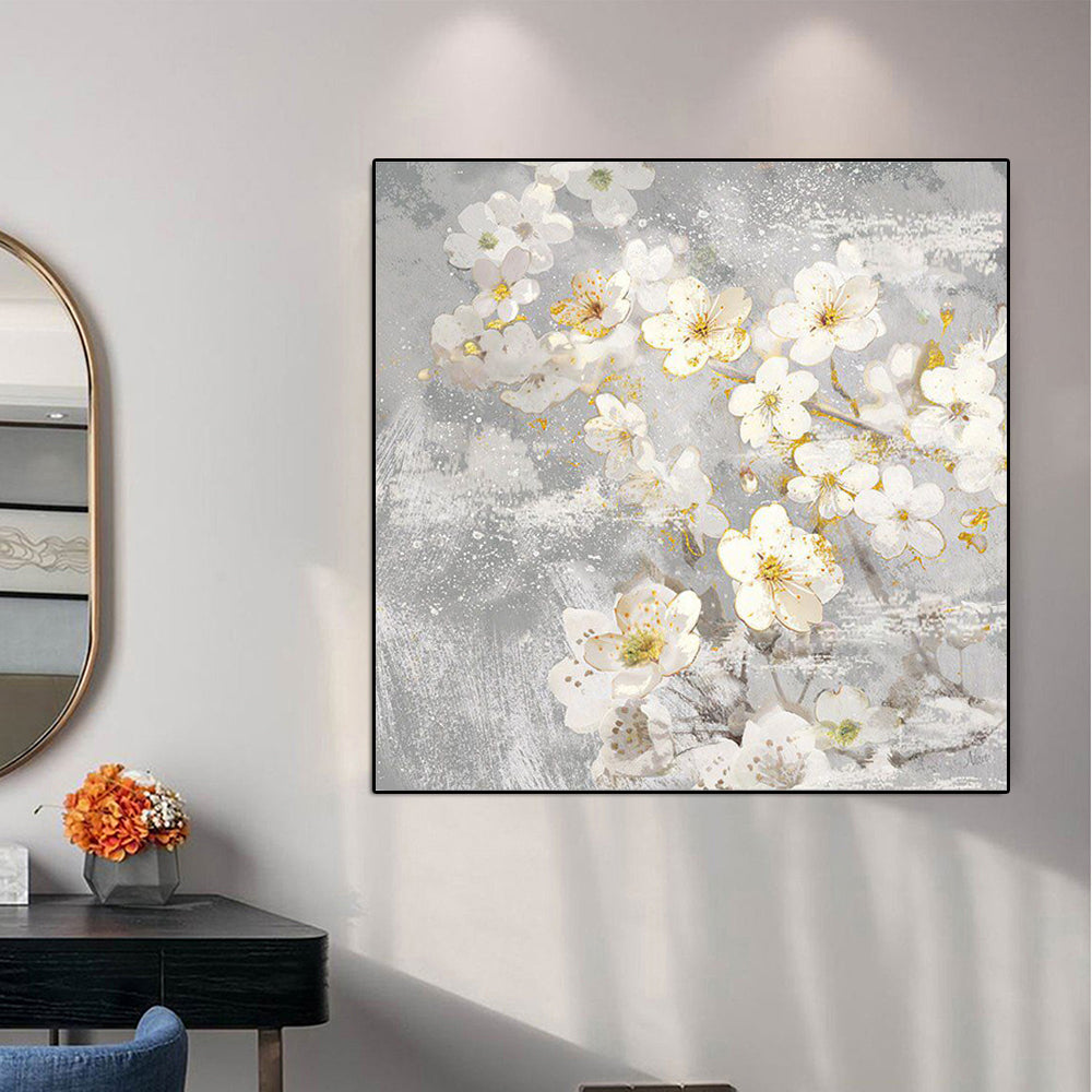 Bring a touch of winter’s magic indoors. This delicate floral painting combines light, texture, and a sprinkle of gold to create a piece that’s both calming and captivating.