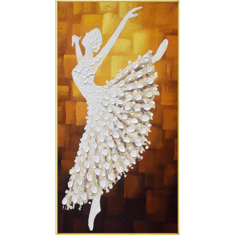 The painting depicts a ballerina dancing in front of a gold-brown background. The bold colors and beautiful brushstrokes make it one of the most beautiful pieces we've ever seen. It will give any room look a tasteful ambiance! Just stunning!
