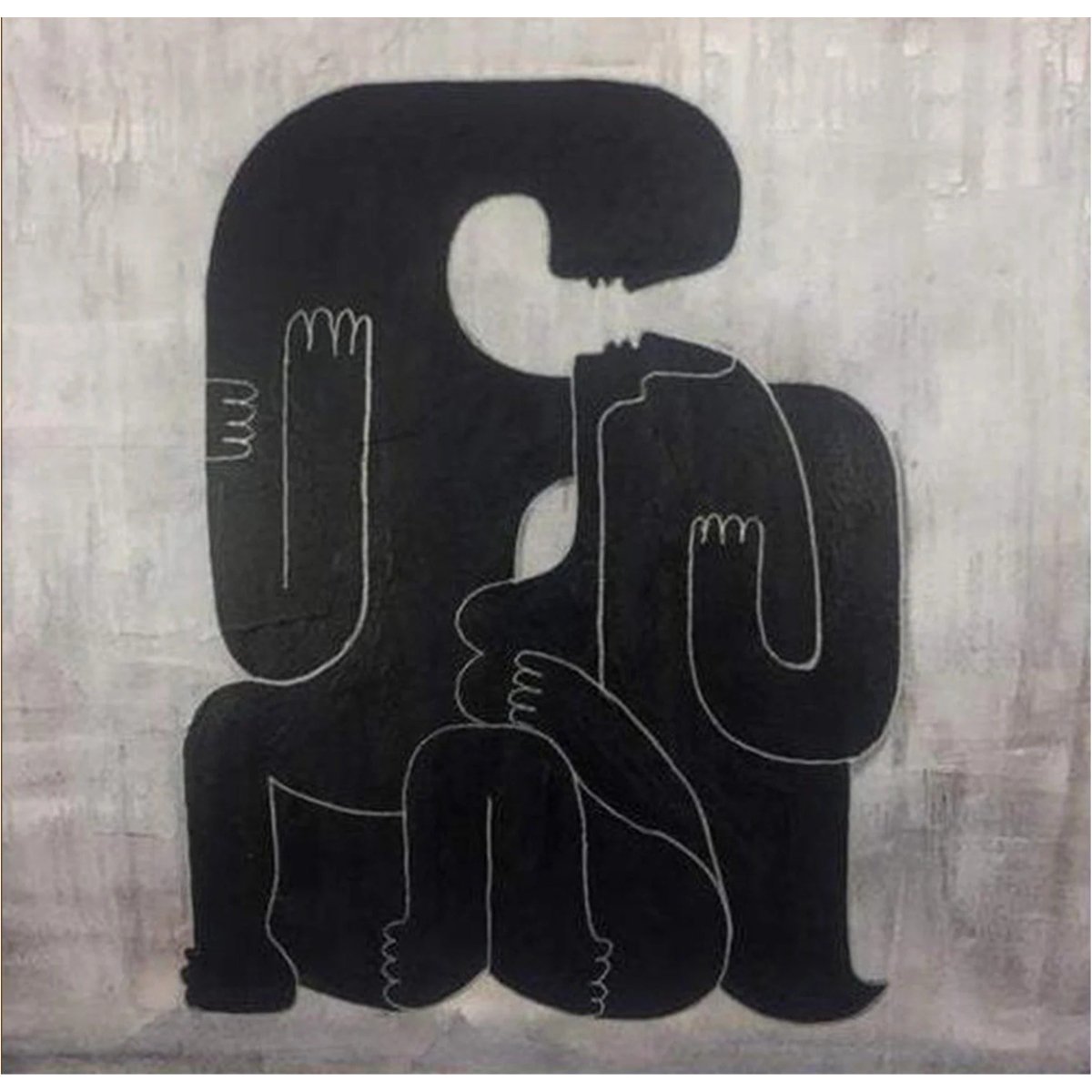 This unique black and white artwork depicts two characters hugging and almost kissing in a playful, cartoony style. Their intertwined pose captures deep love and connection, making it a perfect piece to celebrate love in any space.