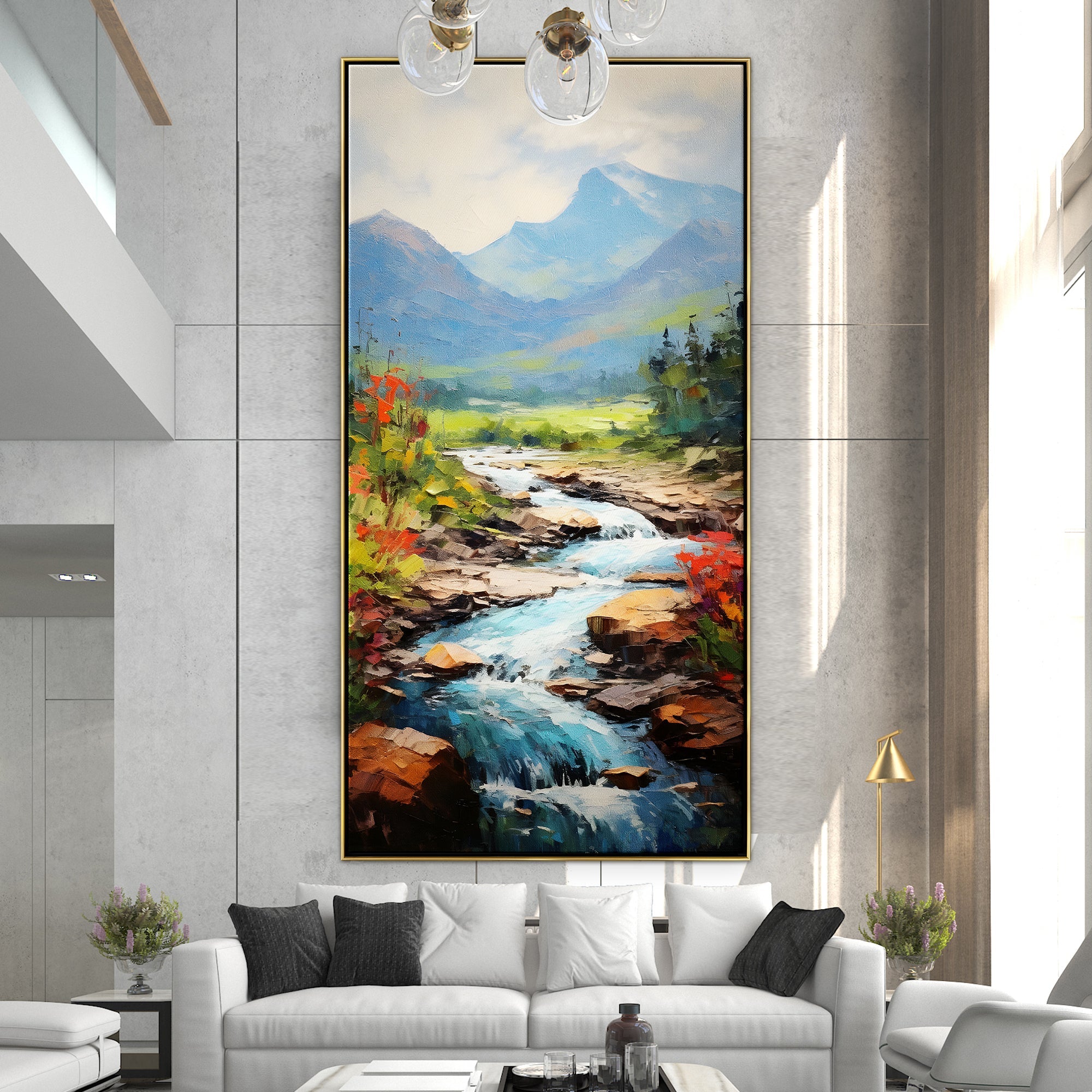 As the river gently winds its way toward the mountains, it's as though you can hear the flow of cold water. This artwork brings the soothing sound of nature into your space with a warm and cozy painting style.